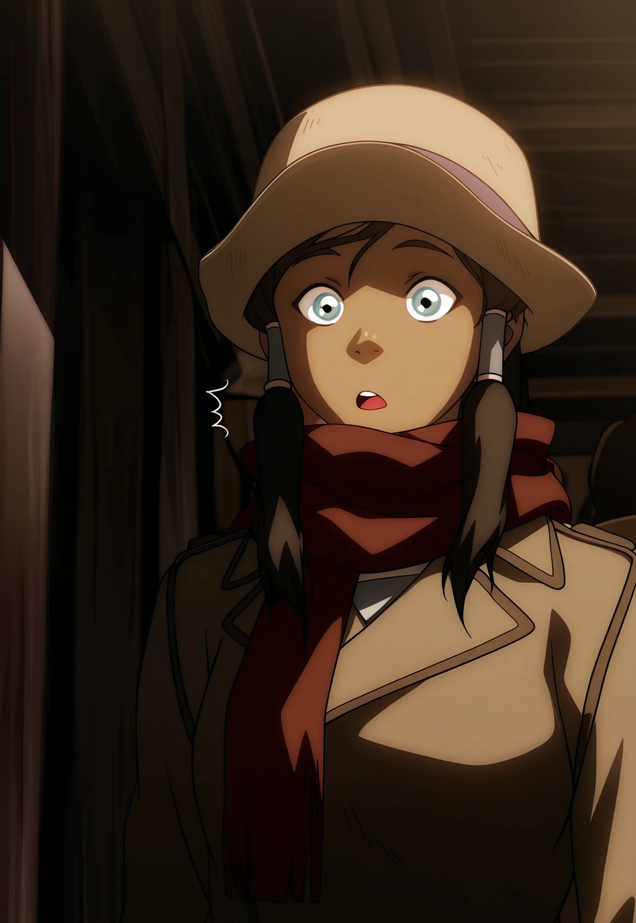 equalist meeting disguise: korra, 1girl, qmd, brown hair, hair tubes, blue eyes, coat, hat, red scarf, fur-trimmed boots