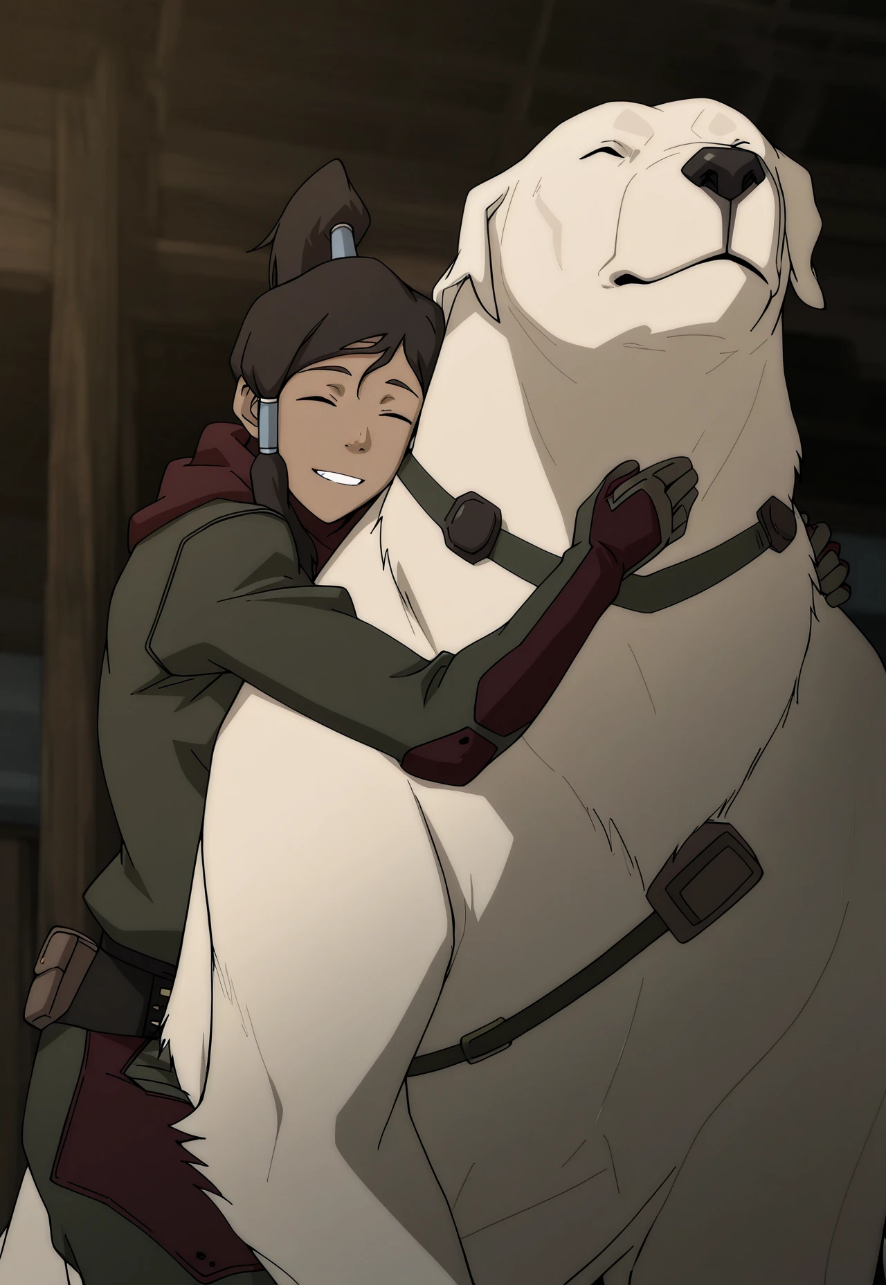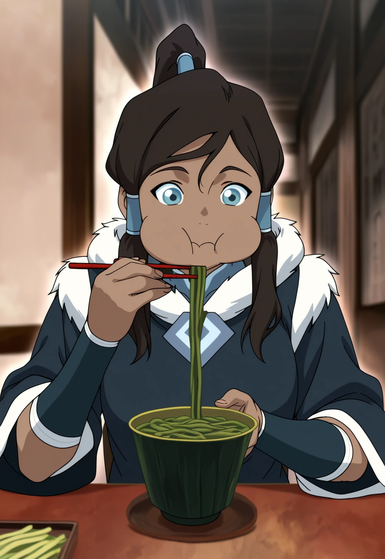 begin book 2 default outfit: korra, 1girl, b2df, brown hair, ponytail, long hair, hair tubes, dark blue sleeveless turtleneck, fur-trimmed overskirt, loincloth, fingerless gloves, pants, fur-trimmed boots