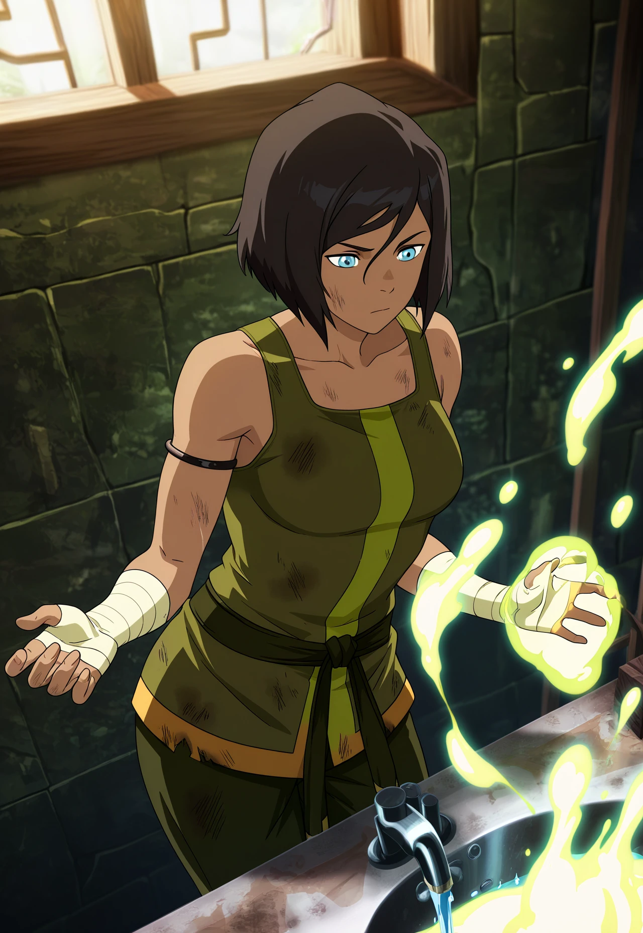 earth fighter outfit: korra, 1girl, erfi, brown hair, short hair, blue eyes, tank top, arm wrap, armlet, belt, pants, flats (hoodie, bag)