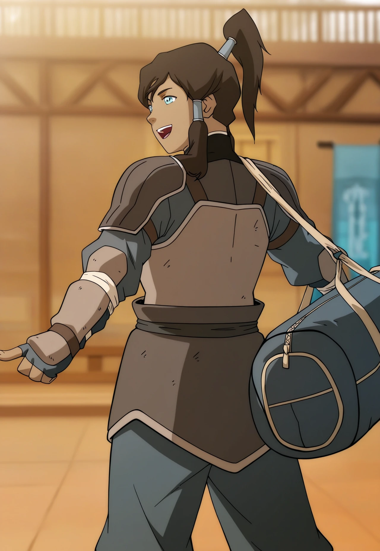 probender training outfit: korra, 1girl, pbtr, brown hair, ponytail, hair tubes, blue eyes, armor, cuirass, shoulder armor, fingerless gloves, vambraces, rerebrace, faulds, leg armor, shin guards, (shoulder bag)