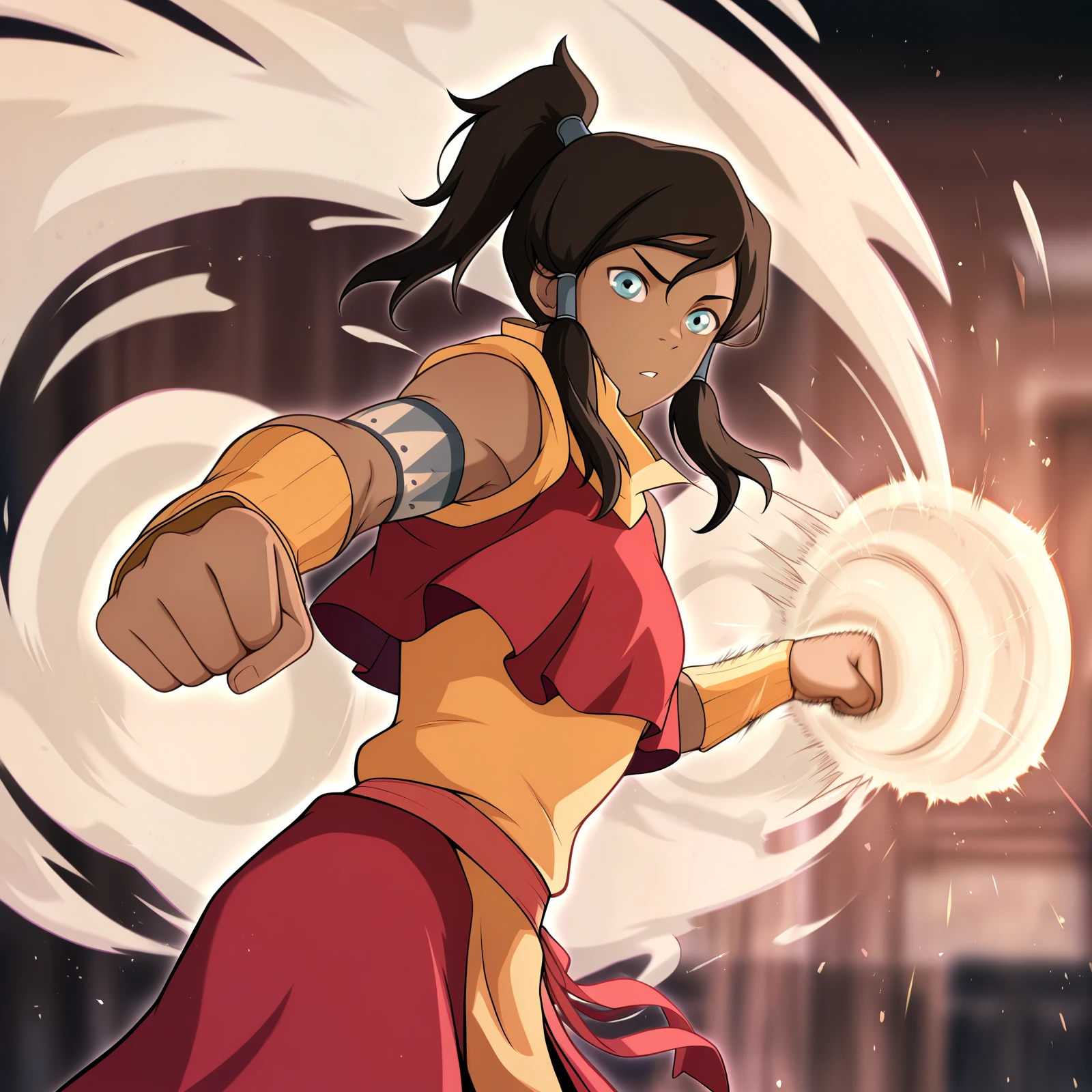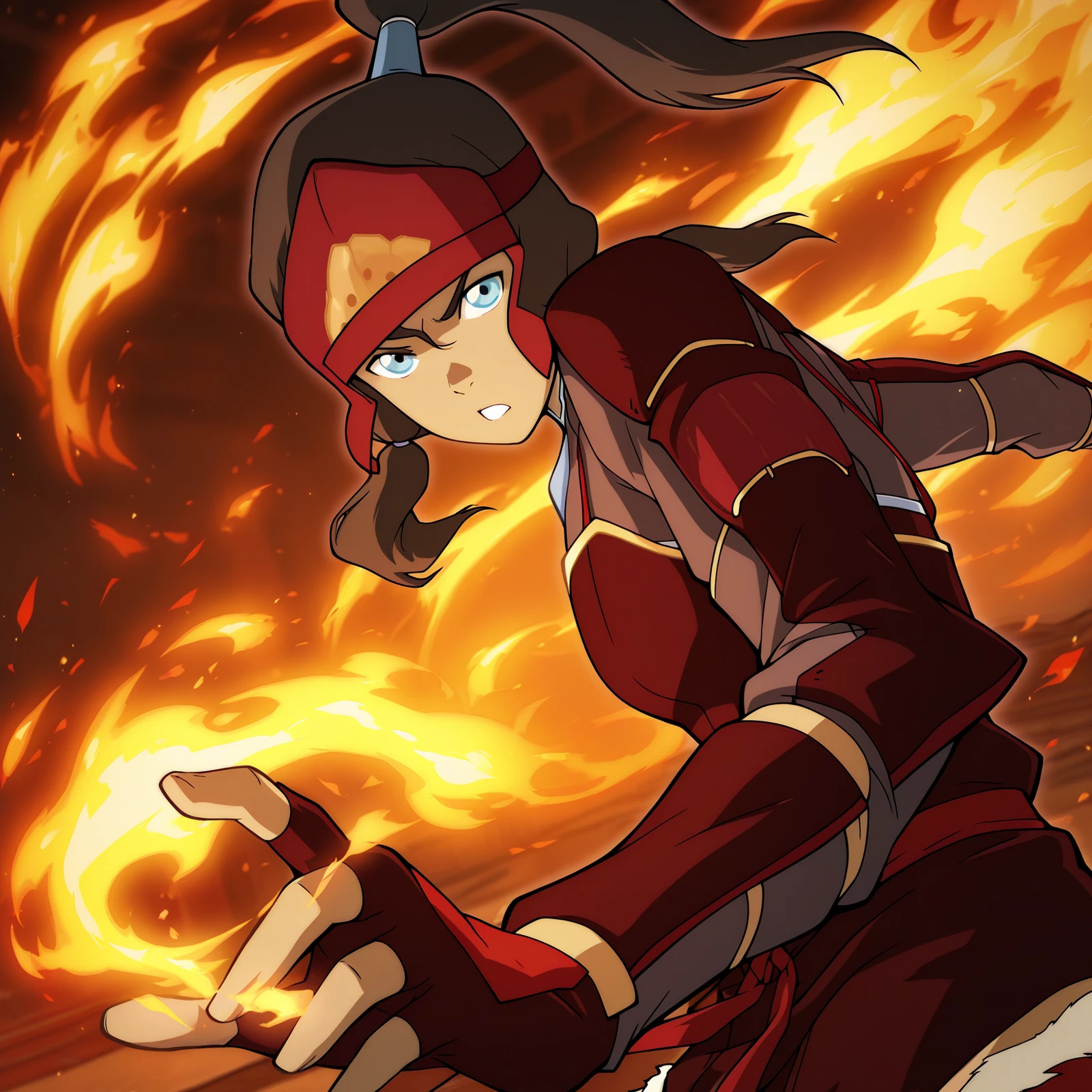 firebending training outfit: korra, 1girl, fbtr, ponytail, brown hair, hair tubes, blue eyes, armor, fingerless gloves, helmet, boots