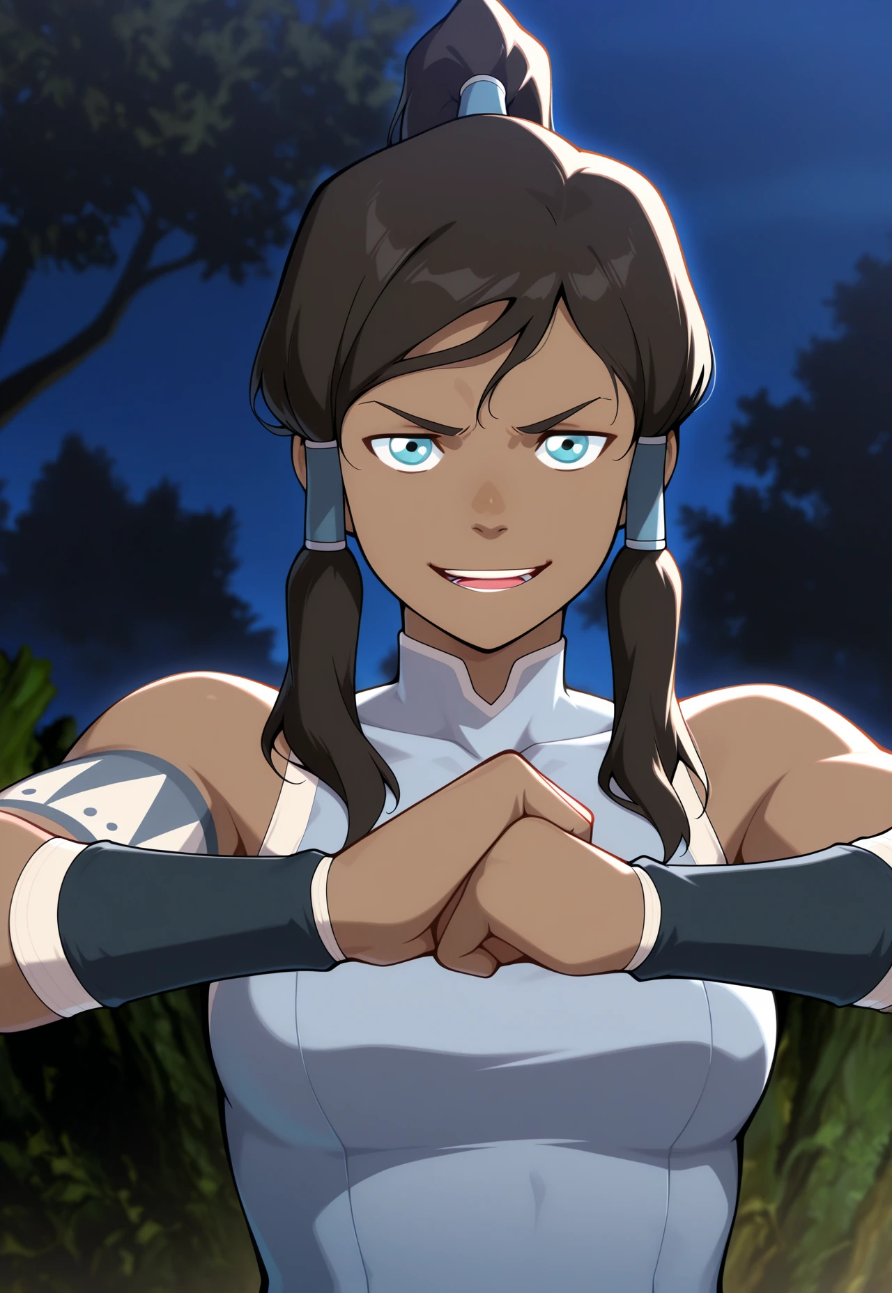 korra watching you: watchingyou, narrowed eyes, frown, \n/, leaning forward (\n/, arm under breasts, hand on own arm, frown, serious)