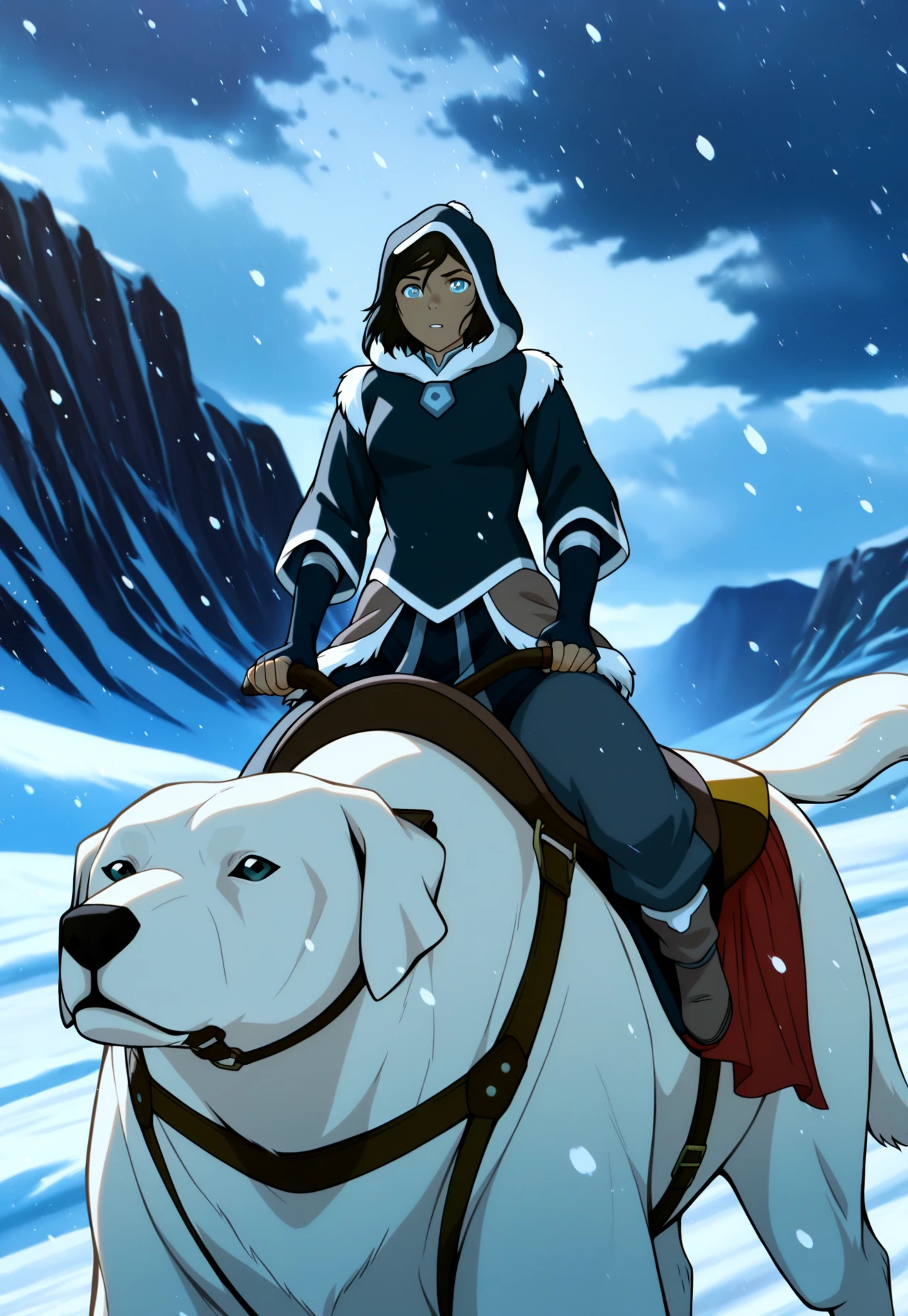 default outfit: korra, 1girl, dflt, brown hair, hair tubes, ponytail, blue eyes, light blue turtleneck, single armband, vambraces, fur-trimmed overskirt, loincloth, pants, fur-trimmed boots, (racing helmet, goggles)