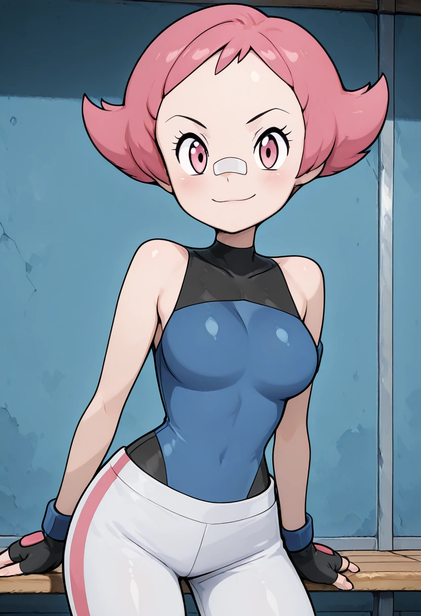 zzMaylene, pink eyes, pink hair, short hair, fingerless gloves, blue shirt, sleeveless shirt, white pants,
