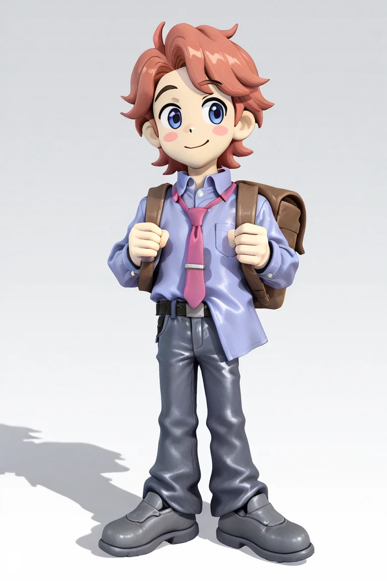 SenpaiFNFC, 1boy, light skin, blush stickers, strawberry blonde hair, wide blue eyes, partially tucked-in periwinkle blue button-up shirt, loose pink tie, grayish-purple jeans, black belt with a silver buckle, grayish-purple shoes, brown backpack, 3d render,