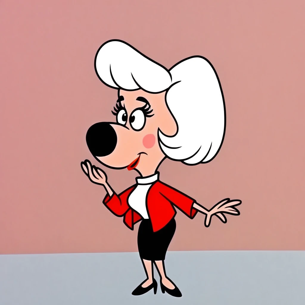 1girl, Sweet Polly Purebred, anthro female dog, furry female, white shirt, white hair, red jacket, tube skirt, heels, canine, red lips,