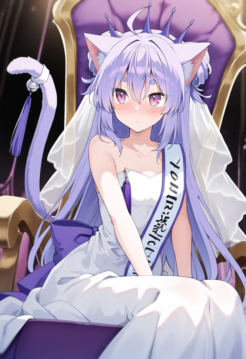 salt(divide_et_impera), 1girl, hair ornament, tiara, tail ornament, hair between eyes, very long hair, sidelocks, two side up, purple eyes, ahoge, purple hair, frills, cat ears, white dress, animal ear fluff, cat tail, strapless, sash, short eyebrows, tail ornament, tail bell, shoulder sash, double bun, thick eyebrows, frilled dress, tassel, prehensile tail, veil, strapless dress, evening gown, long dress, purple tiara, holding staff,