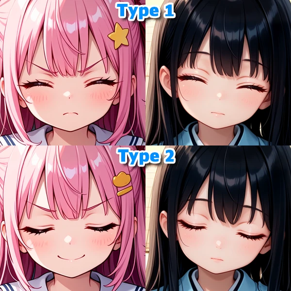 When closed eyes prompt is used to produce a closed eyes expression, you can fix the curve shape of eyes with these LoRAs.