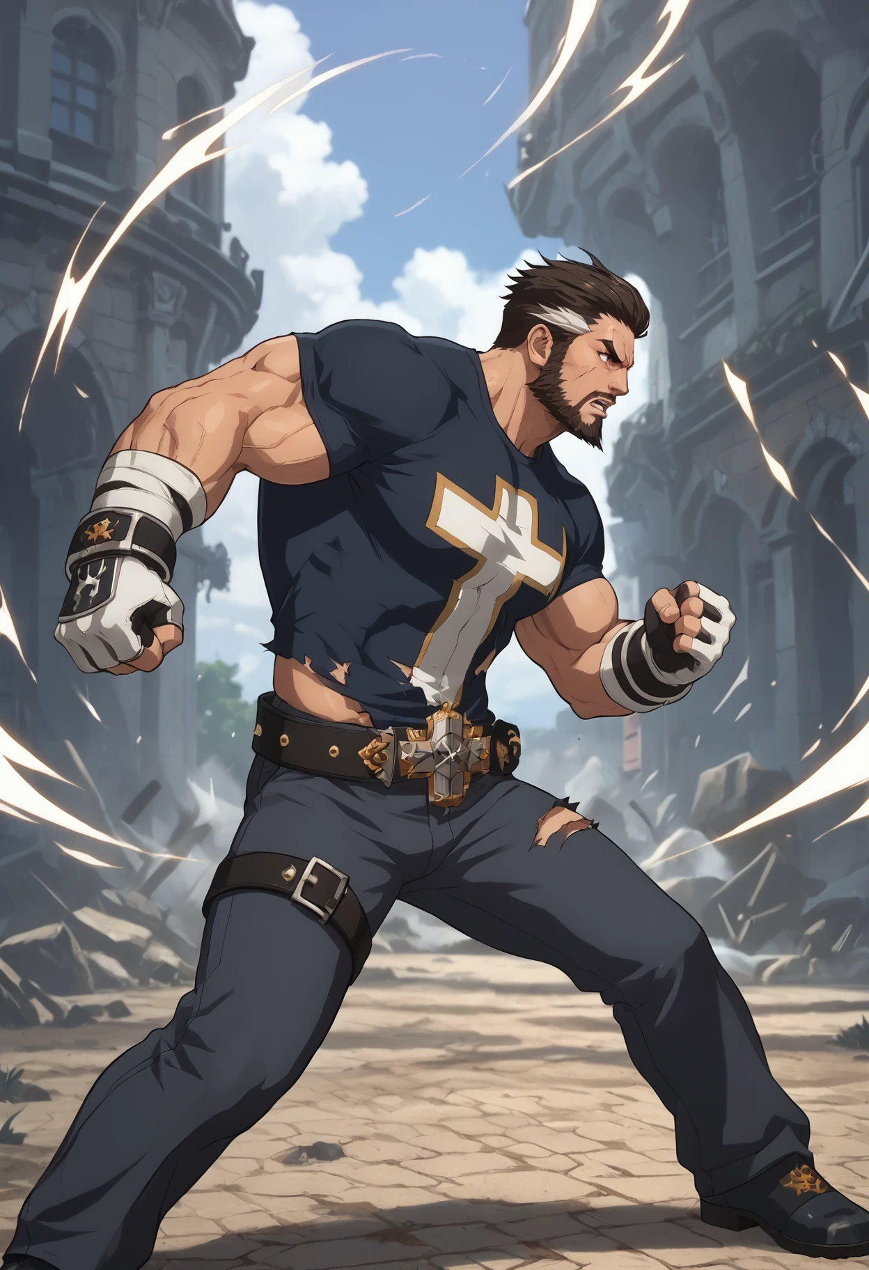 Additional tags: bara, muscular male, beard, multicolored hair, pants, shirt, jacket, gloves, bandages, belt, jacket on shoulders, torn clothes, scar on face, fighting stance, punching