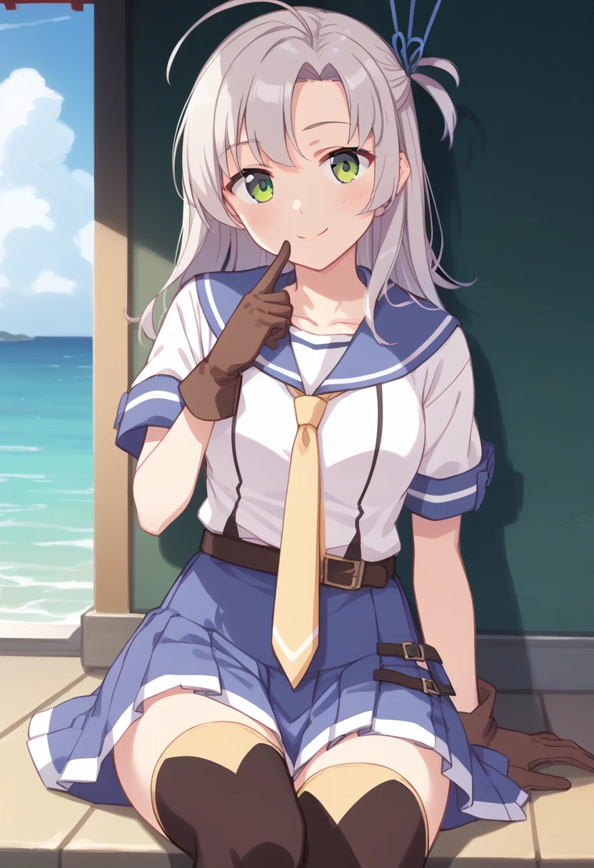 grey hair, hair tie, green eyes, blue sailor collar, serafuku, yellow necktie, brown gloves, belt, skirt, black thighhighs