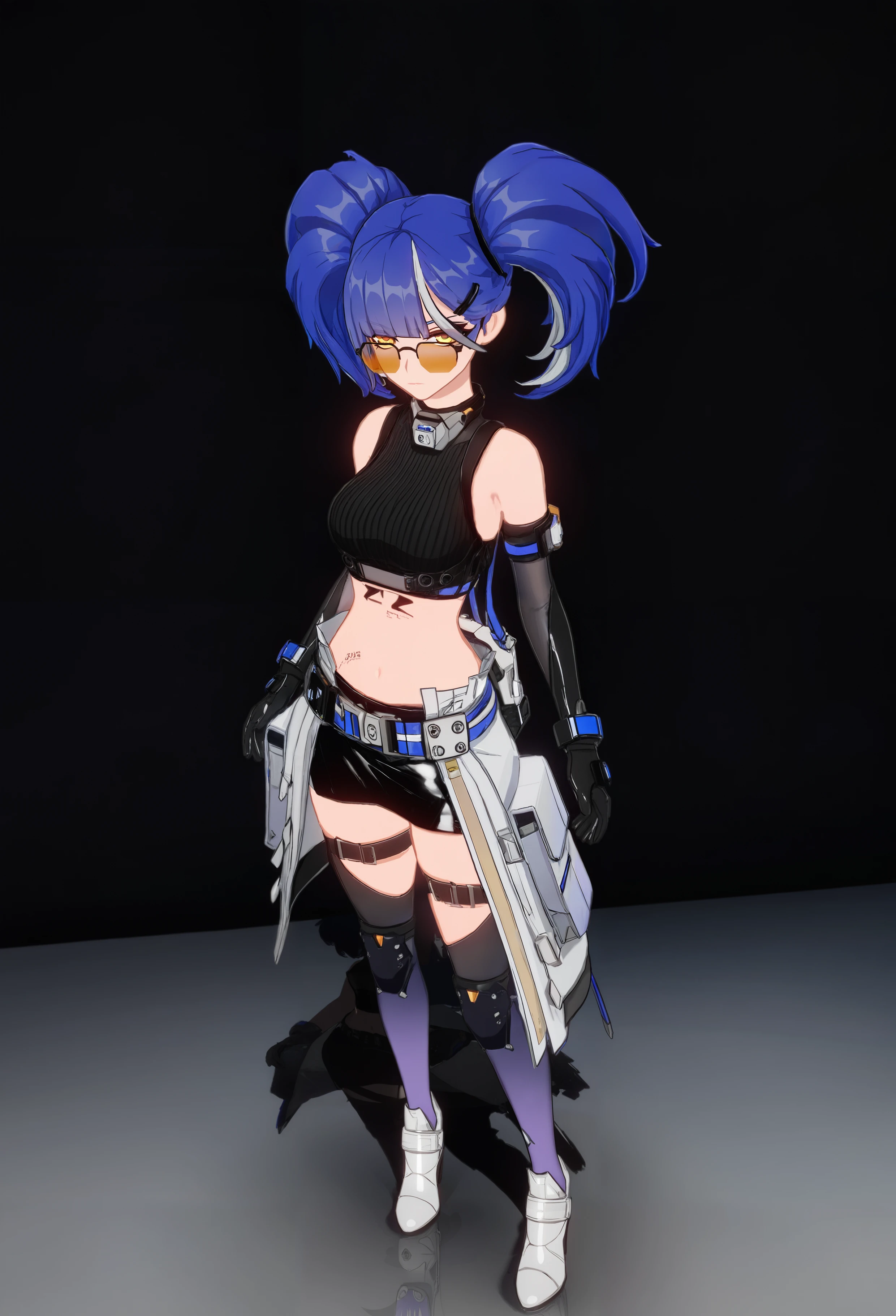 1girl, solo, bare shoulders, sleeveless, gloves, tinted eyewear, sunglasses, crop top, elbow gloves, black gloves, bangs, glasses, shirt, midriff, orange-tinted eyewear, hair ornament, breasts, belt, shorts, thighhighs, navel, sleeveless shirt, black shirt, skirt, white footwear, thigh strap, blunt bangs, black thighhighs, shoes, yellow eyes, hairclip