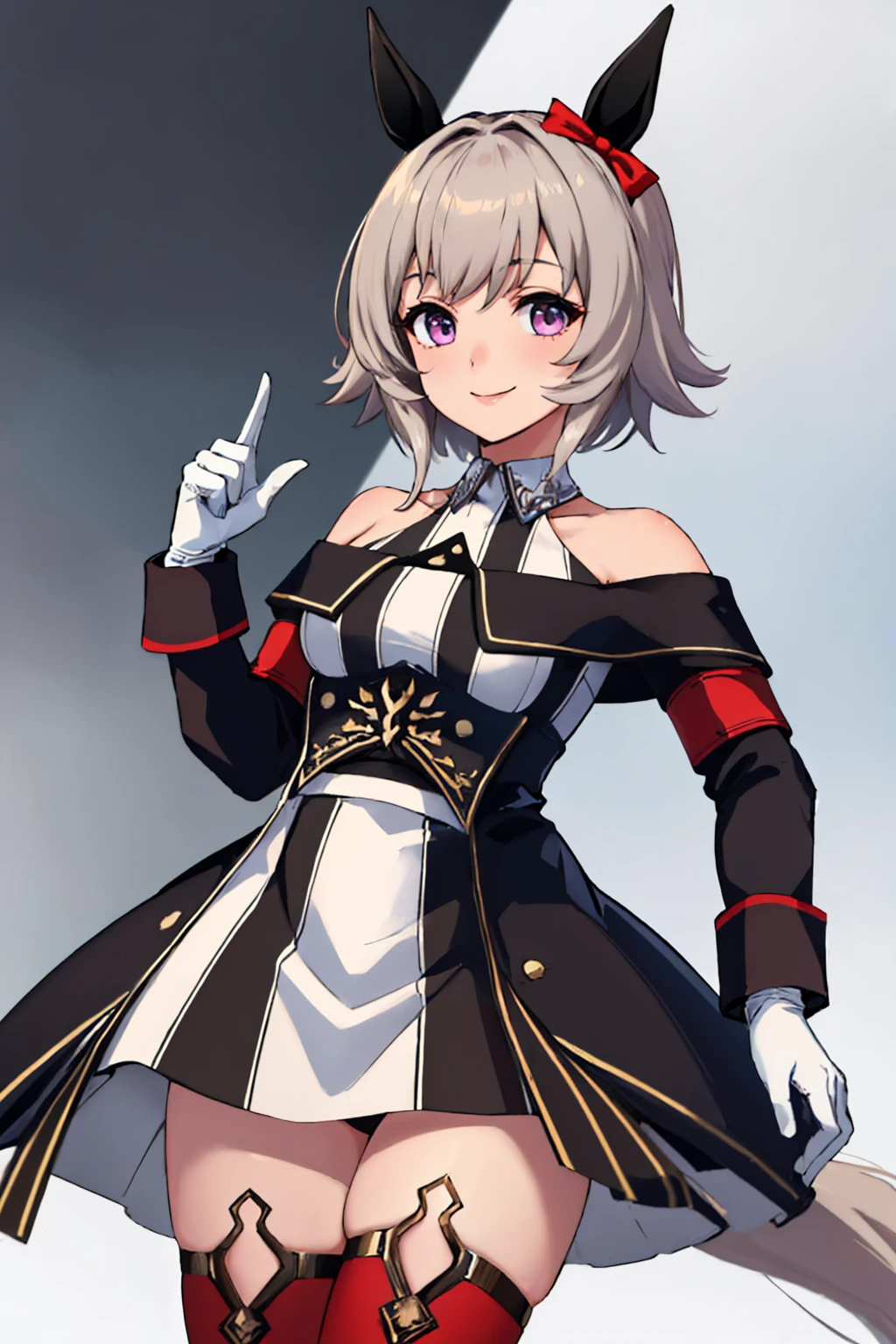 Default Outfit: off-shoulder jacket, long sleeves, striped dress, white gloves, red thighhighs, bare shoulders