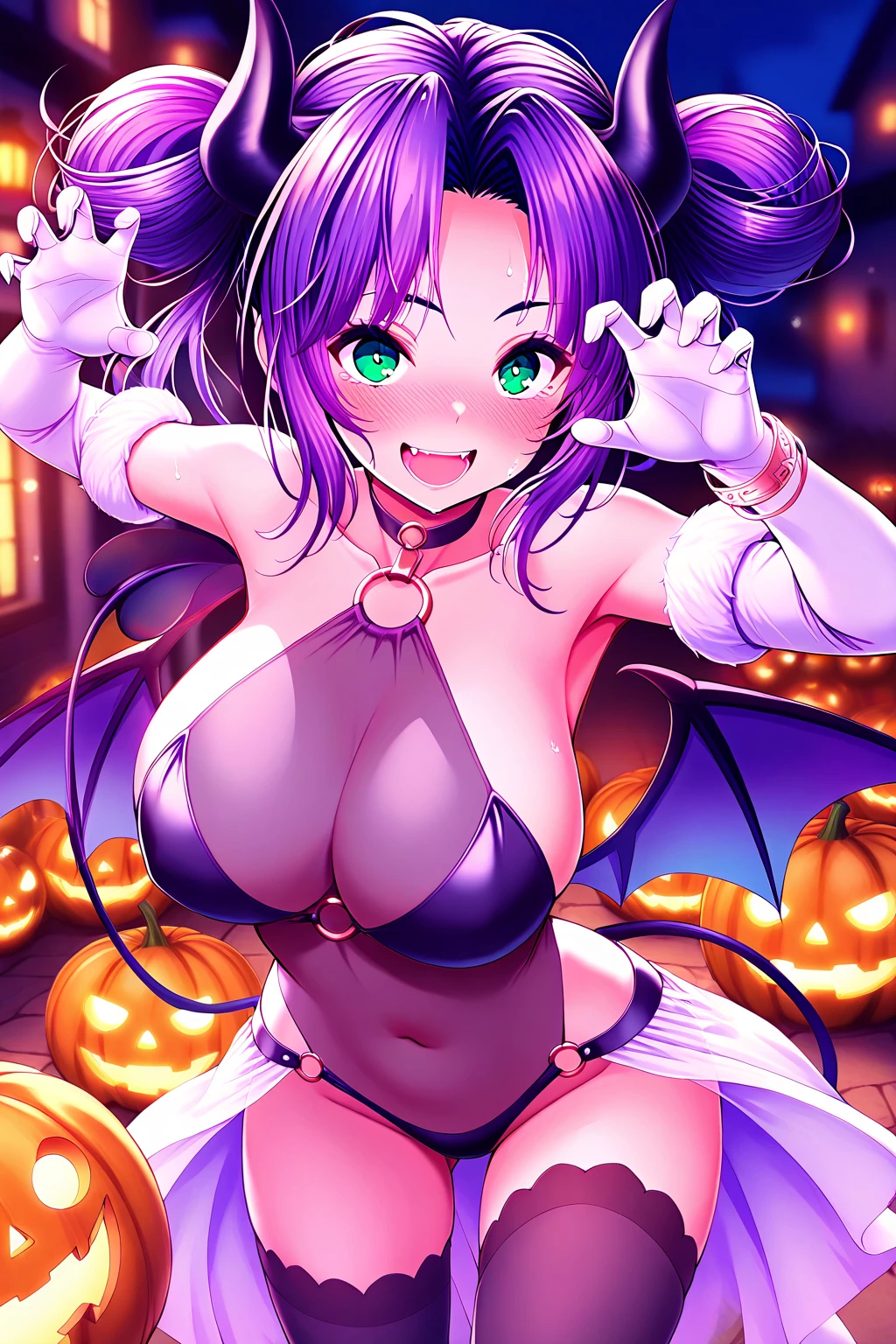 iolink_sakura, 1girl, breasts, solo, green eyes, purple hair, twintails, hair bun, double bun, large breasts, bare shoulders, iolink_sakura's demon girl outfit, demon tail, demon wings, demon horns, white elbow gloves, jewelry, bracelet, collarbone, o-ring, thighhighs, see-through, navel,