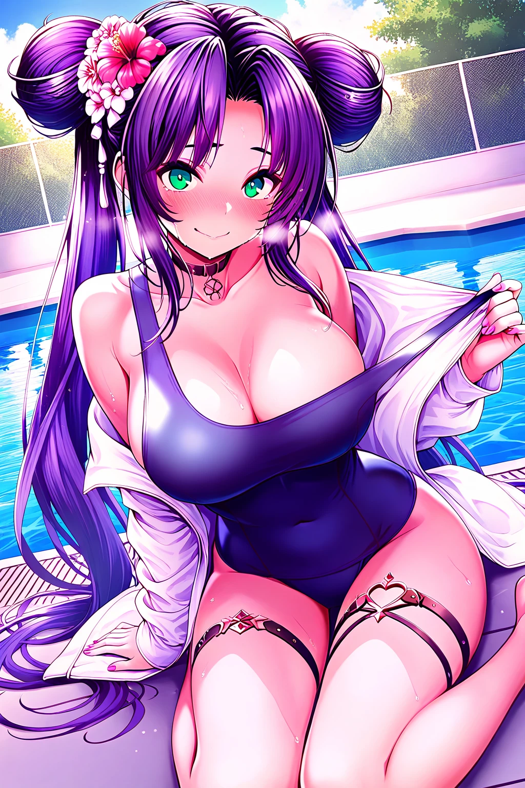 iolink_sakura, 1girl, breasts, solo, green eyes, purple hair, long hair, twintails, hair bun, double bun, large breasts, iolink_sakura's swimsuit outfit, hair flower, choker, bare shoulders, off shoulder, white jacket, open jacket, deep blue school swimsuit, collarbone, cleavage, single thigh strap, sandals,