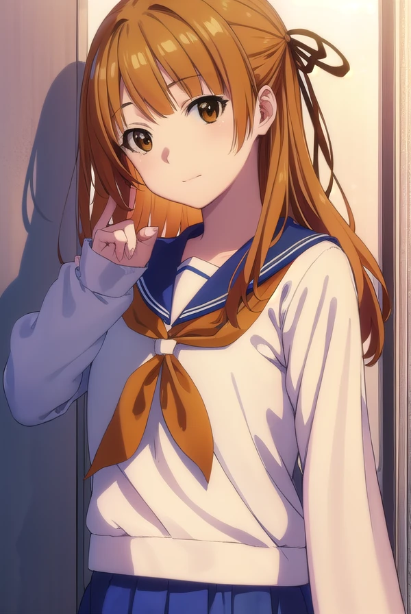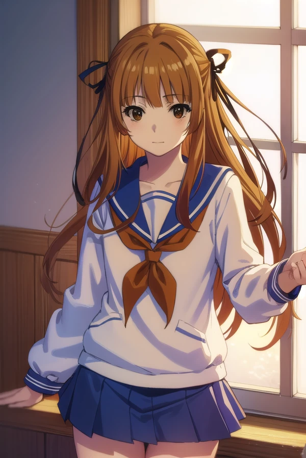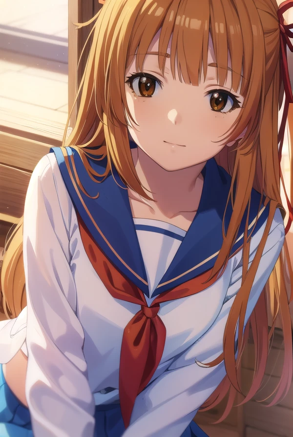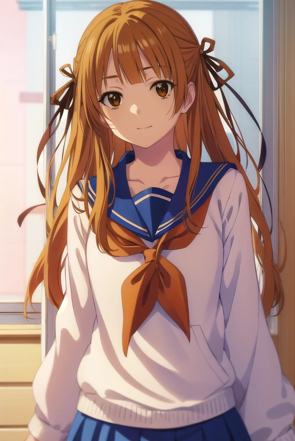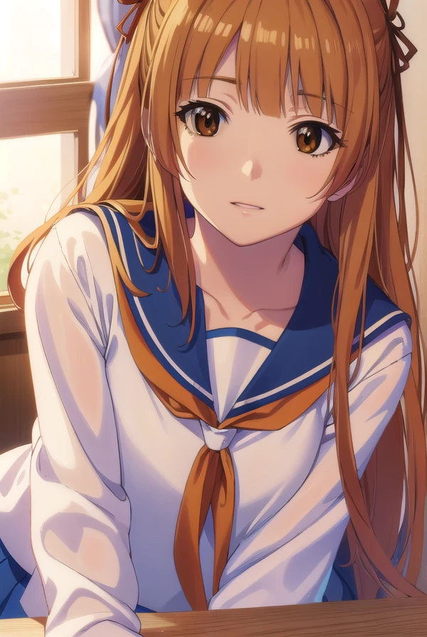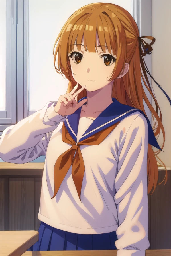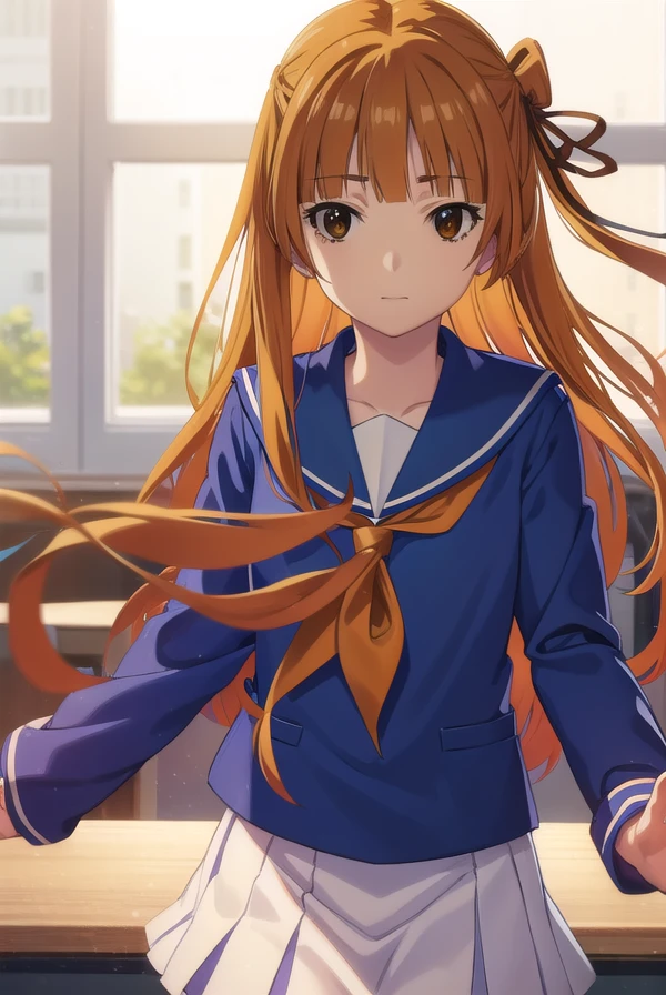 akemi sumizome, long hair, orange hair, (brown eyes:1.7), ribbon, hair ribbon, bangs, blunt bangs, hime cut,