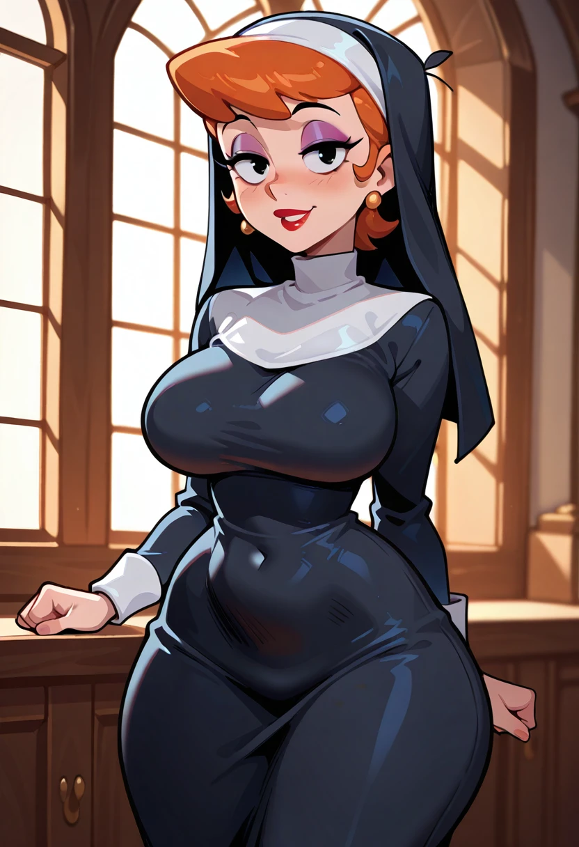 Appearance: dextersmom, mature female, short orange hair, black eyes, large breasts, thick thighs, wide hips, makeup, lipstick