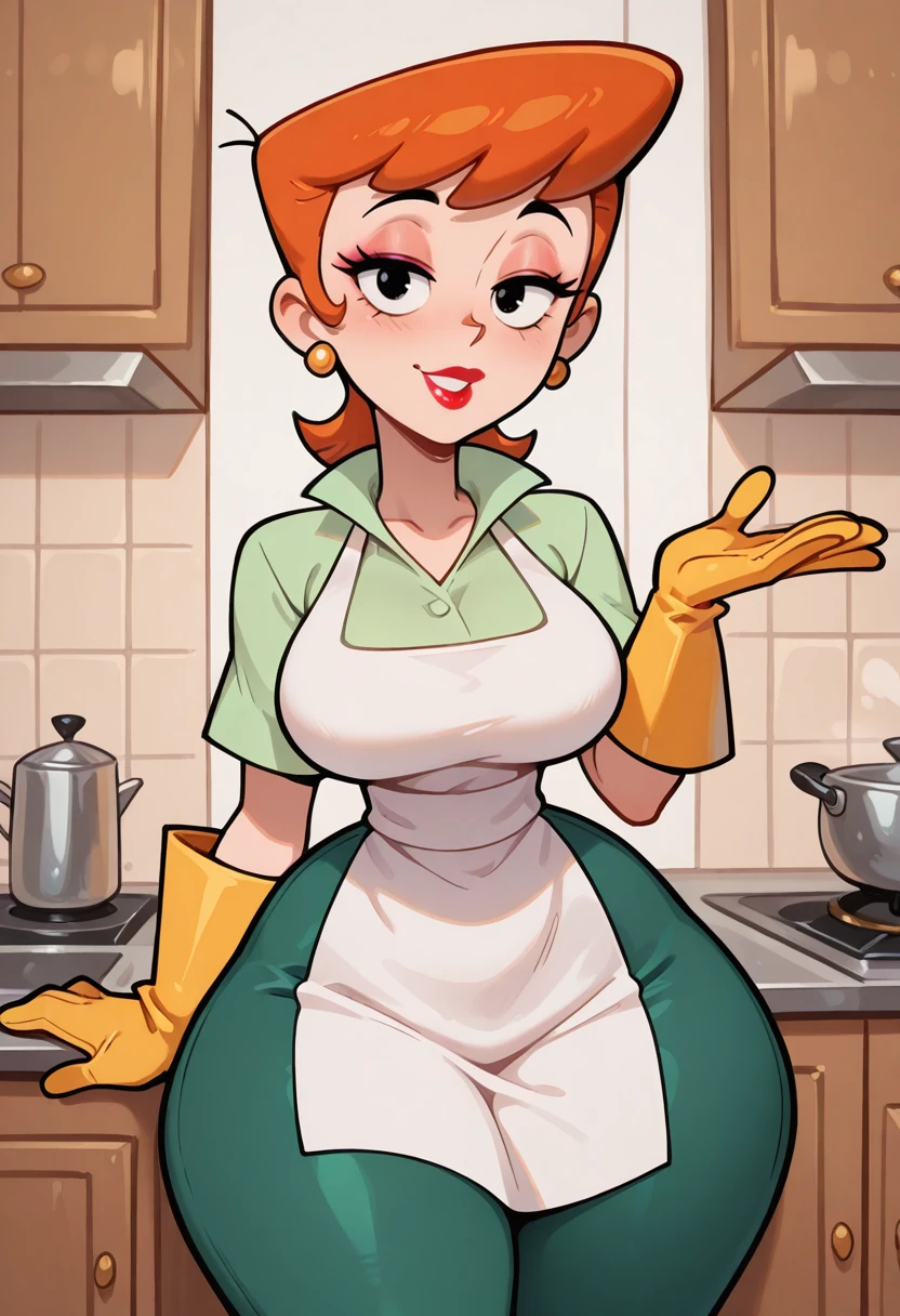 Default look: dextersmom, mature female, short orange hair, black eyes, large breasts, thick thighs, wide hips, green shirt, green pants, apron, yellow gloves, earrings, makeup, lipstick