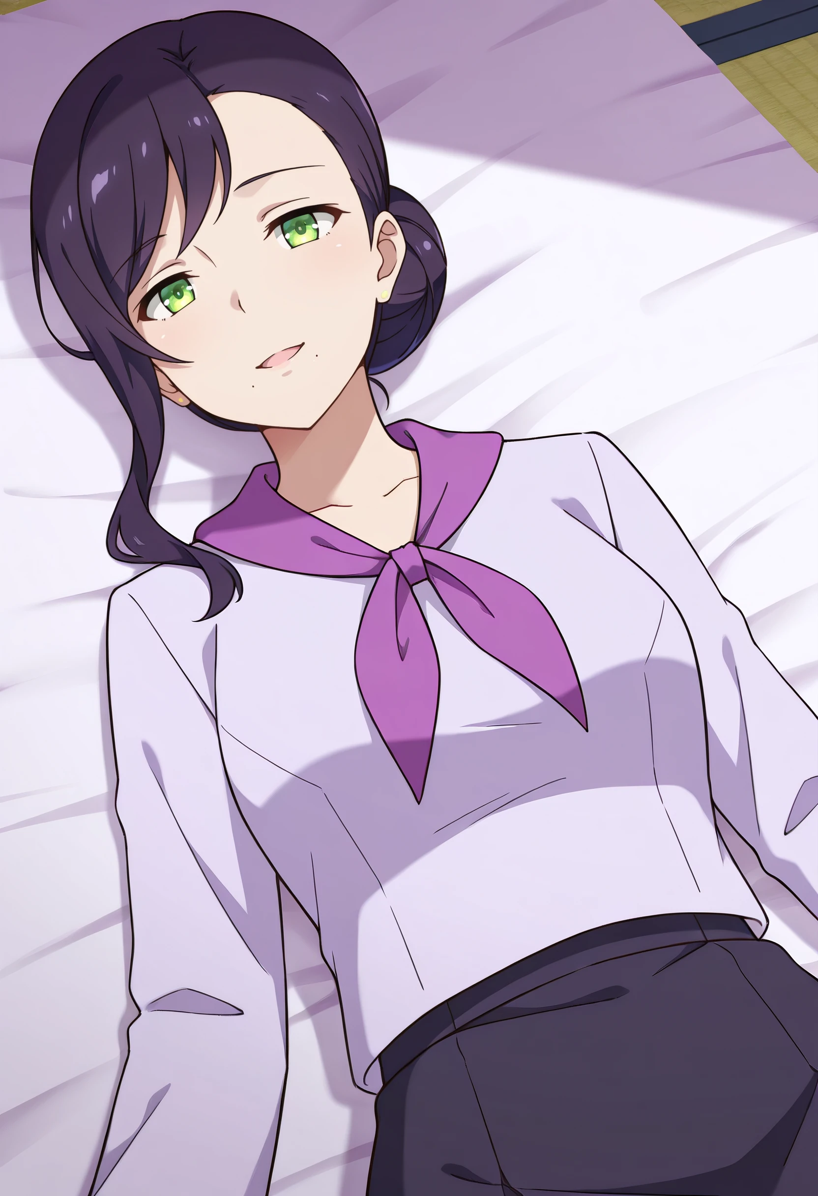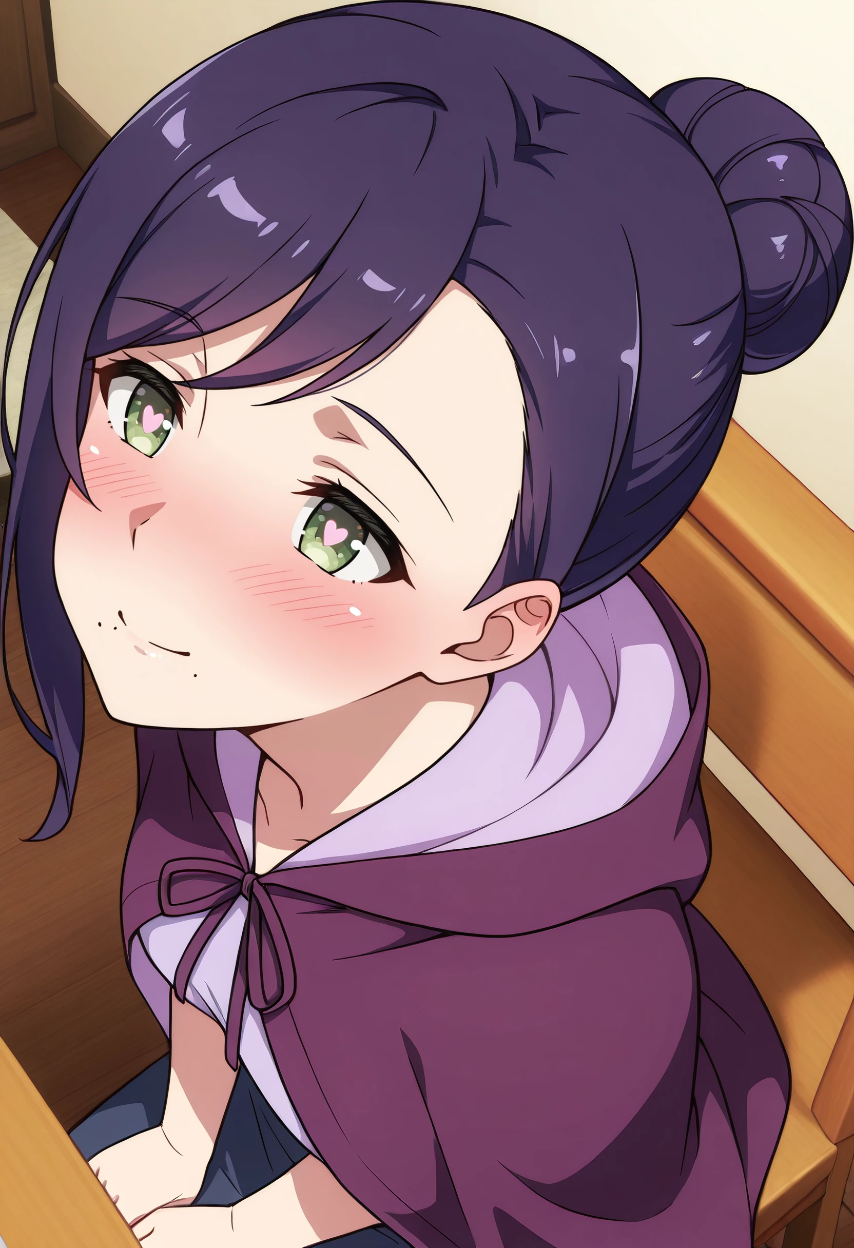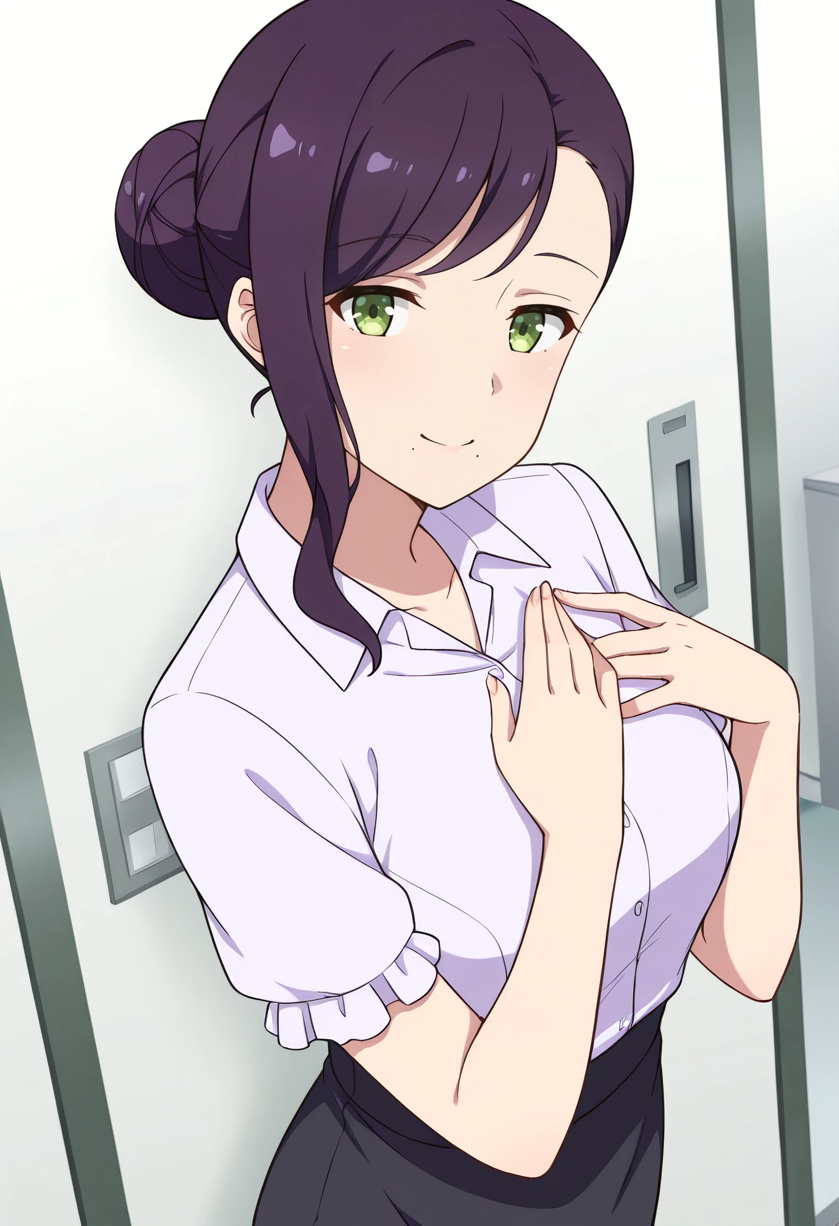 TNMTouko, short hair, mole, mole under mouth, green eyes, purple hair, single hair bun, hair bun, asymmetrical hair,