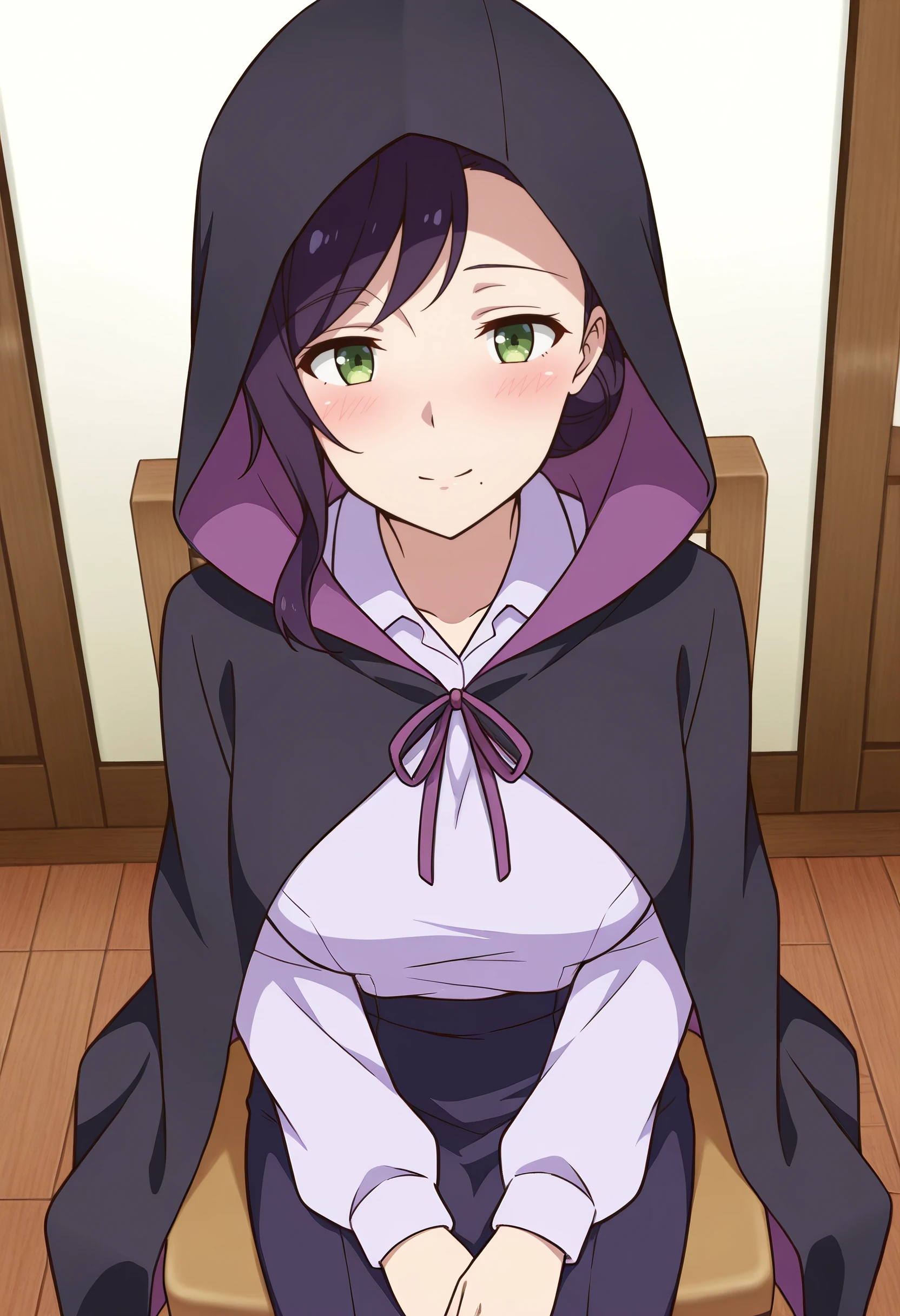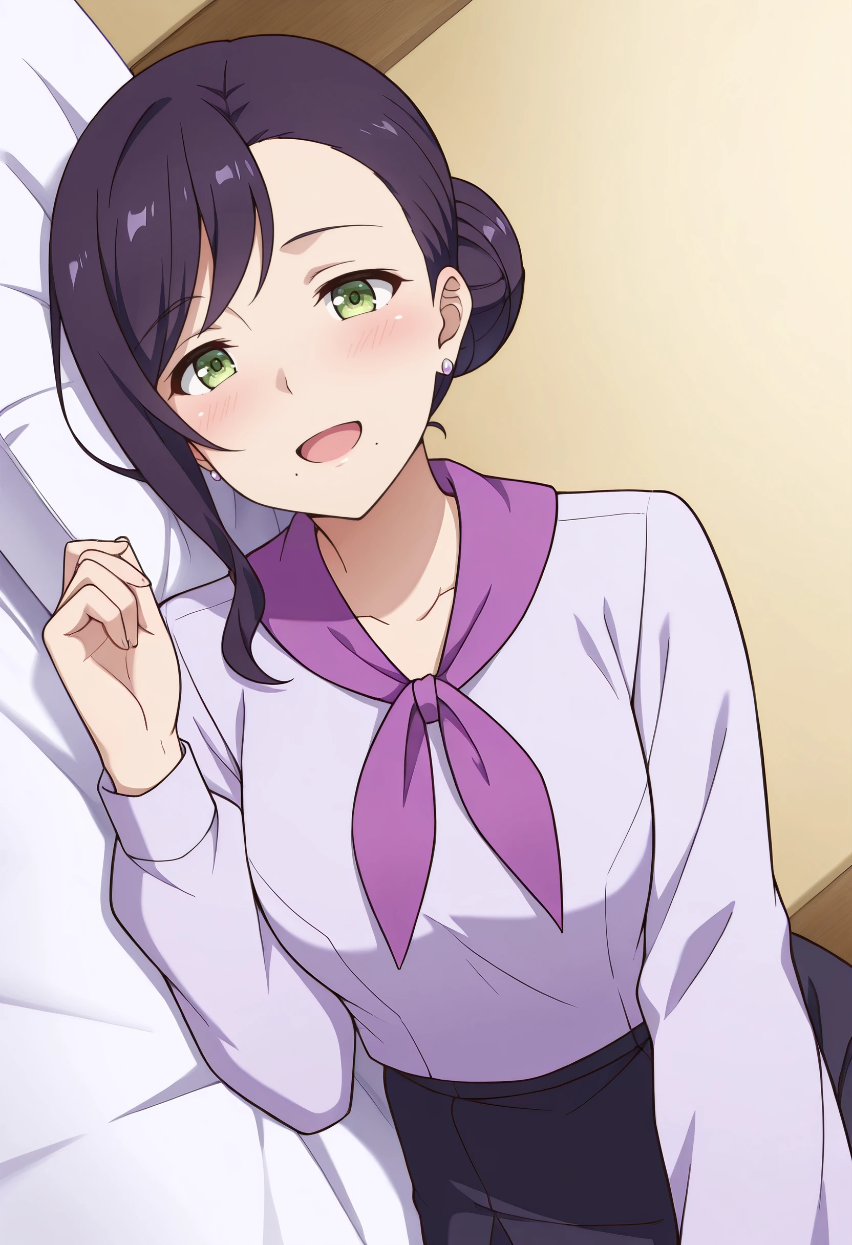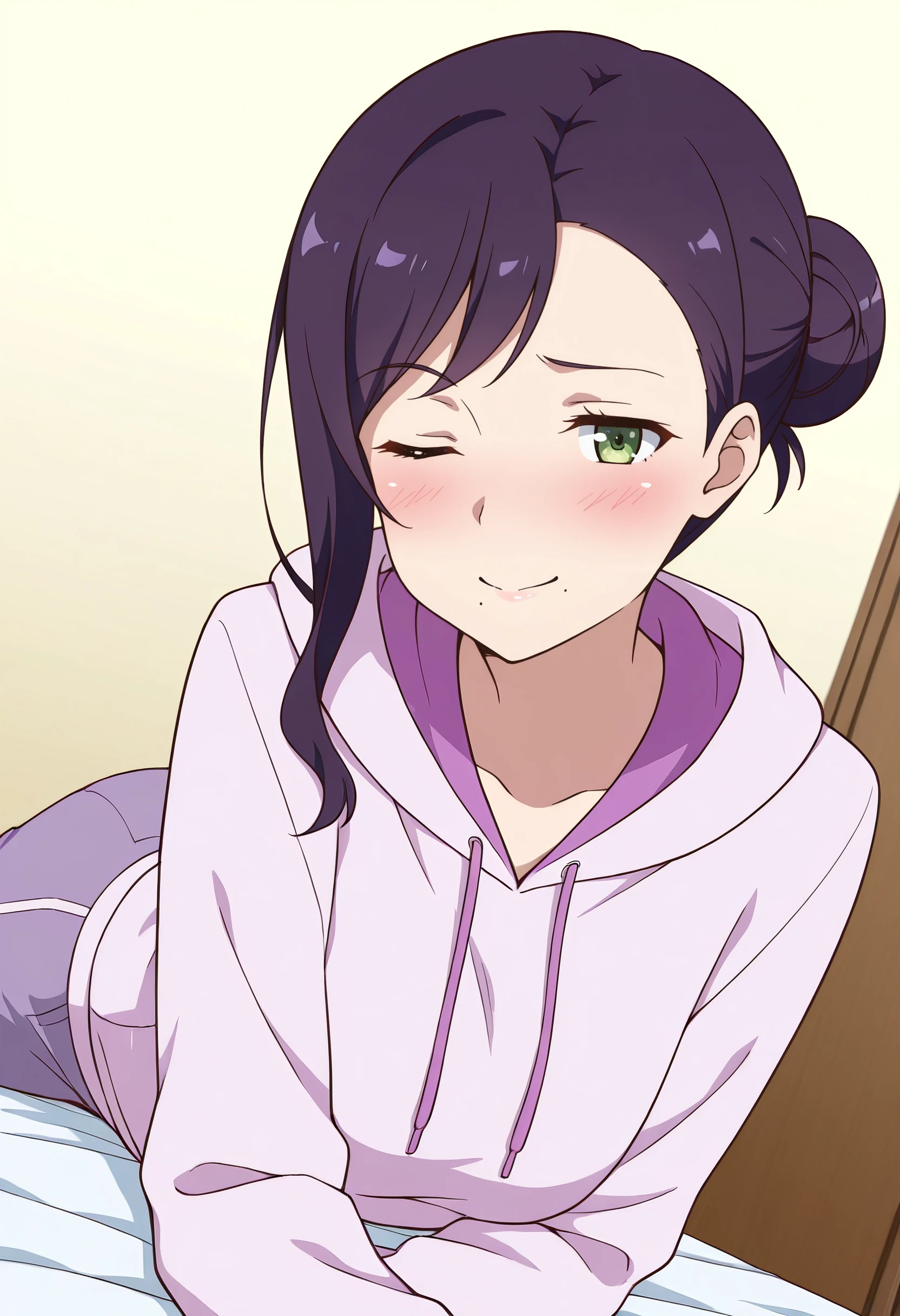 TNMTouko, short hair, mole, mole under mouth, green eyes, purple hair, single hair bun, hair bun, asymmetrical hair,