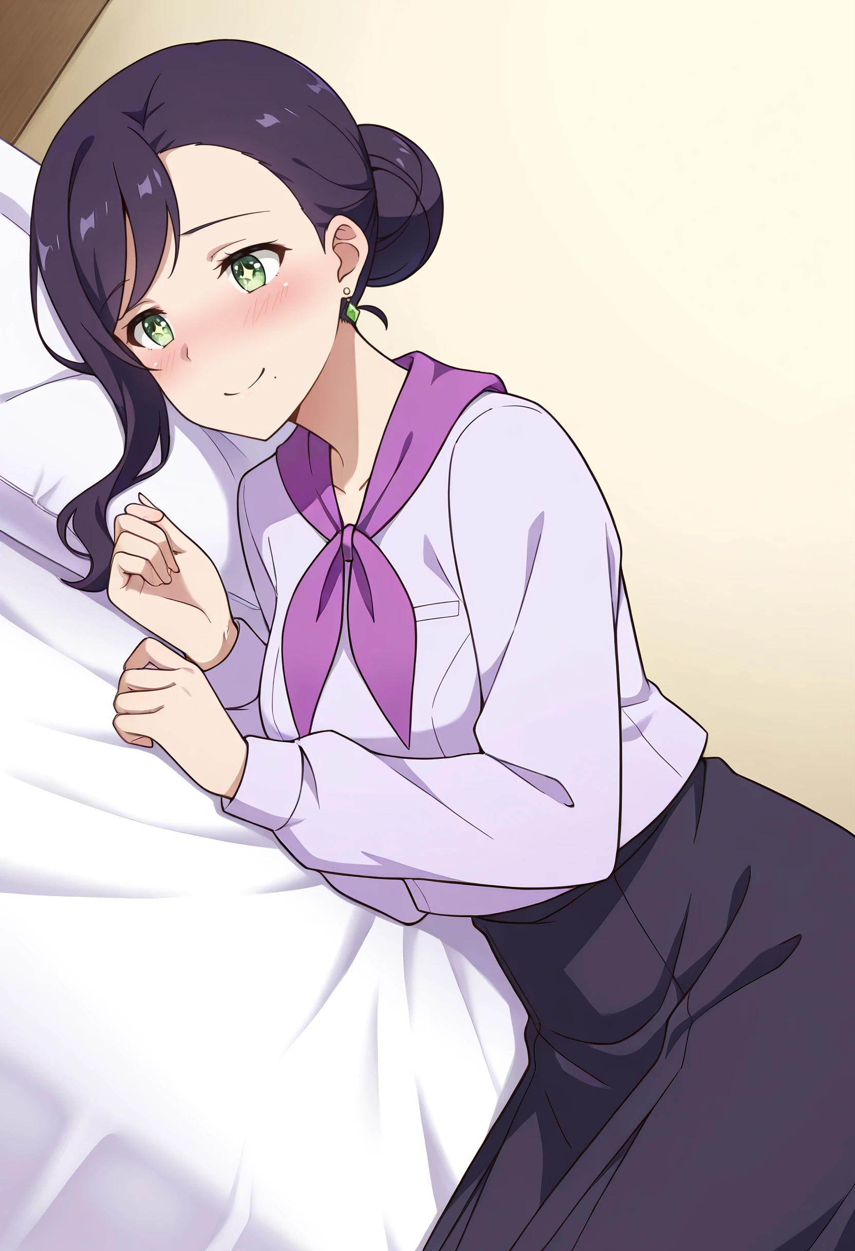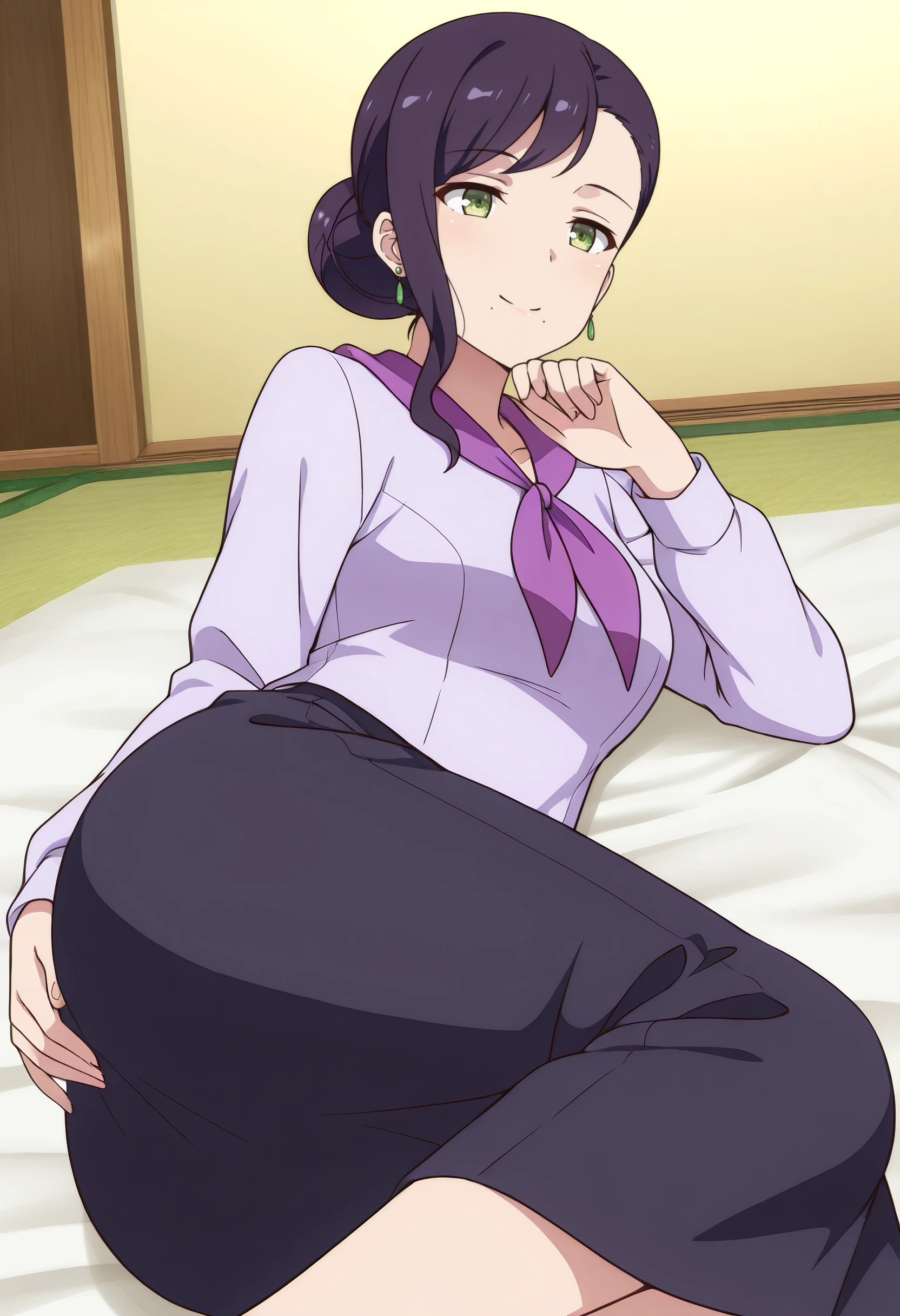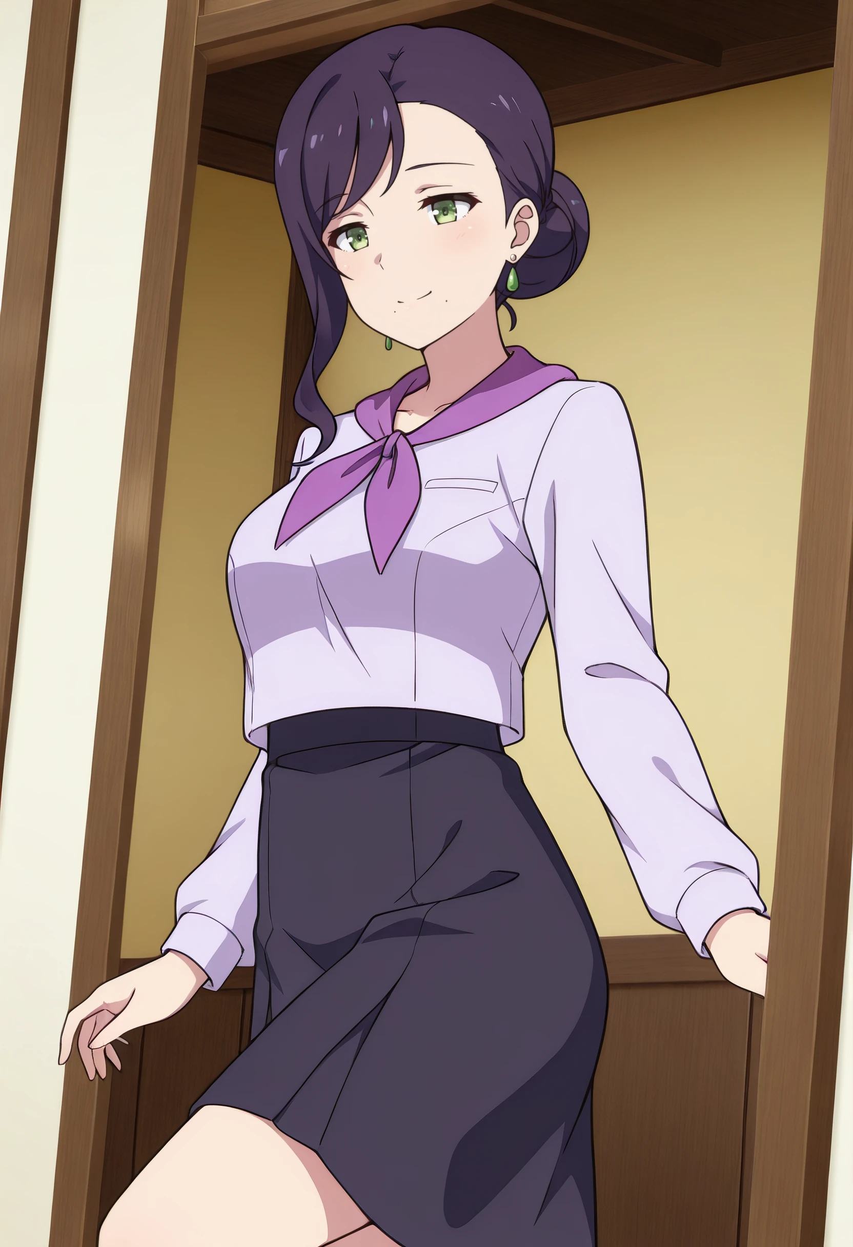 ToukoOutfit, shirt, single sidelock, neckerchief, long sleeves, skirt, purple ascot, jewelry, purple shirt, black skirt, purple neckerchief, earrings, formal clothes,