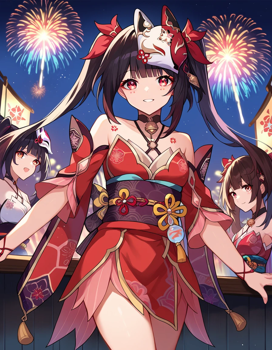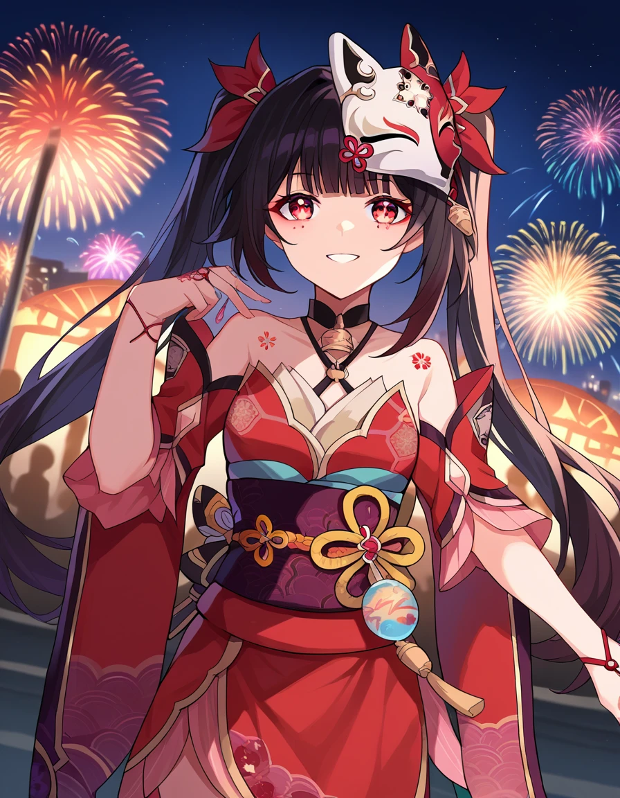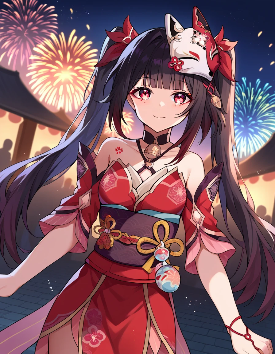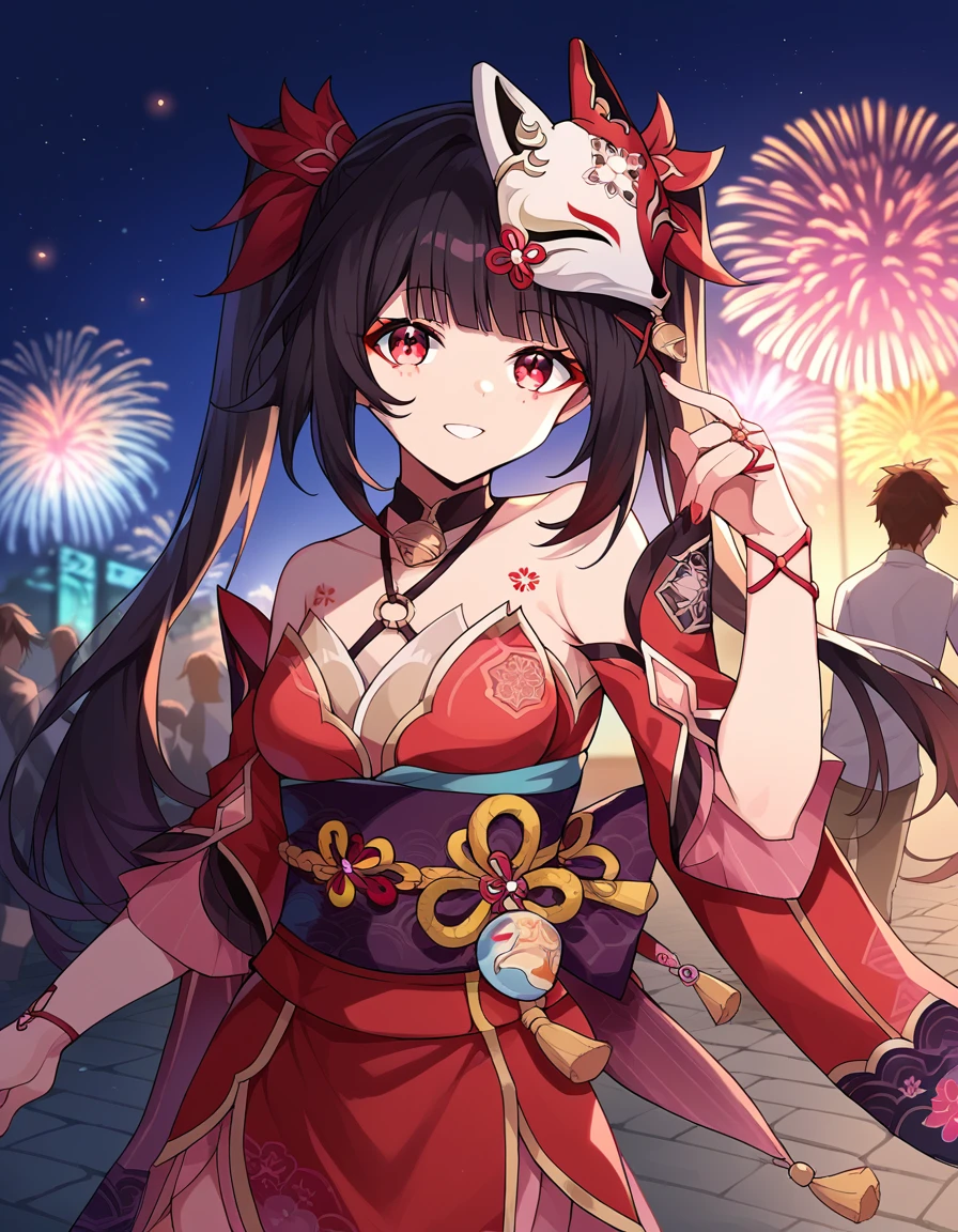 sparkle, long hair, bangs, black hair, hair ornament, twintails, red eyes, bell, mask, mask on head, fox mask,