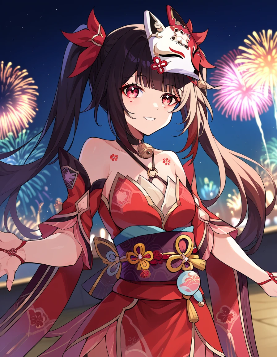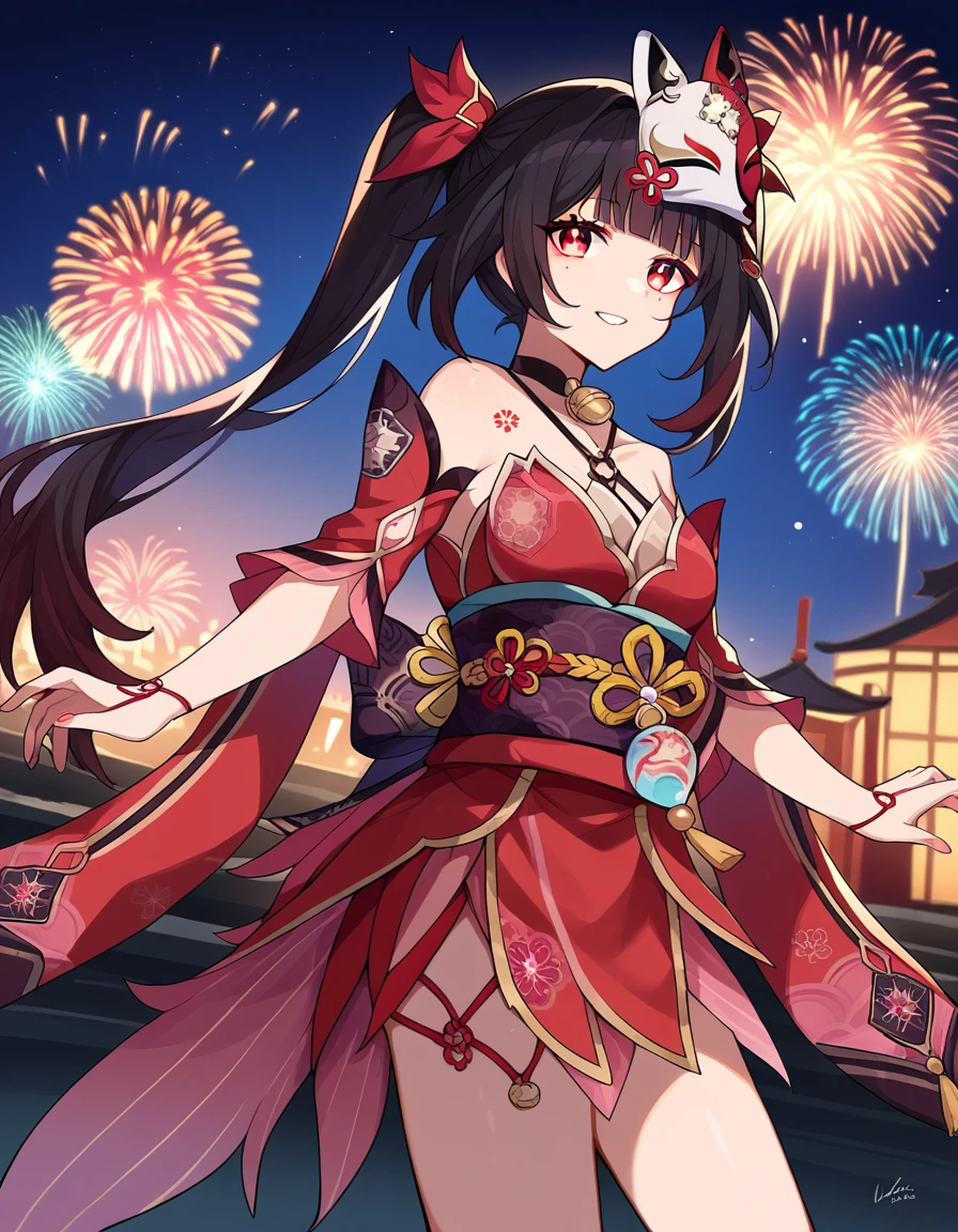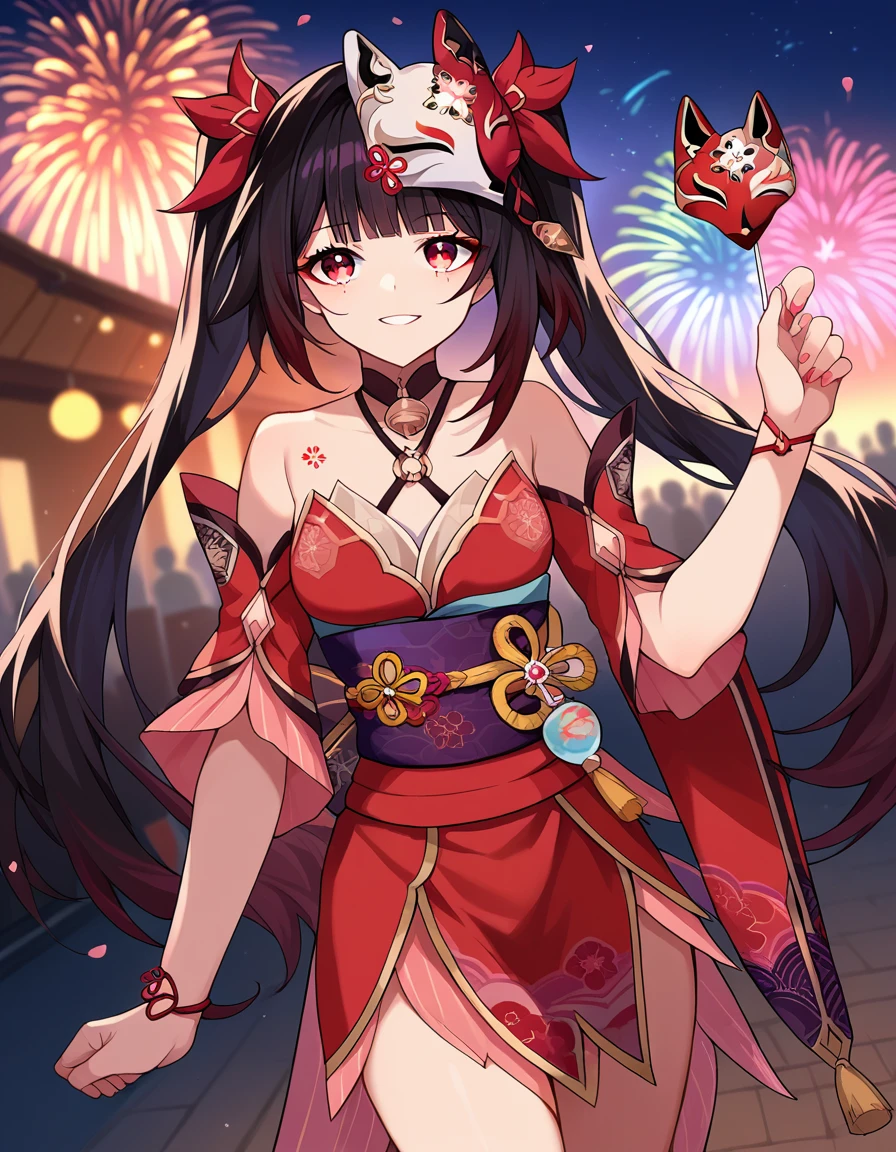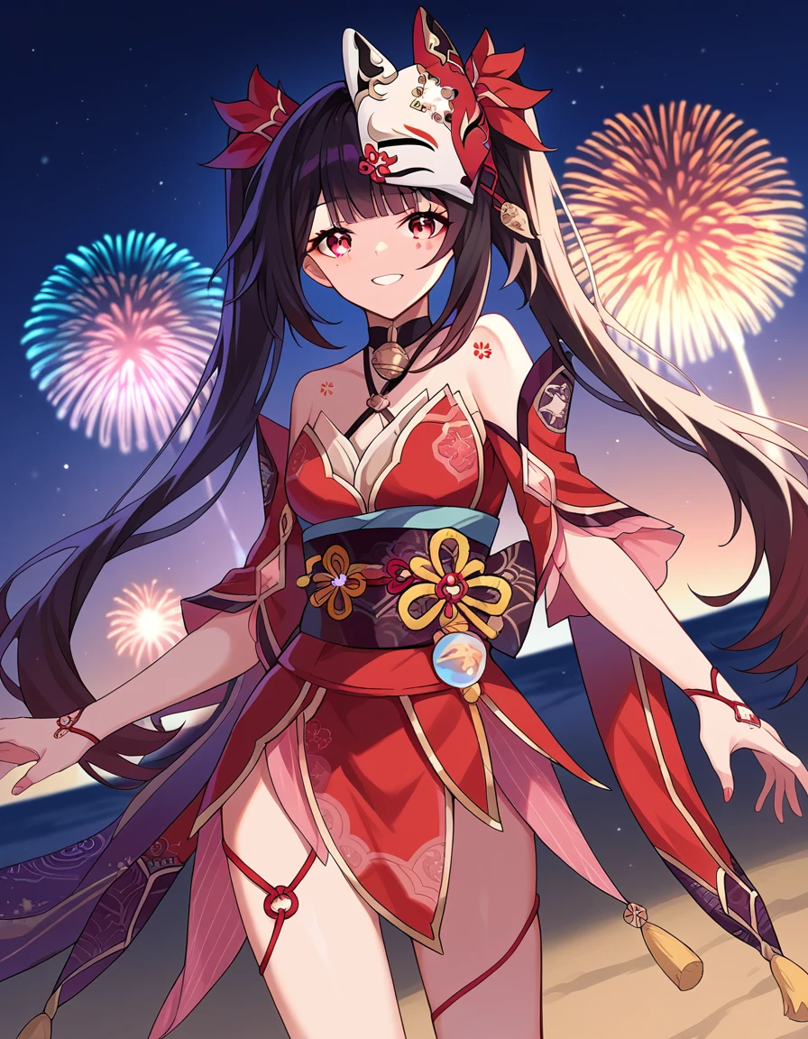 sparkle, long hair, bangs, black hair, hair ornament, twintails, red eyes, bell, mask, mask on head, fox mask,
