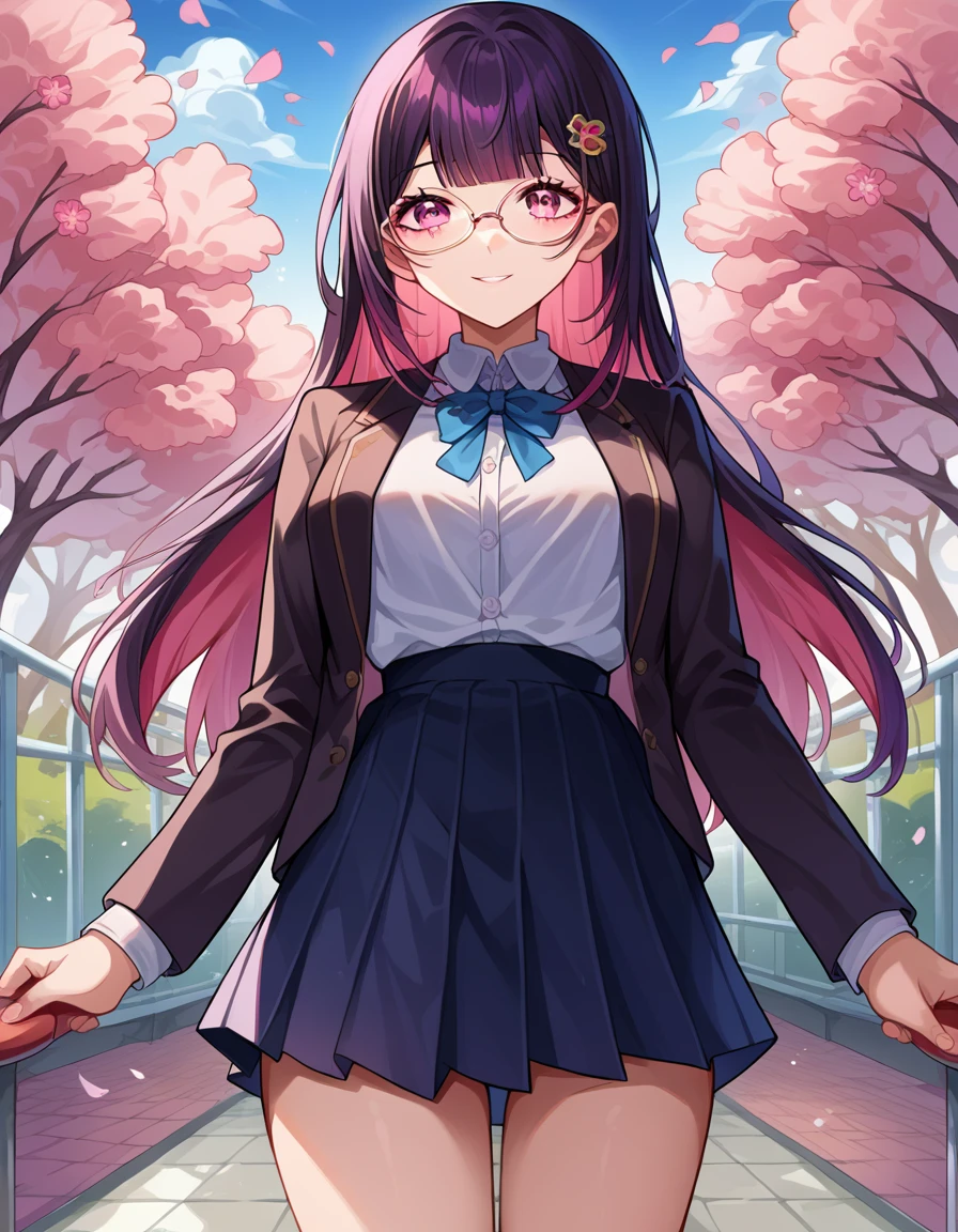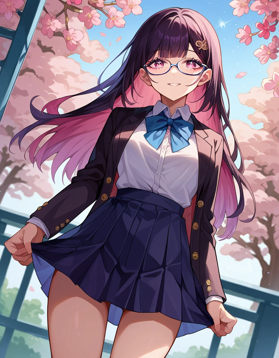 sparkle school uniform, black hair, colored inner hair, glasses, hair intakes, hair ornament, hairclip, long hair, multicolored hair, pink eyes, purple hair, straight hair,