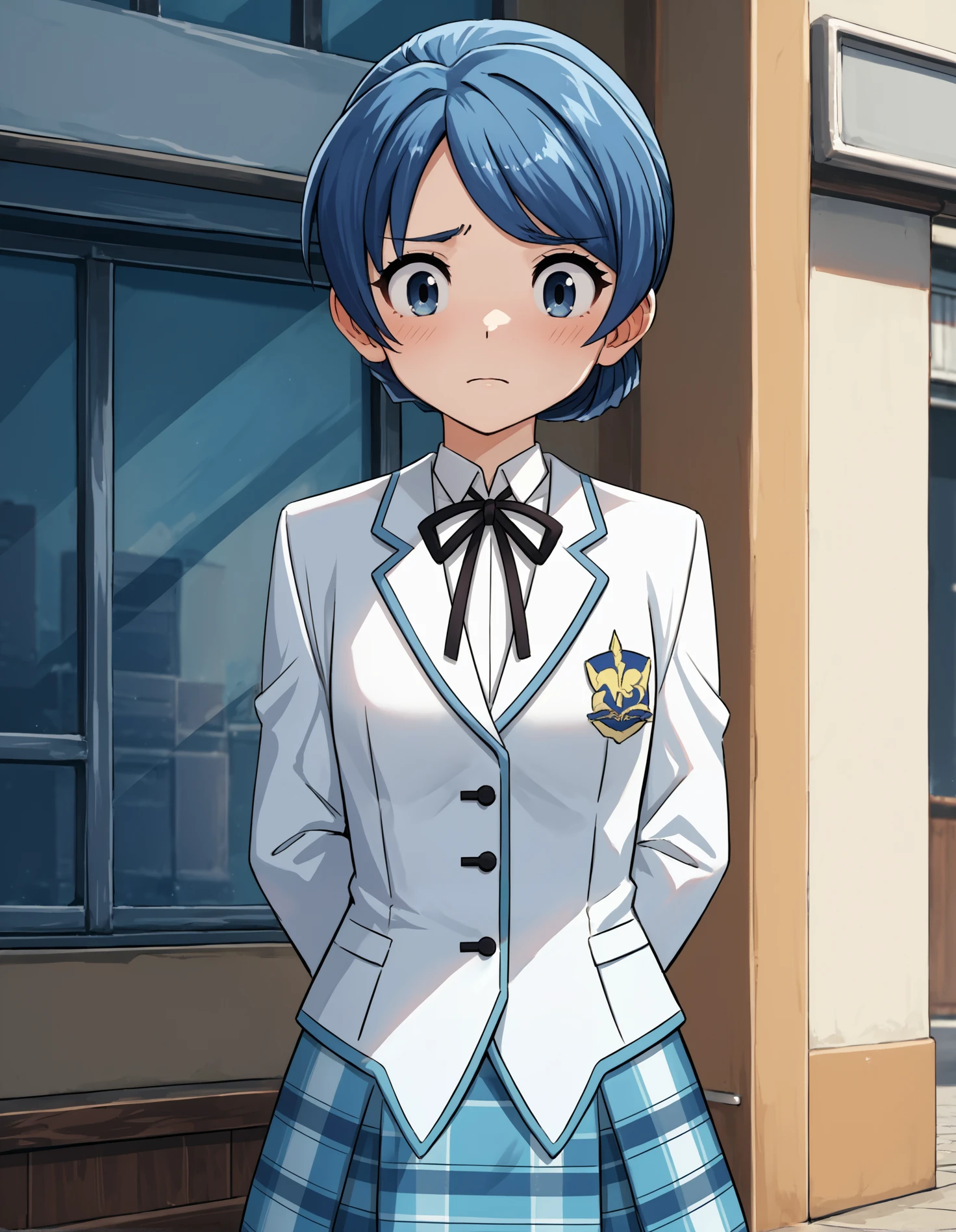 pmmmmelissa, mlspbc, blue hair, hair bun, blue eyes, white shirt, black neck ribbon, white blazer, light blue plaid skirt