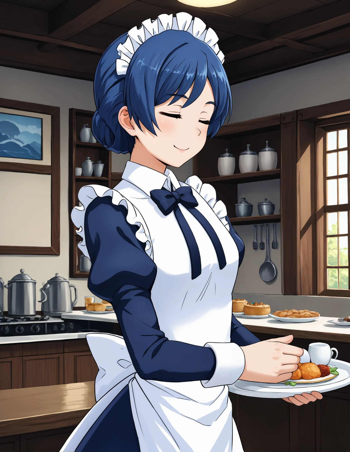 pmmmmelissa, mlscsl, blue hair, hair bun, blue eyes, maid headdress, (white frilled apron), blue bowtie, blue puffy sleeves, white wrist cuffs, white back bow, long blue skirt