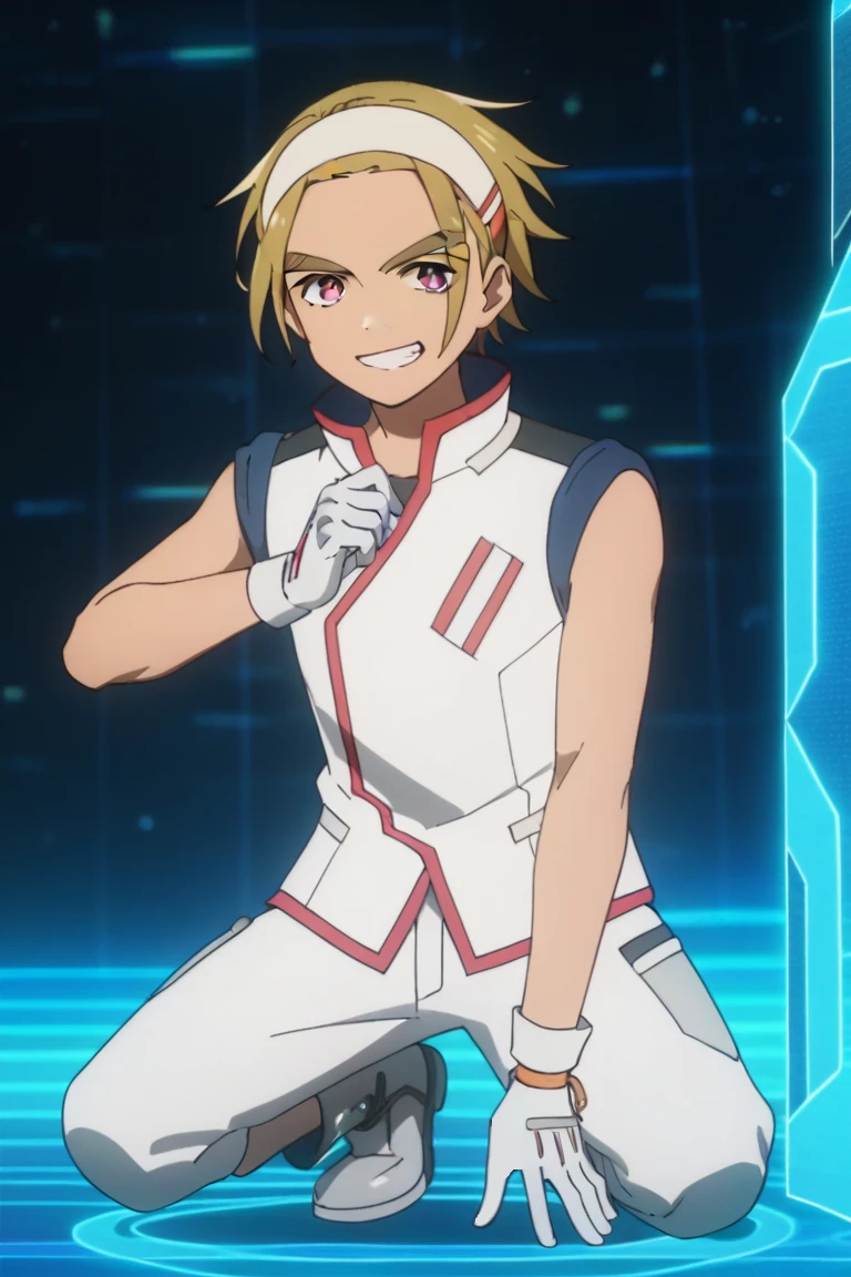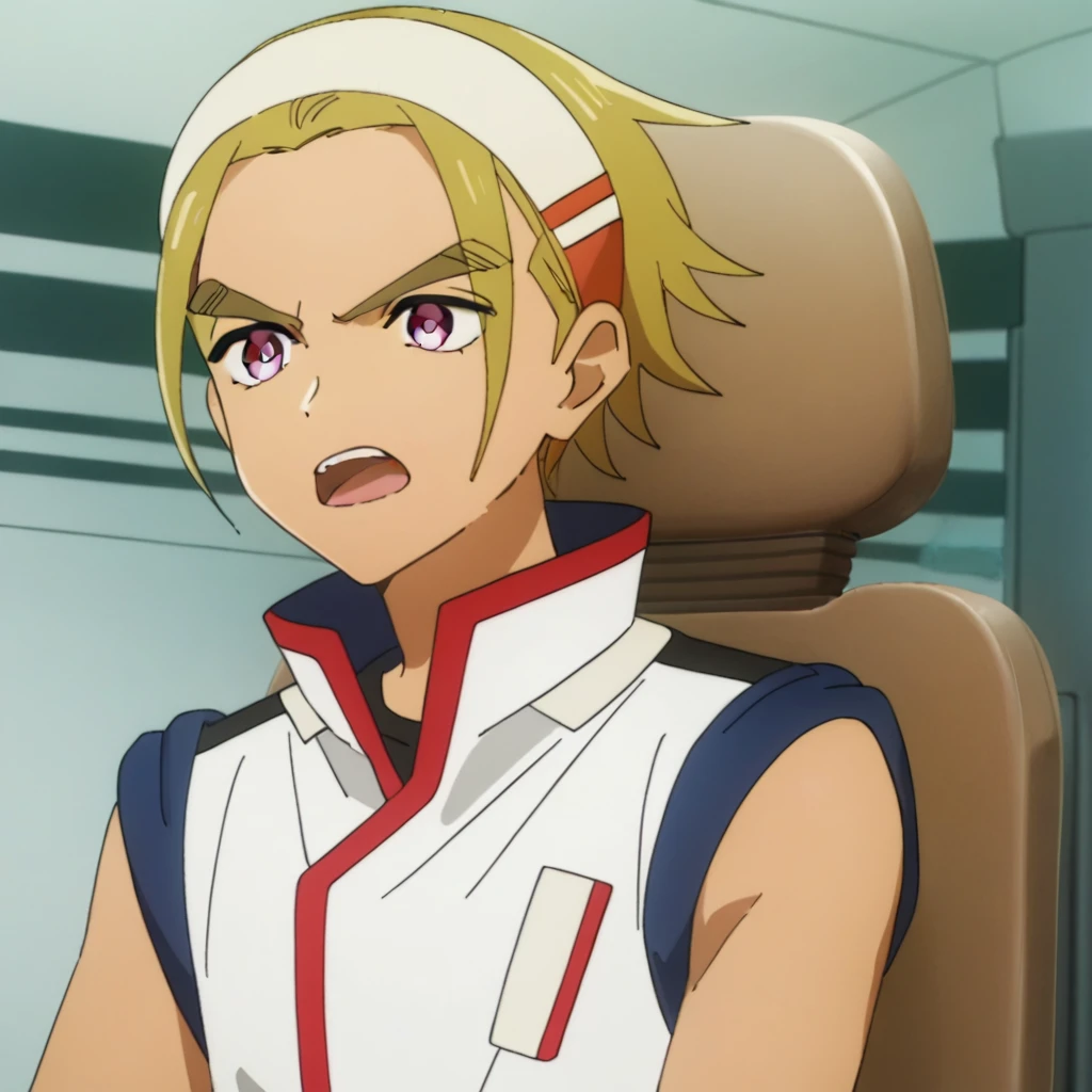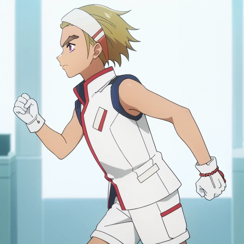 Uniform: male, blonde hair, white headband, purple eyes, thick eyebrows, uniform, sleeveless, black undershirt, gloves, bracelet on left wrist, jewelry, shorts, grey footwear, indoors (hallway), cockpit/chair, holographic interface