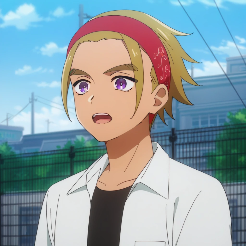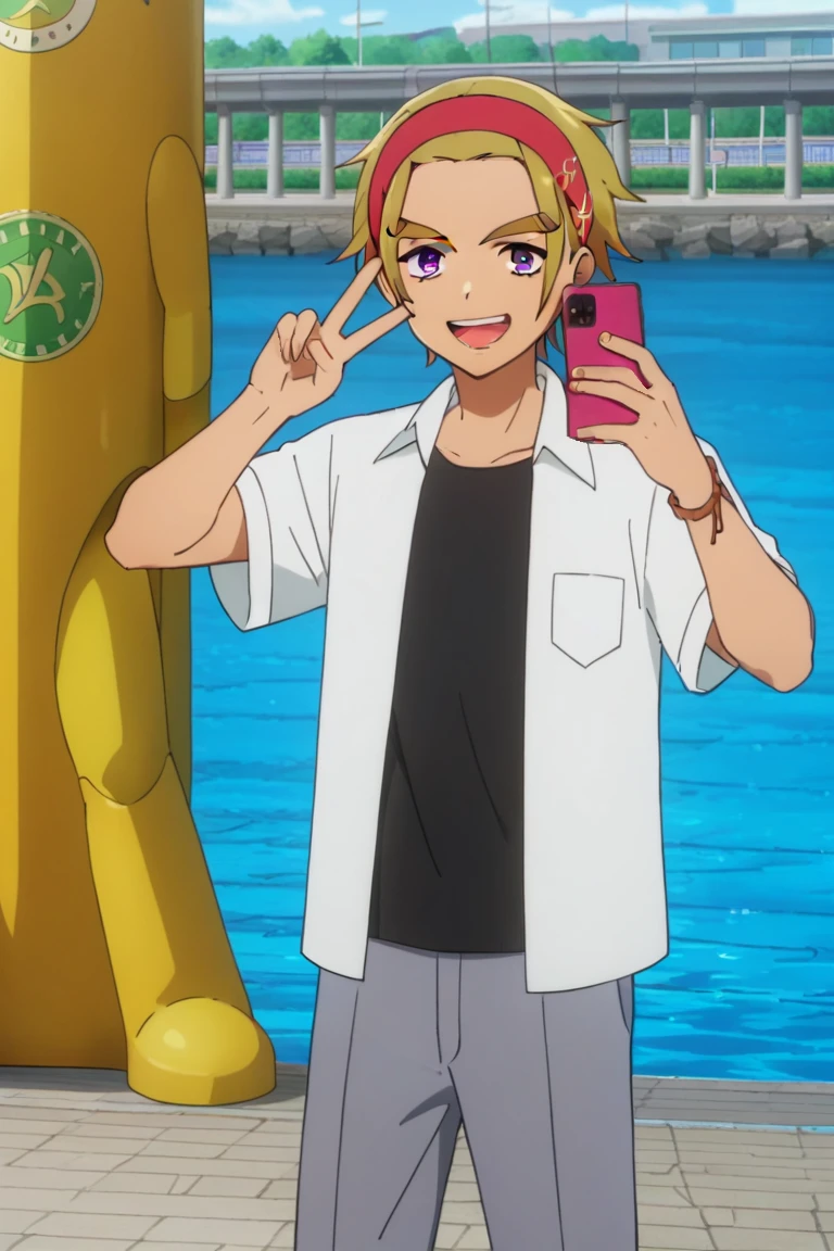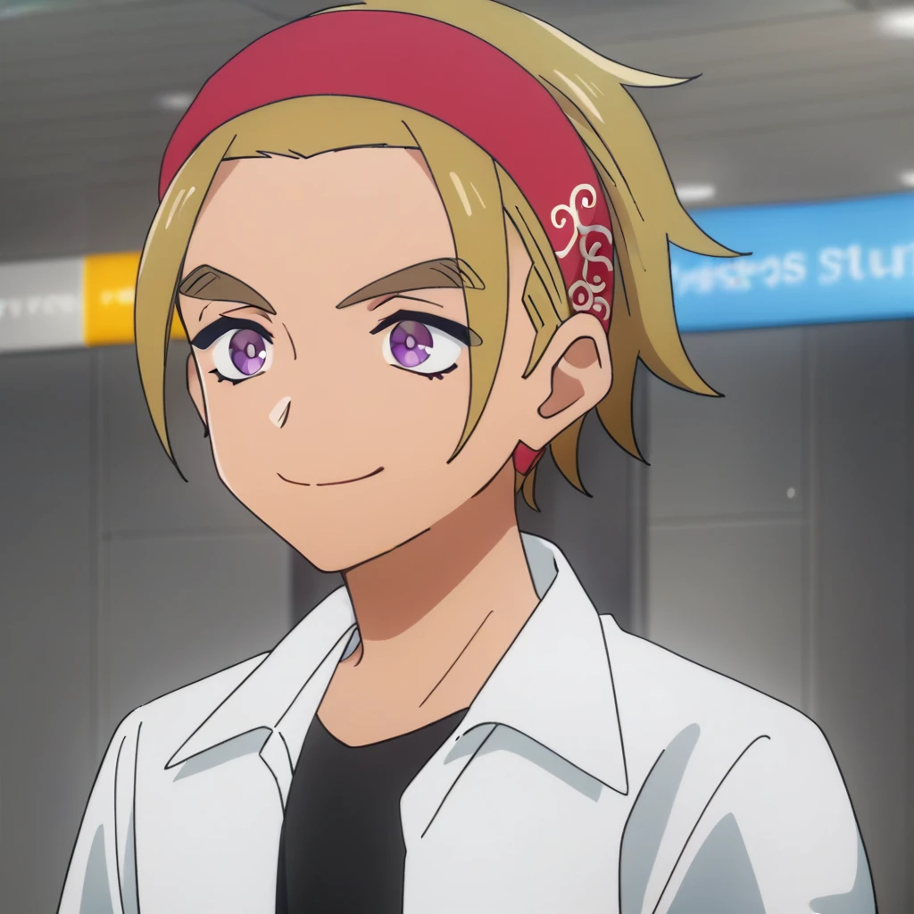 Civilian: male, blonde hair, red hairband, purple eyes, thick eyebrows, collared shirt, black undershirt, open clothes, short sleeves, bracelet on left wrist, jewelry, pants, blue shoes, indoors (train station), outdoors (city/sky/cloud/building/fence/tree/power lines), outdoors (river/statue)