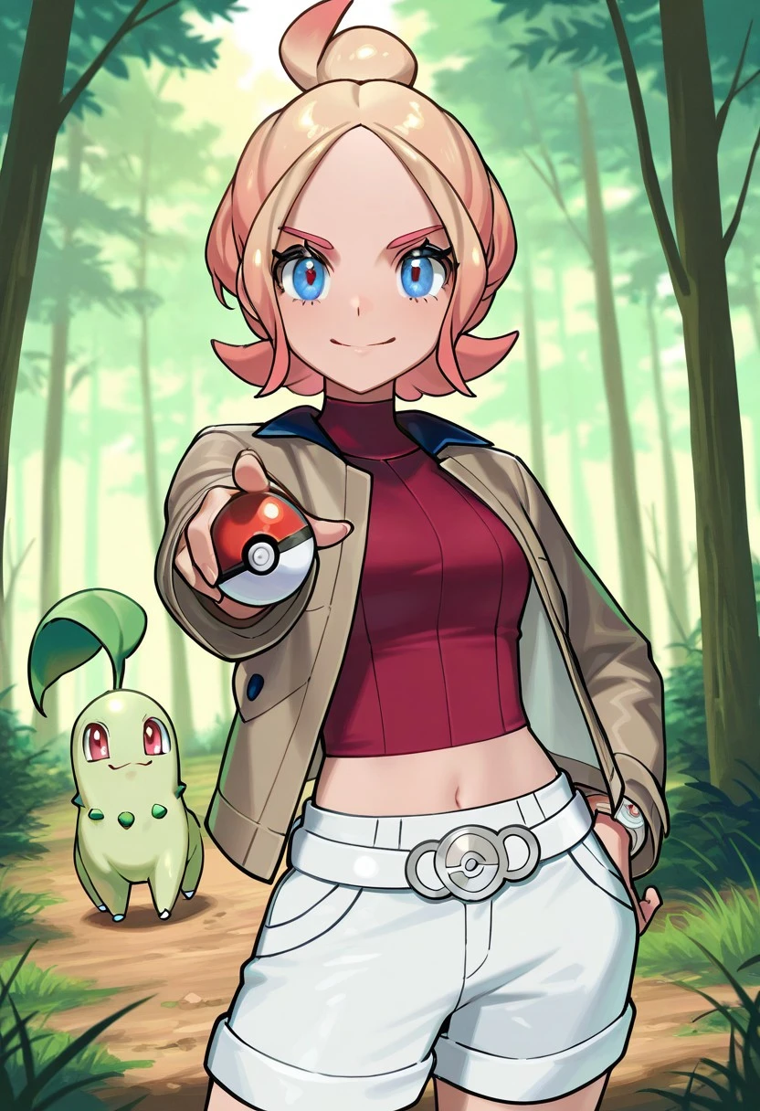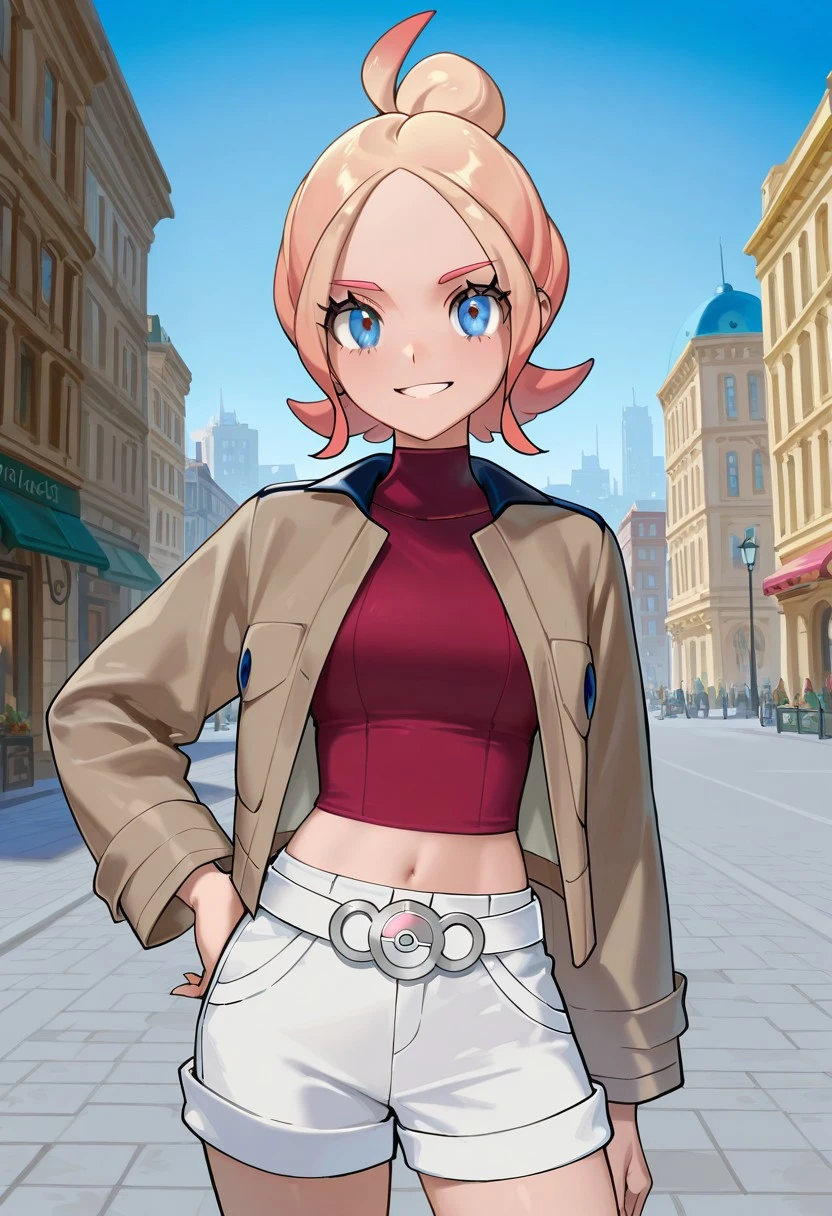 blonde hair, gradient hair, jacket, red shirt, midriff, white shorts,