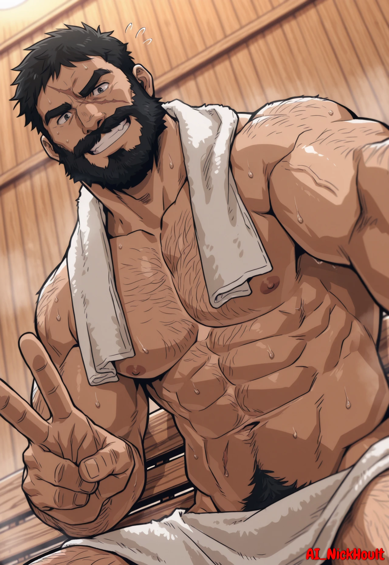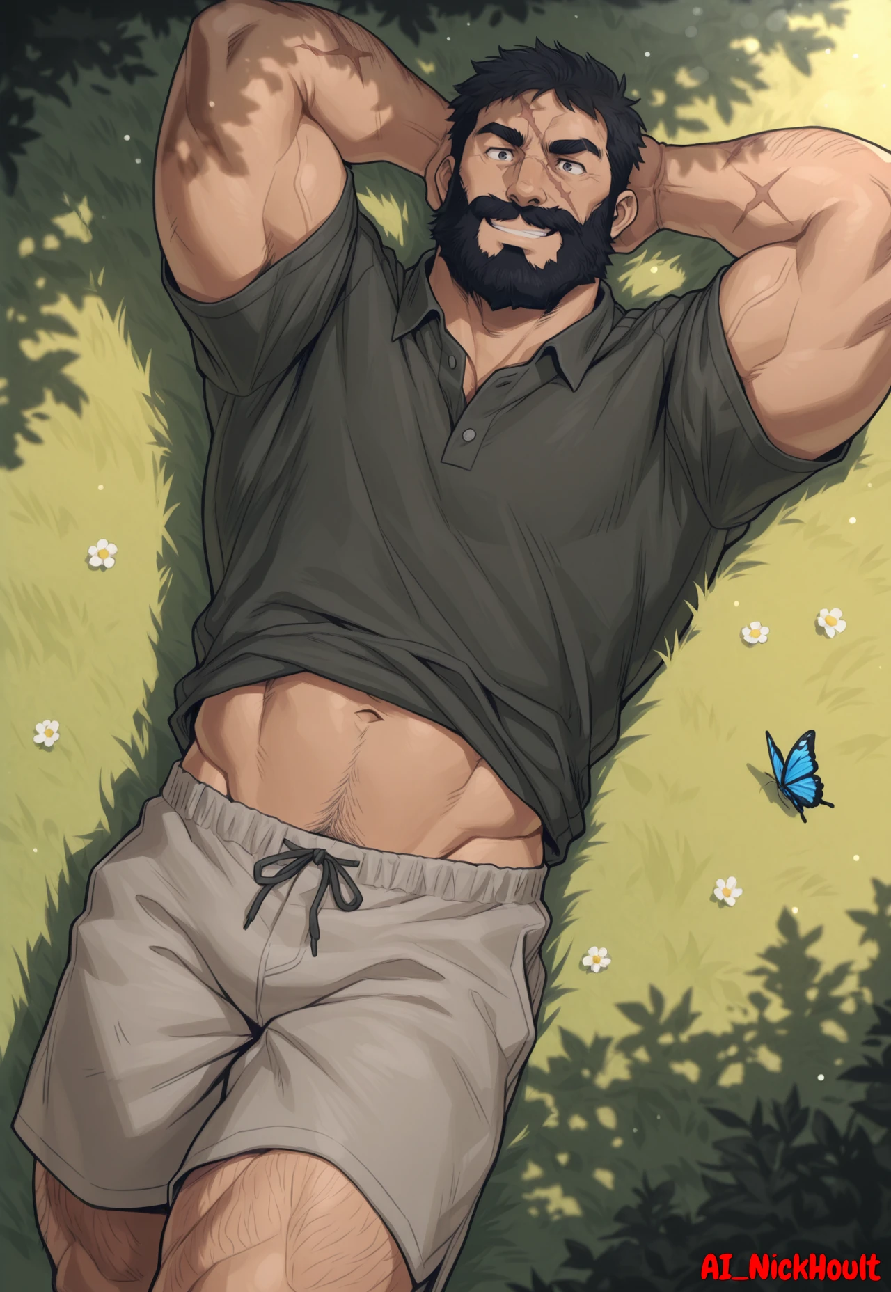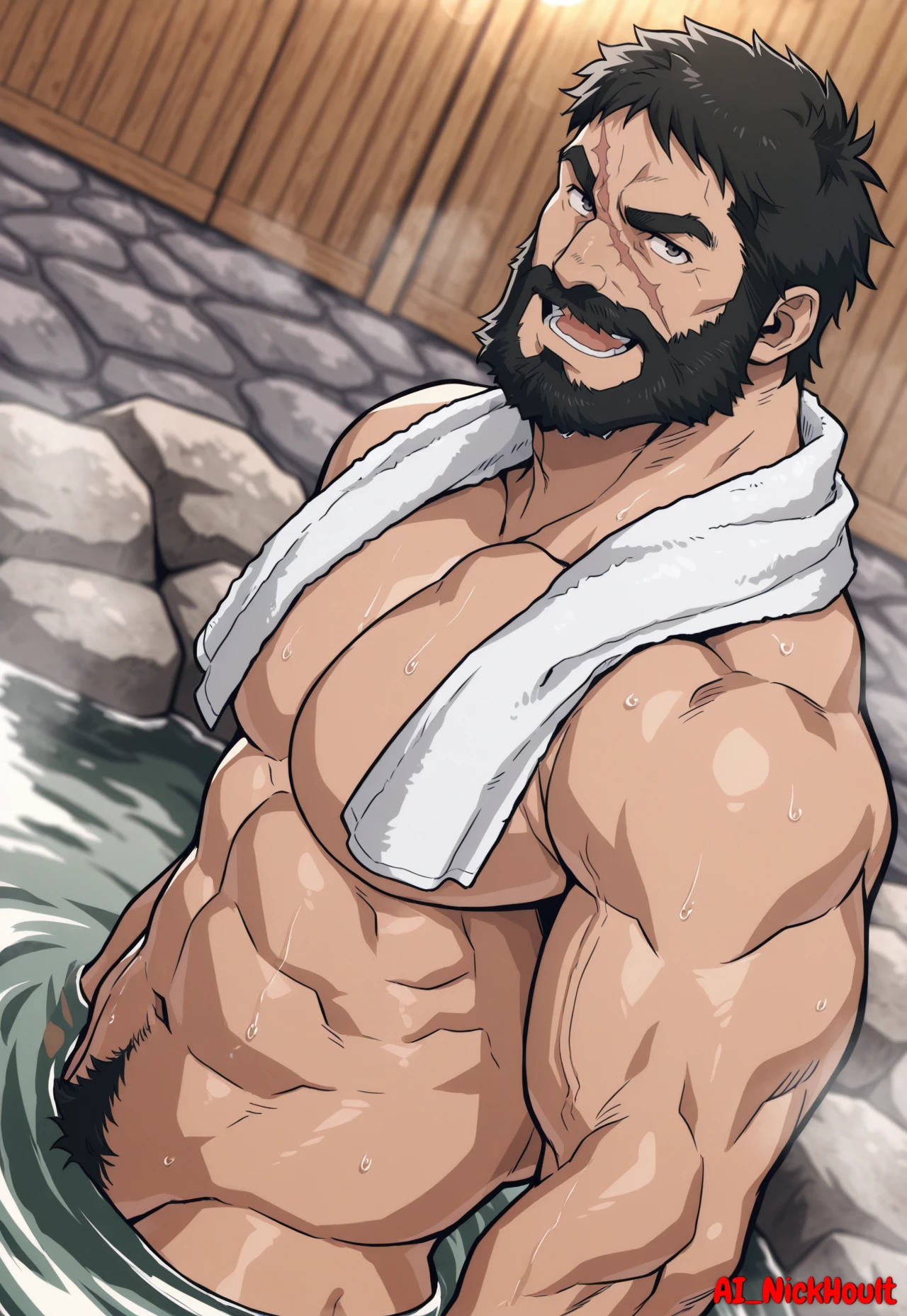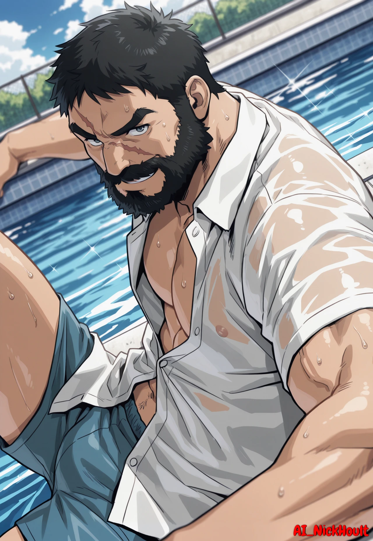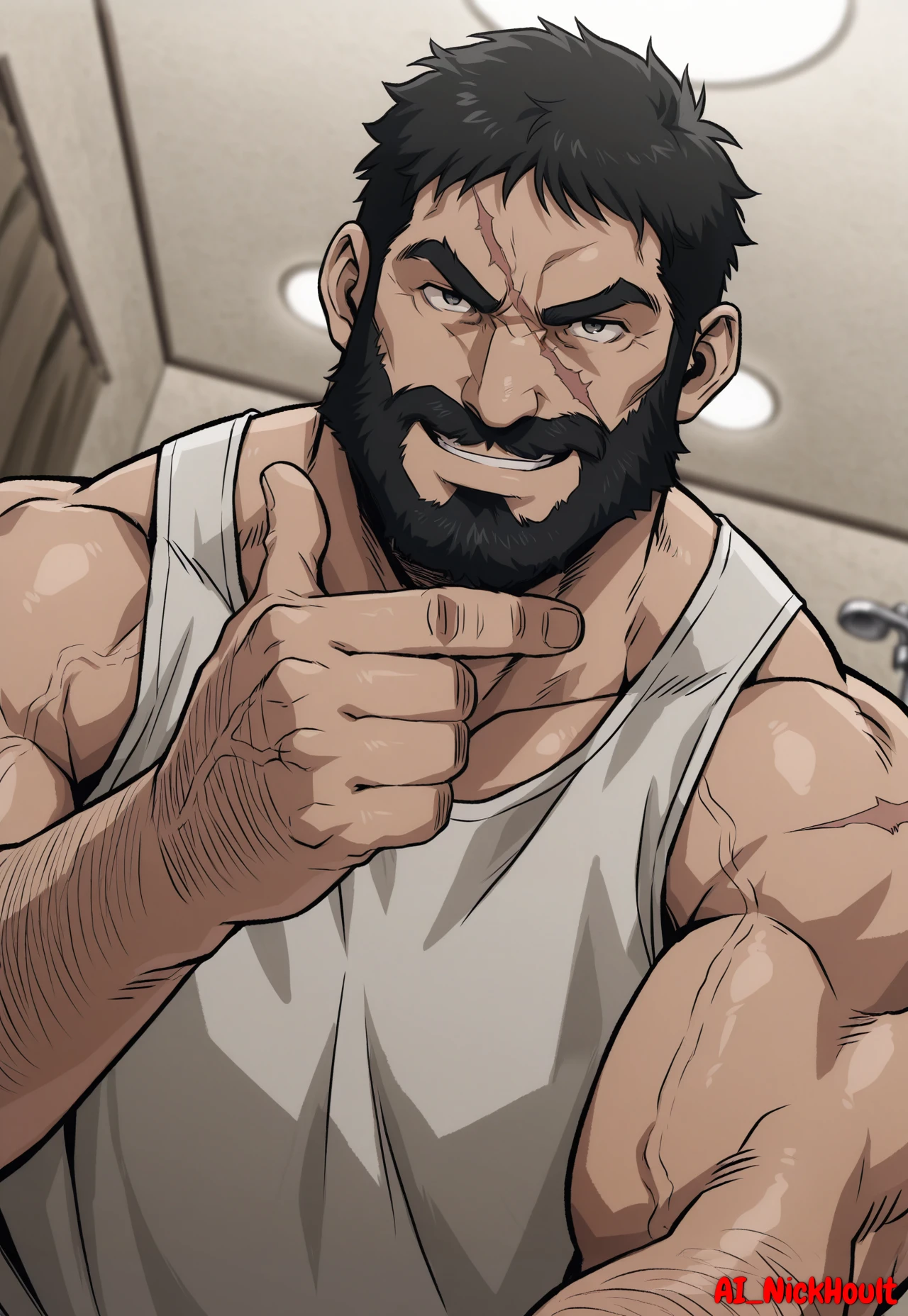 Knuckleduster, mature man, muscular man, black hair, short hair, full beard, thick eyebrows, one scar across face,