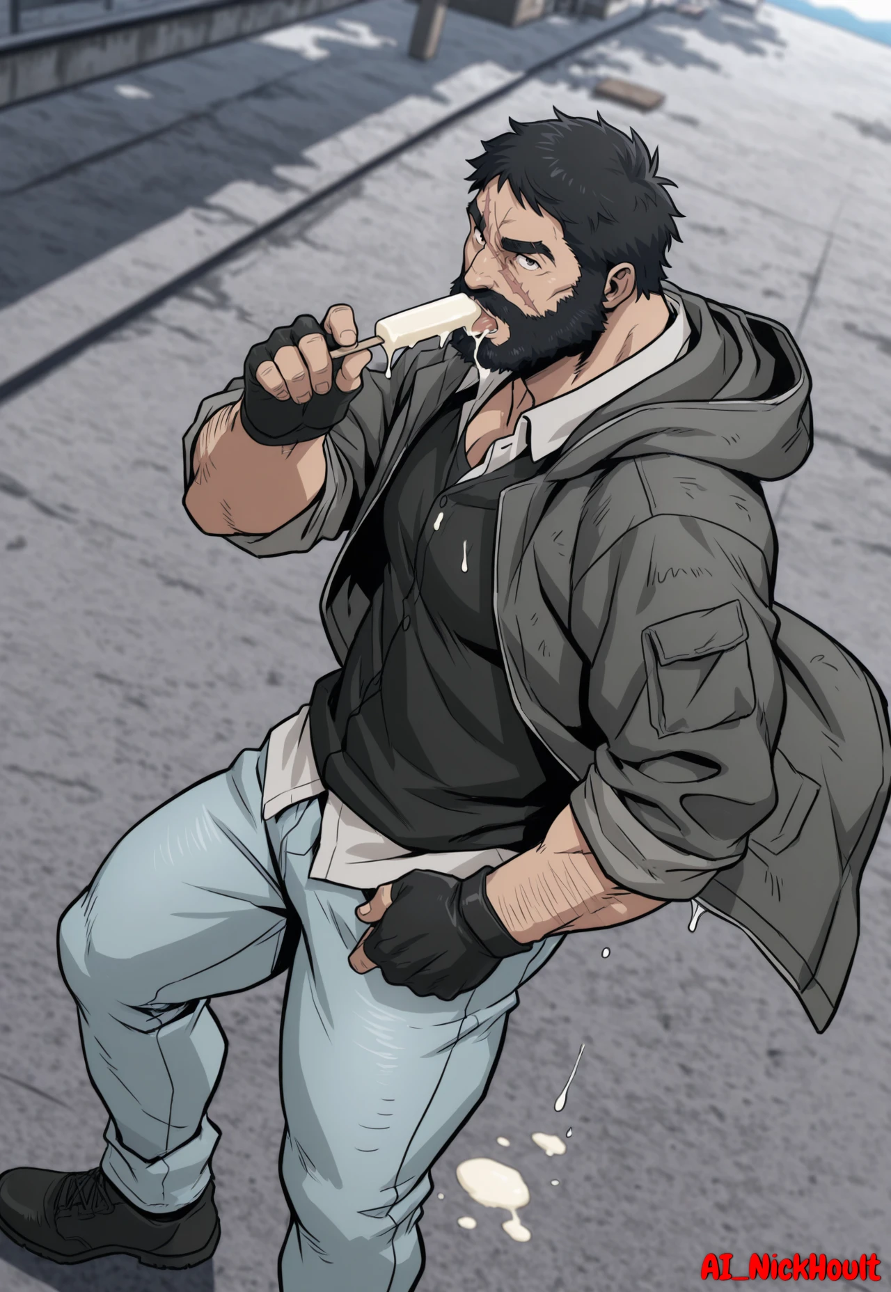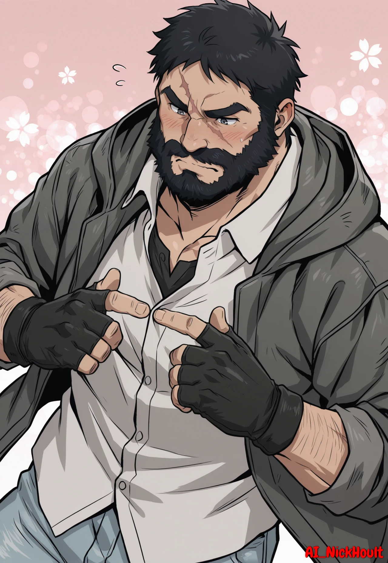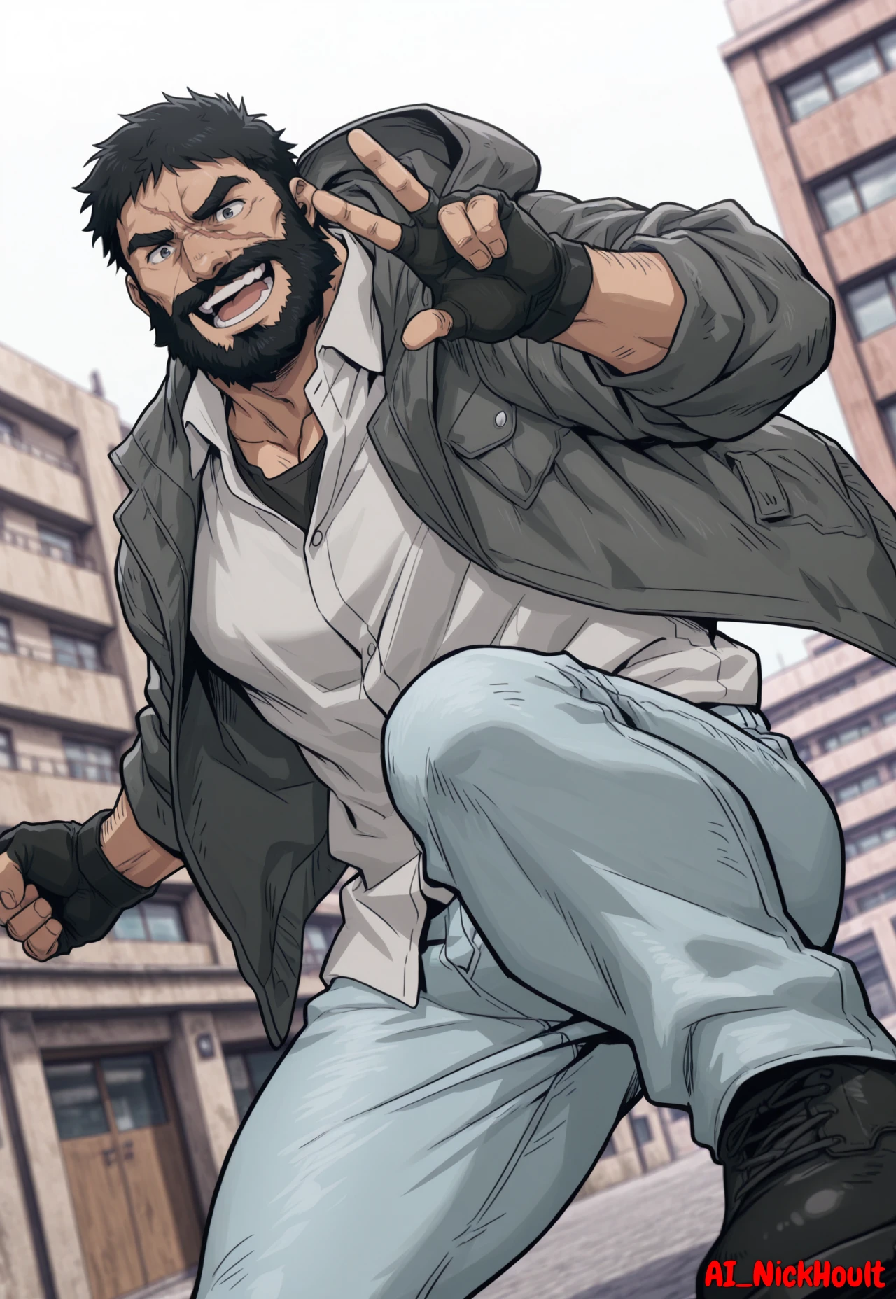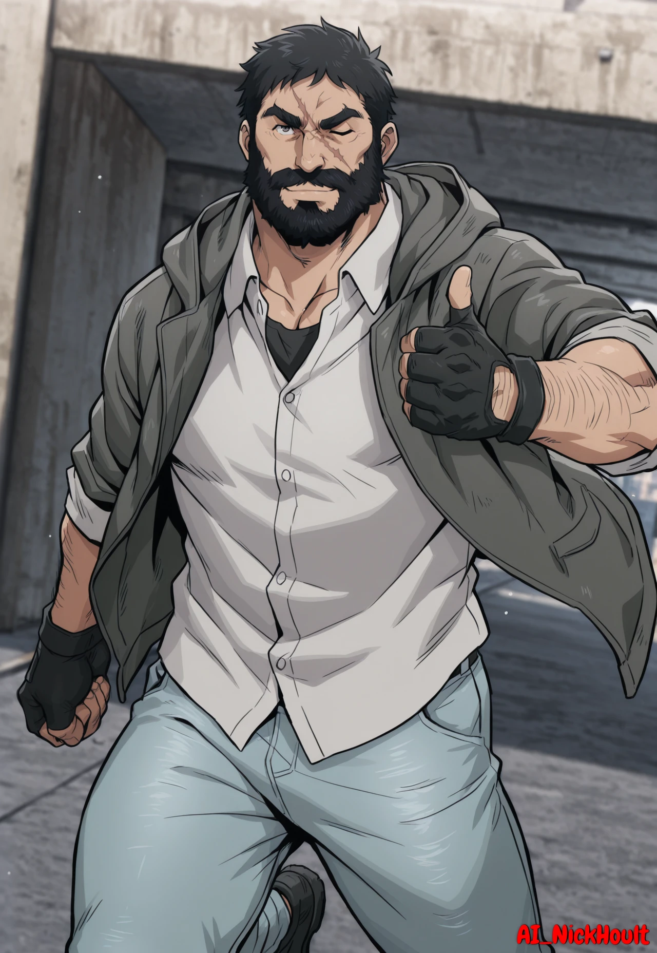Knuckleduster, mature man, muscular man, black hair, short hair, full beard, thick eyebrows, one scar across face,grey hooded jacket, white shirt, light blue jeans, black shoes, black fingerless gloves, black tank top under the shirt,Description