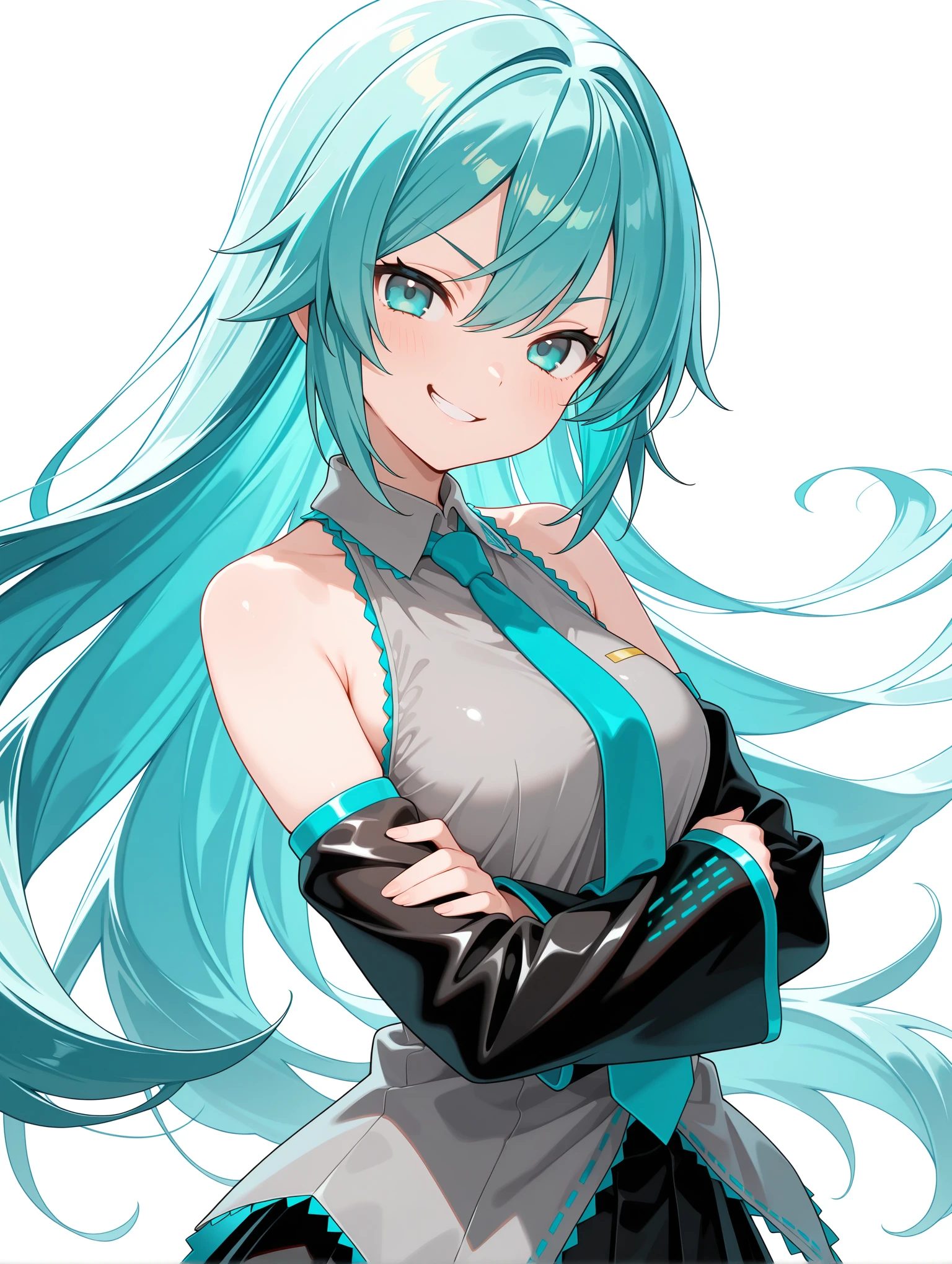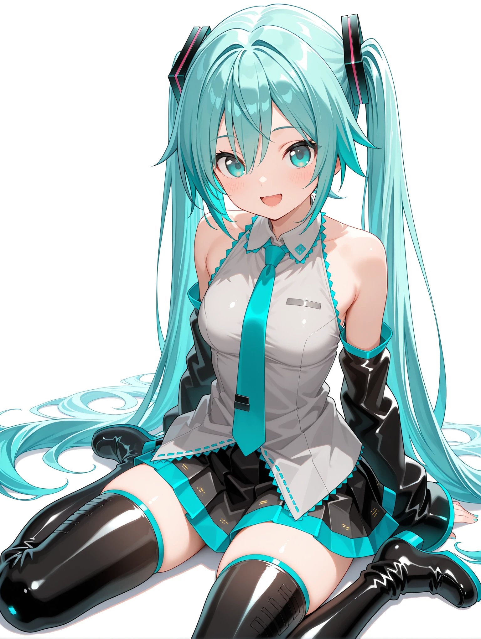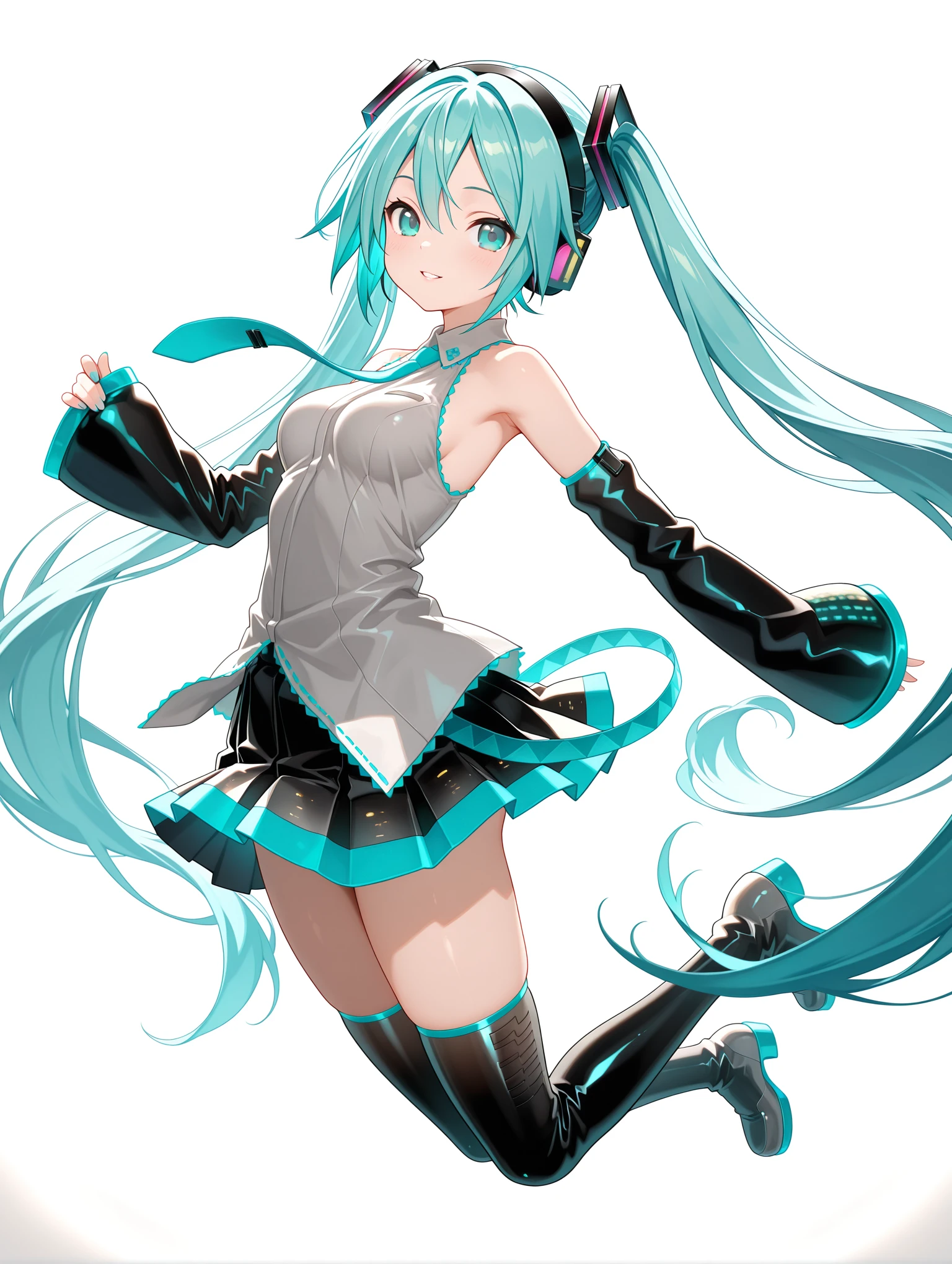 衣装 ・m_clothes,aqua necktie,gray sleeveless shirt,detached sleeves,sleeves past wrists,pleated_skirt,black thigh boots,