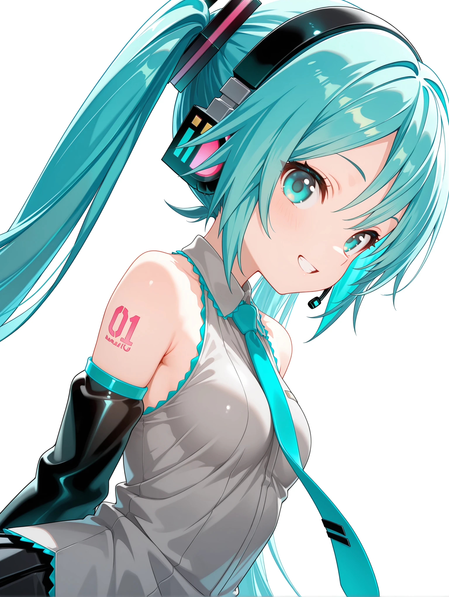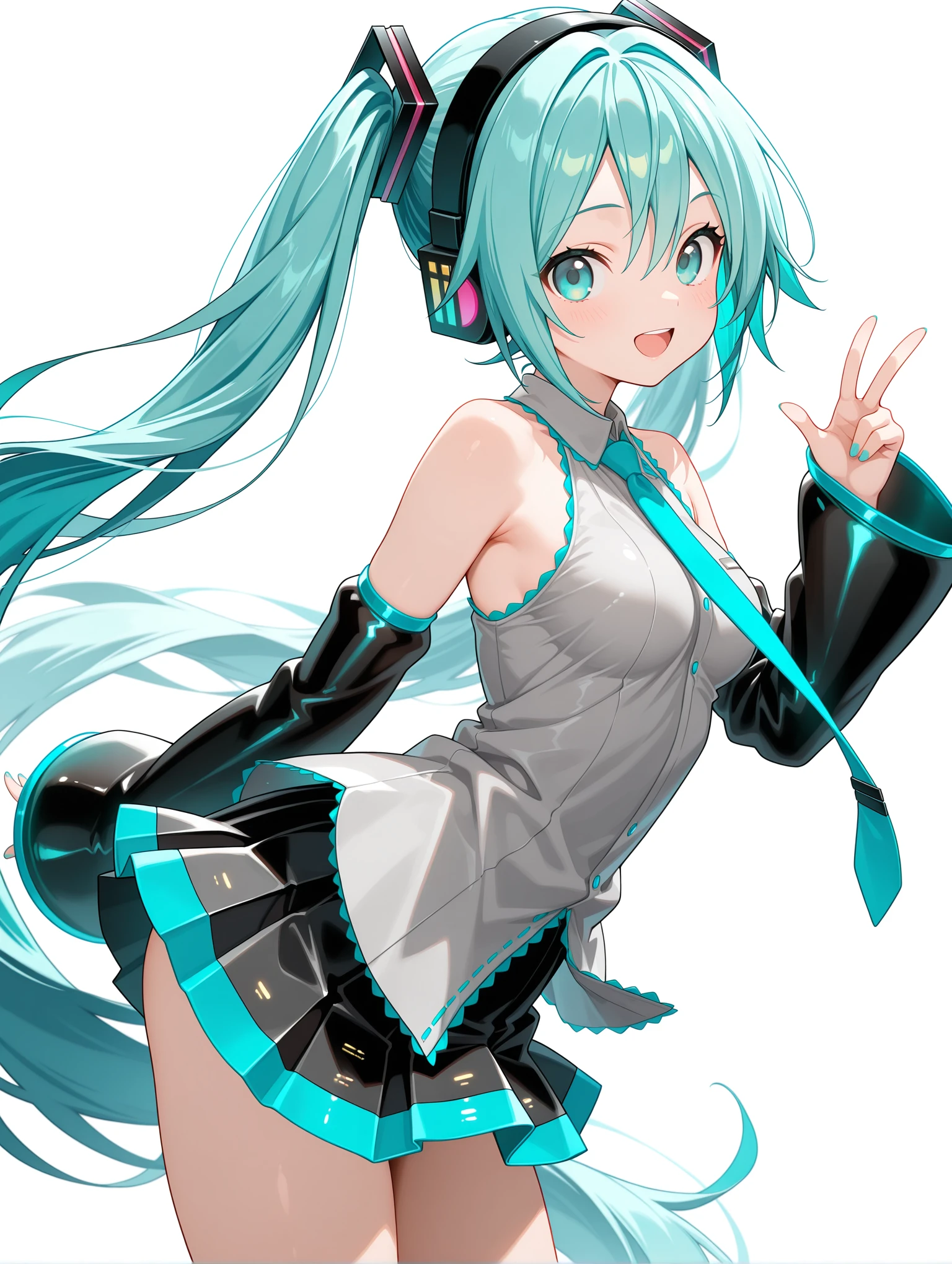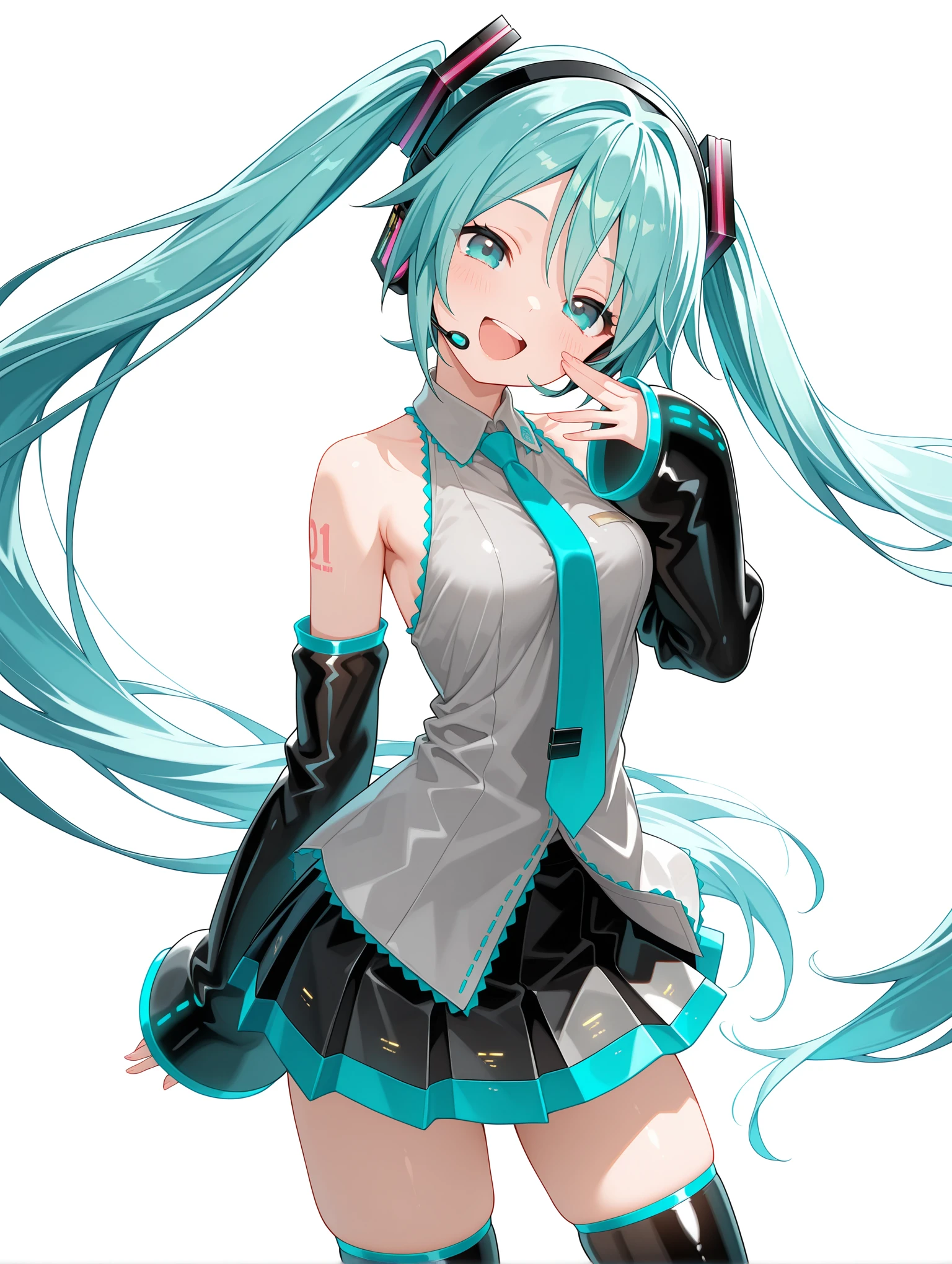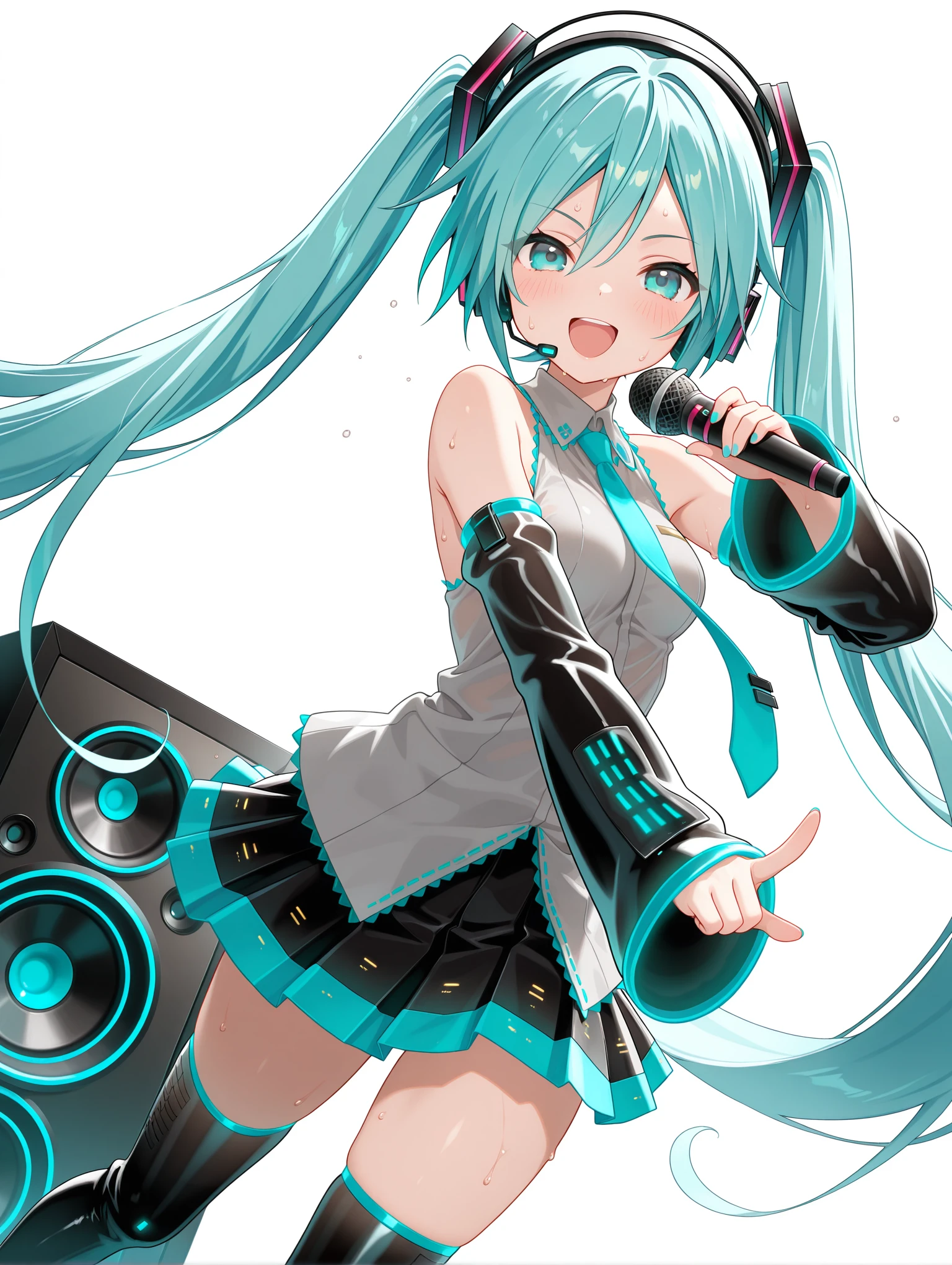 衣装 ・m_clothes,aqua necktie,gray sleeveless shirt,detached sleeves,sleeves past wrists,pleated_skirt,black thigh boots,