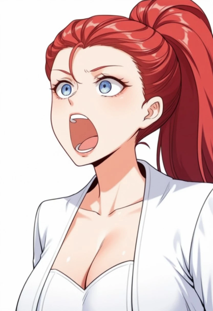 blue eyes, jk, long sleeves, 1girl, solo, breasts, cleavage, red hair open mouth, upper body, white background, long hair,ponytail,big mouth