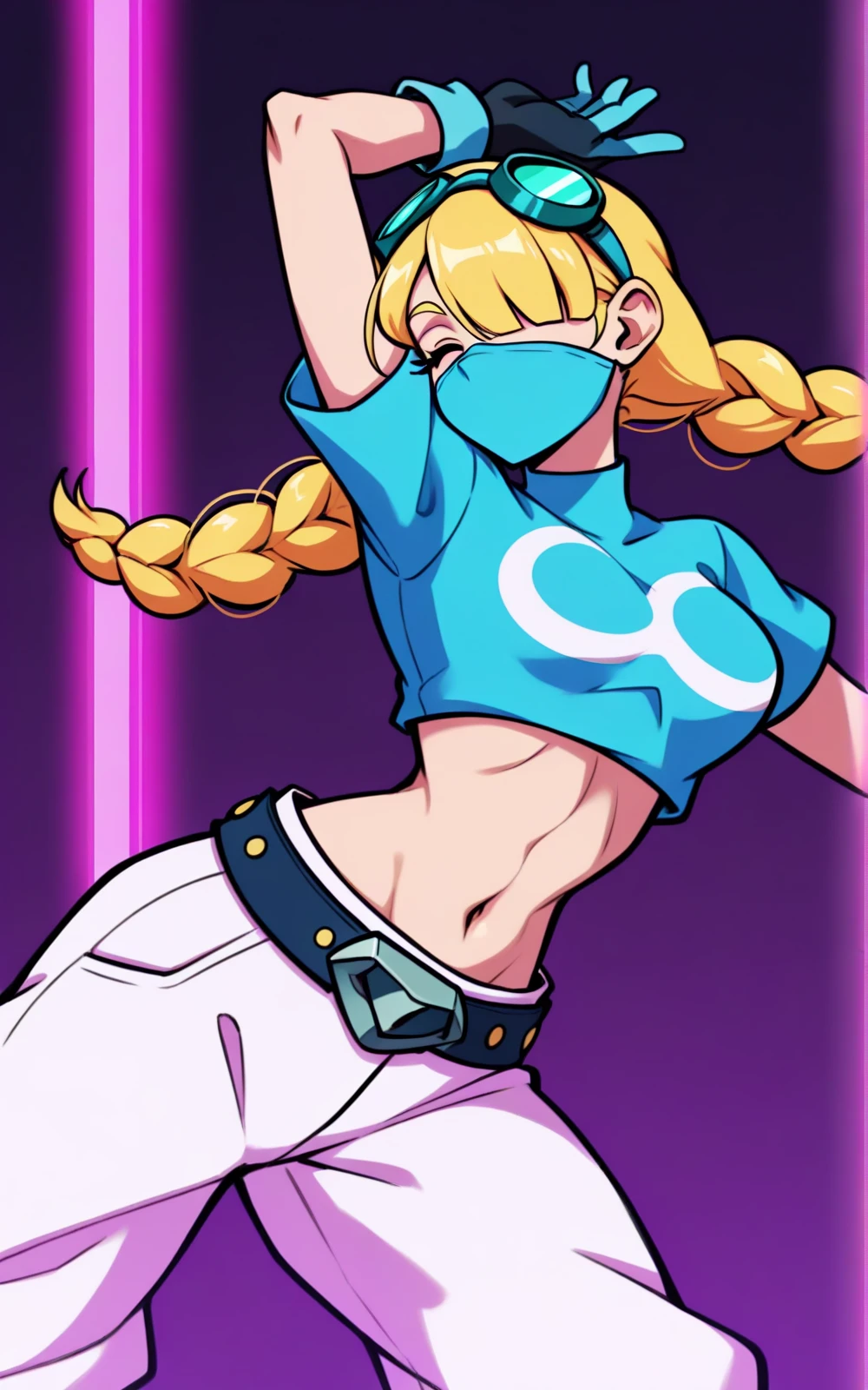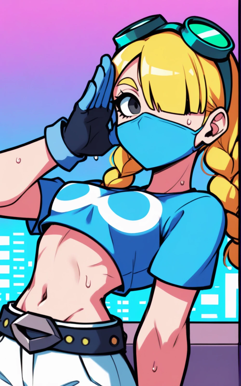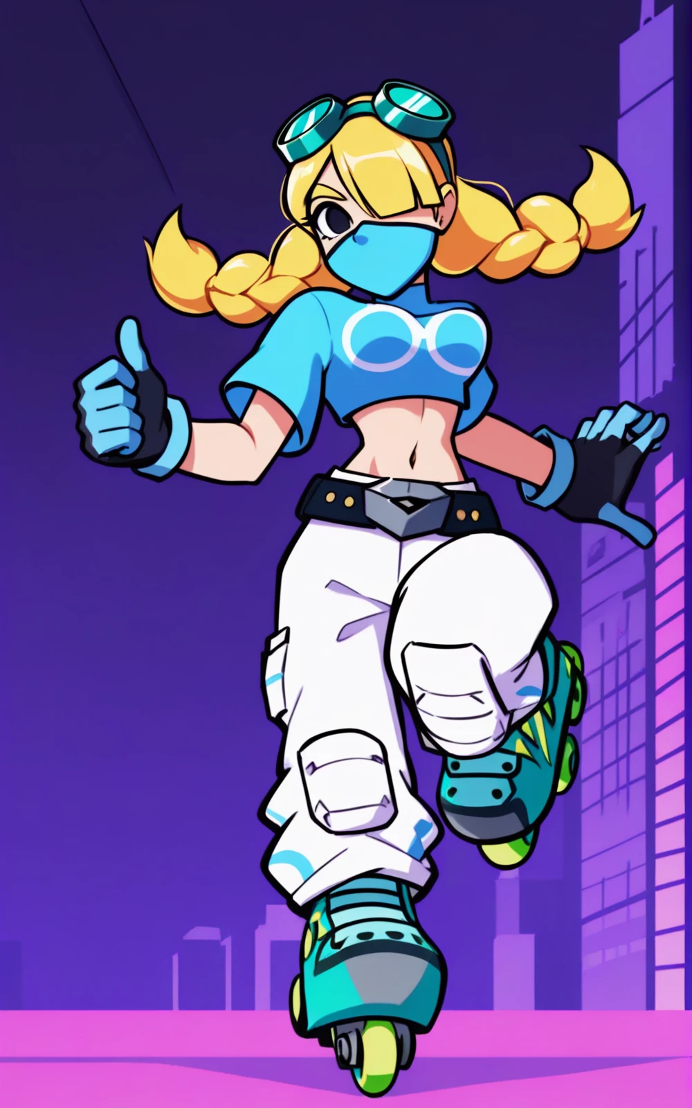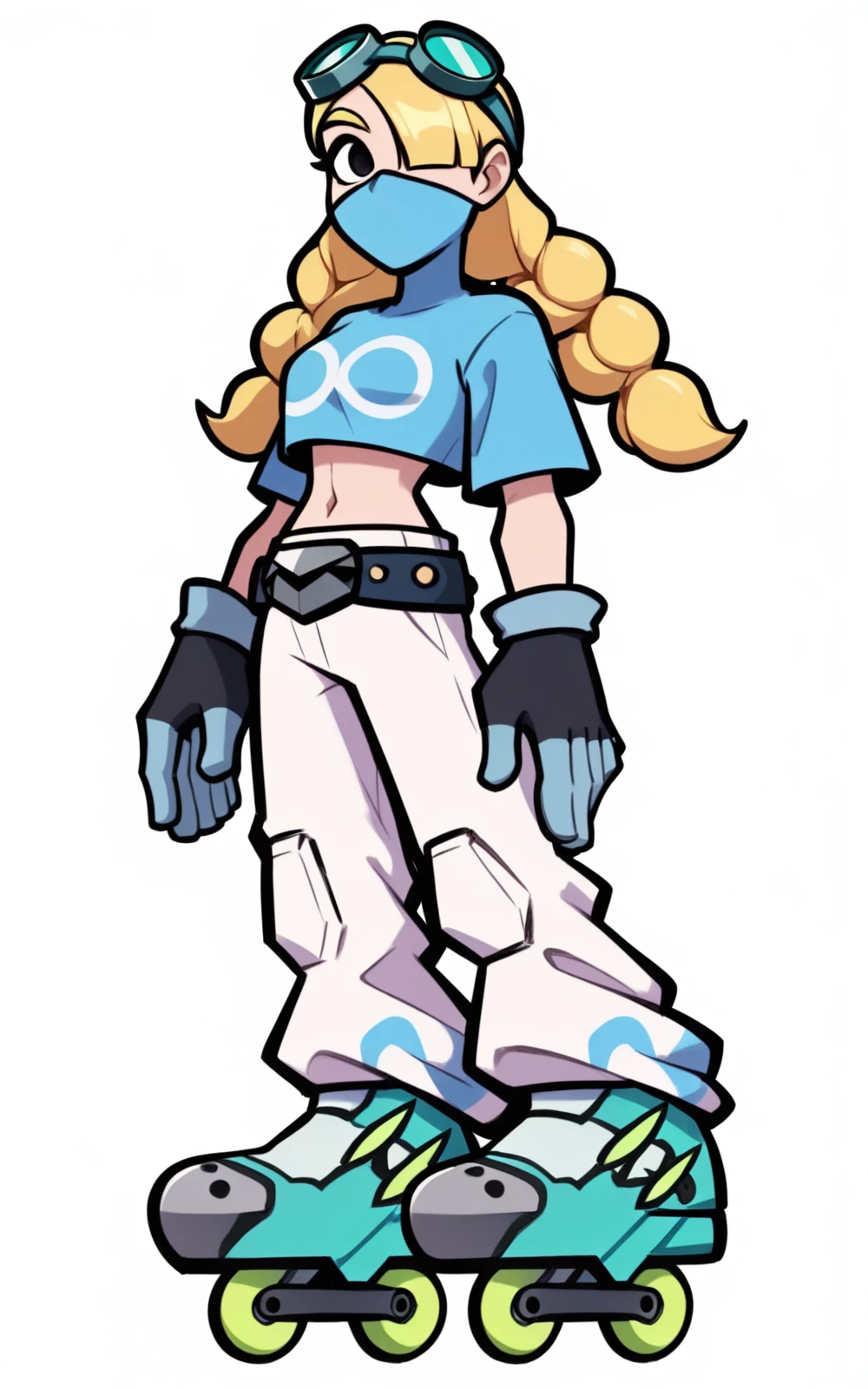 For her Outfit: roller skates, skates, inline skates, belt, gloves, short sleeves, pants, white pants, baggy pants, crop top, blue crop top, mouth mask, goggles, goggles on head