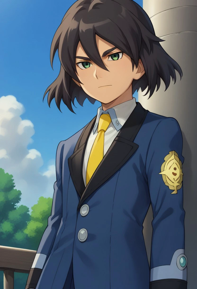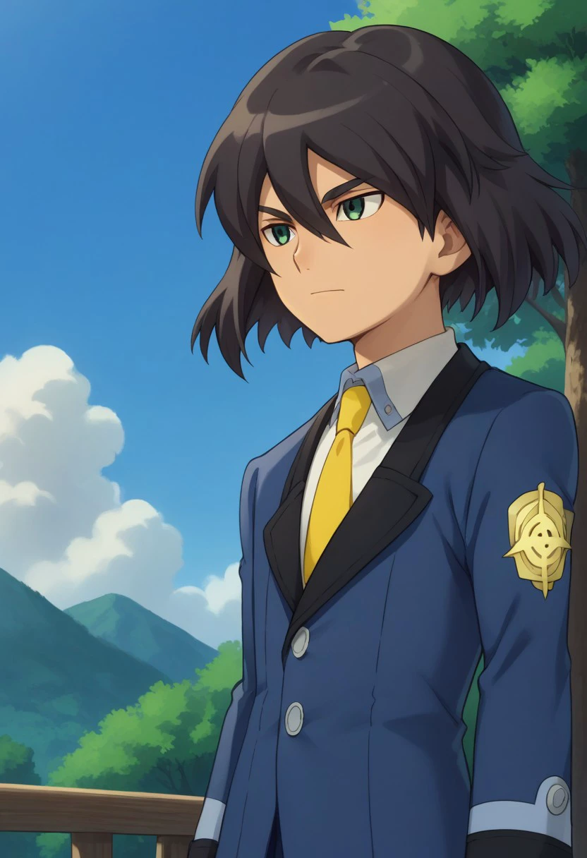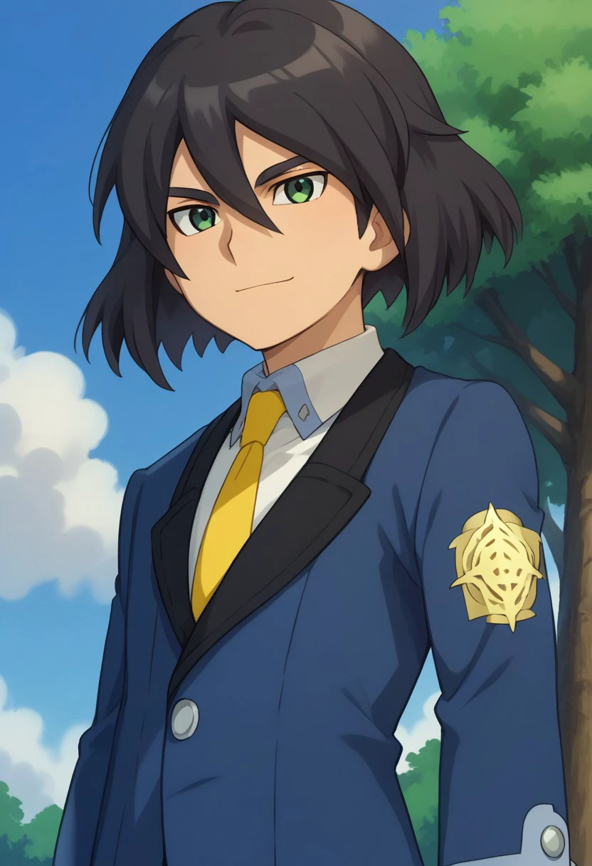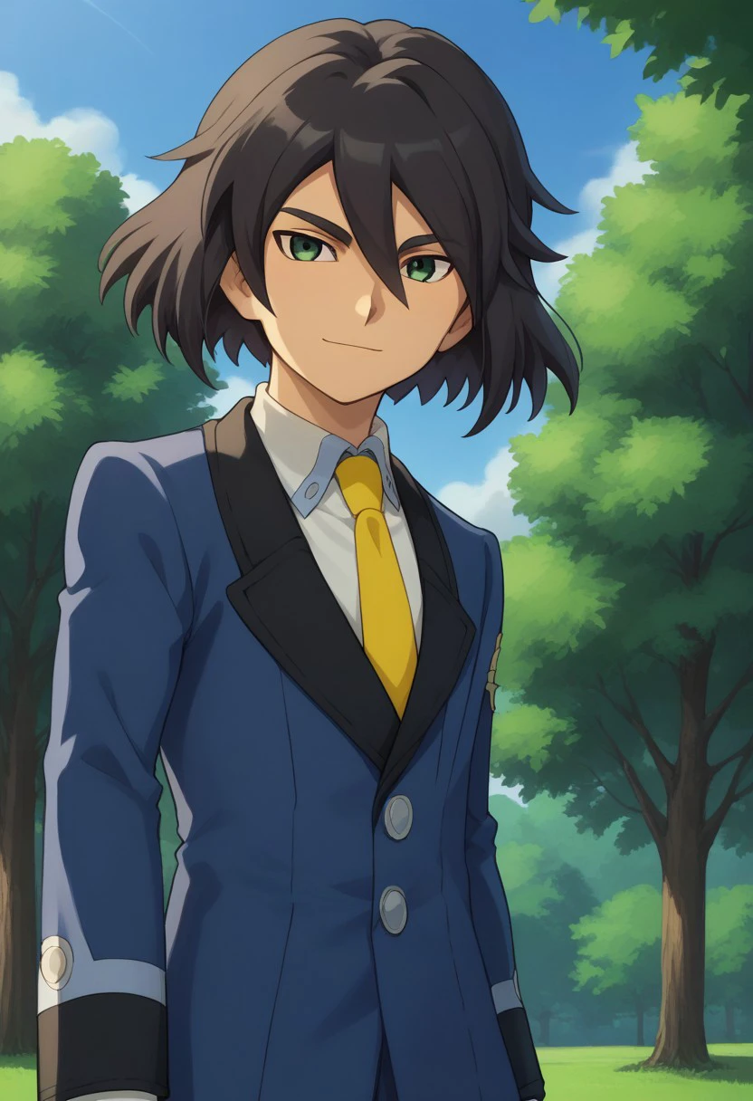 harukizu, 1boy, male focus, solo, black hair, hair between eyes, green eyes, school uniform, jacket, blue jacket, long sleeves, shirt, white shirt, collared shirt, necktie, yellow necktie, pants, blue pants, shoes,