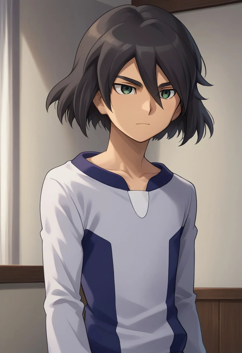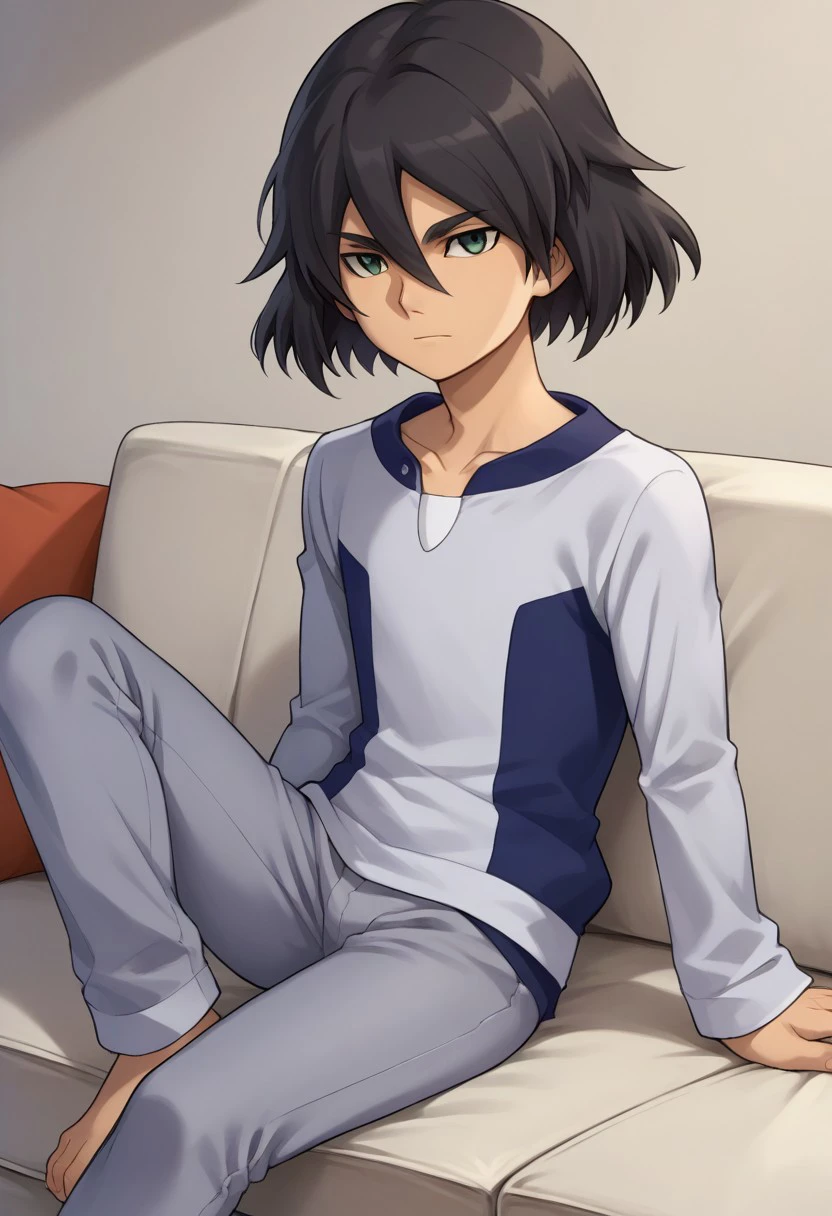 harukizu, 1boy, male focus, solo, black hair, hair between eyes, green eyes, pajama, shirt, grey shirt, long sleeves, pants, grey pants,
