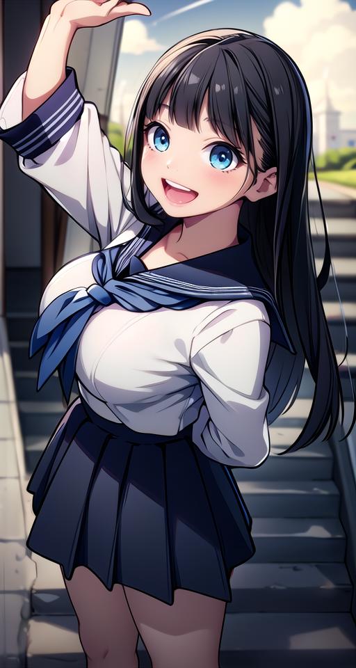 1girl, school uniform, skirt, solo, long hair, blue eyes, serafuku, black hair, sailor collar, shirt, long sleeves, blurry, looking at viewer, bow, blurry background, white shirt, stairs, pleated skirt, black skirt, smile, blue bow, bangs, depth of field, black sailor collar, standing, outdoors, beach, light blue neckerchief, closed mouth, bowtie, blue skirt, <lora:AkebiSailorV1-000008:0.9>, akebisailor,open mouth,