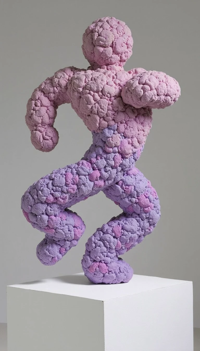 "50ft_5cu7pt, a cyan and orange sculpture of a man dancing, sitting atop a white pedestal"