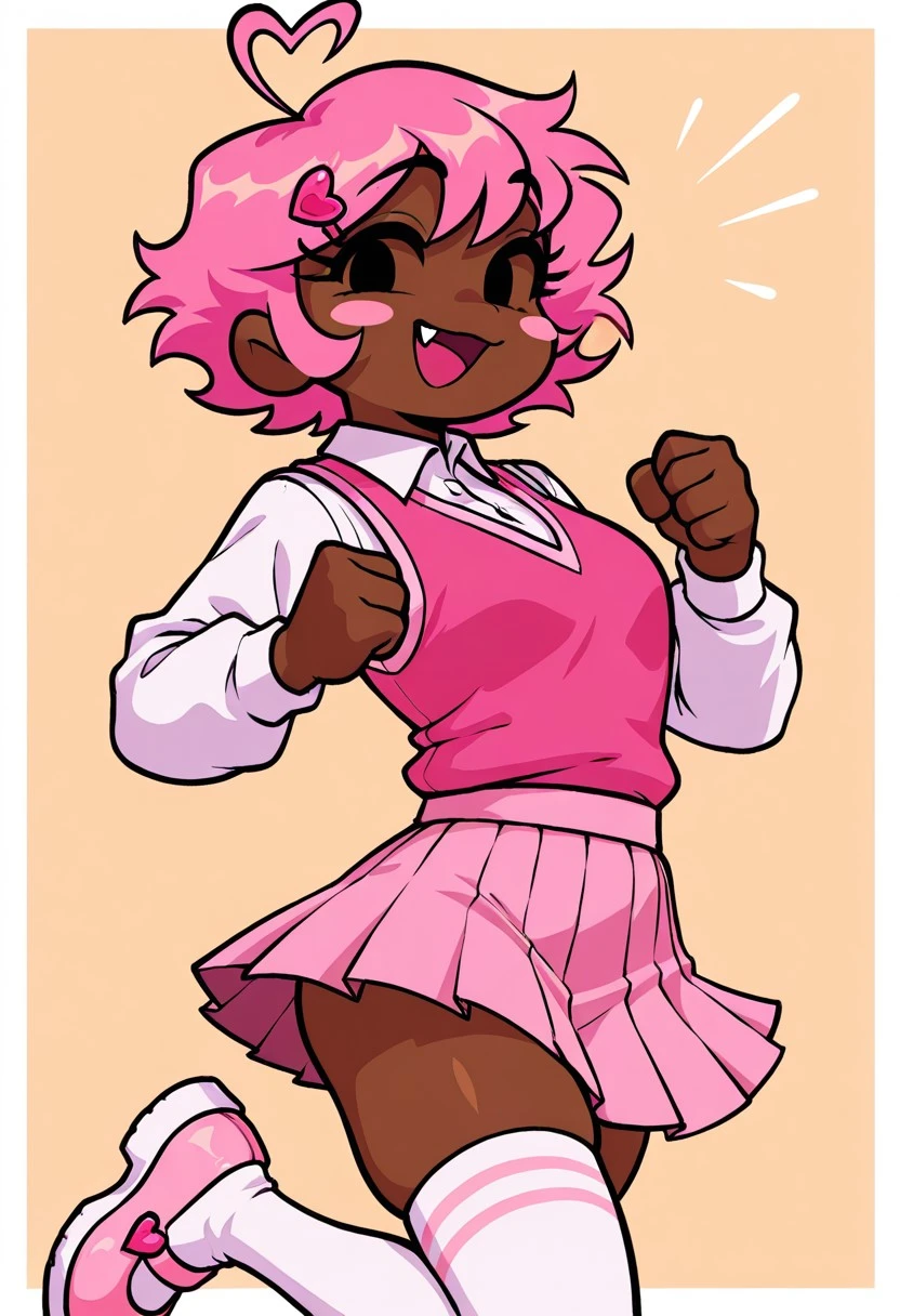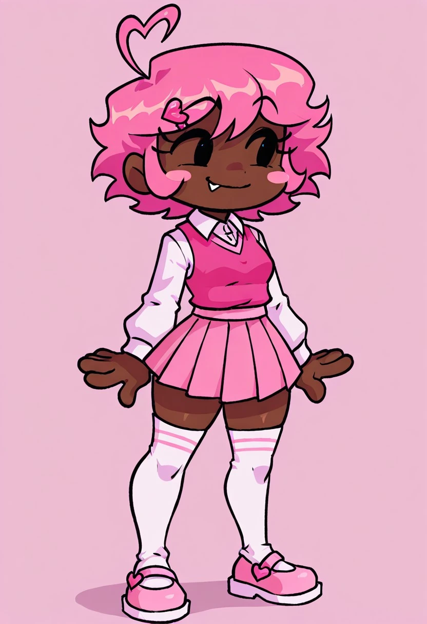 1girl, short pink hair, heart ahoge, dark brown skin, pink blush stickers, black eyes, eyelashes, no sclera, small fangs