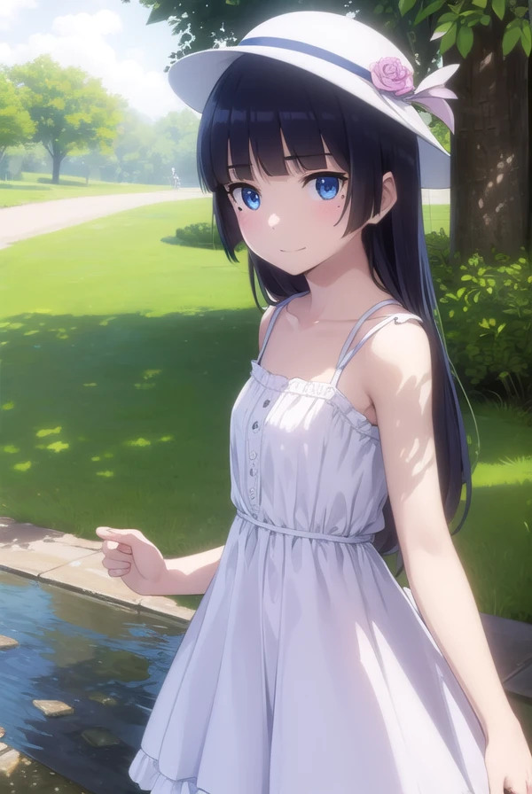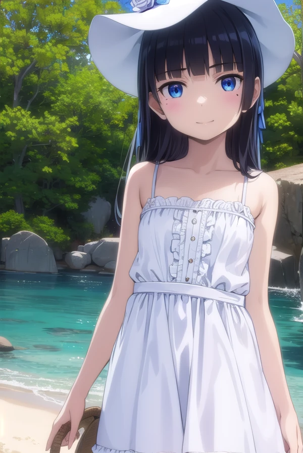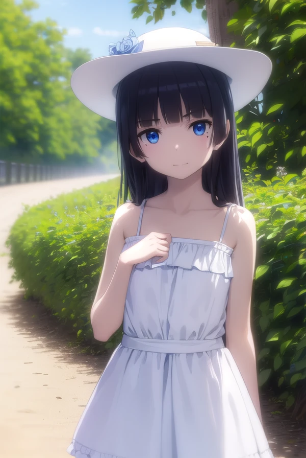 blue eyes, hat, dress, white dress, sun hat, sundress,