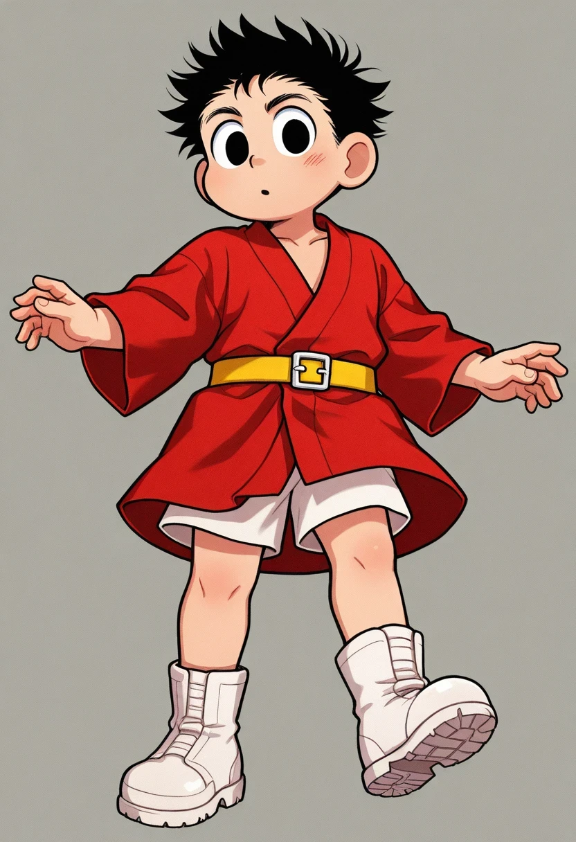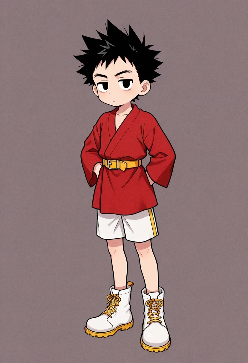 TikaraTDM, 1boy, black spiky hair, fair skin, squinted eyes, black eyes, short, red robe with white accents, yellow belt, white shorts, white boots,
