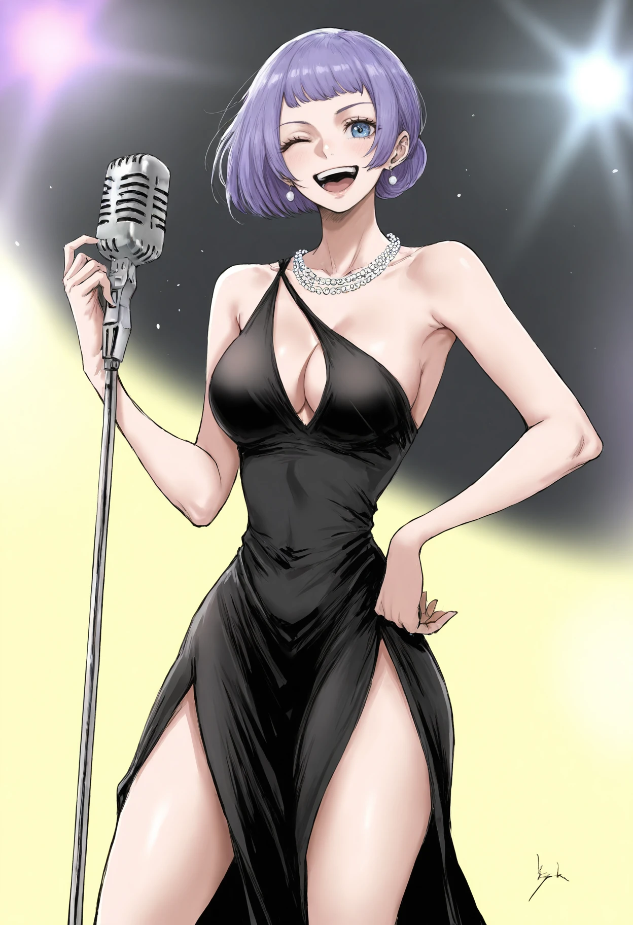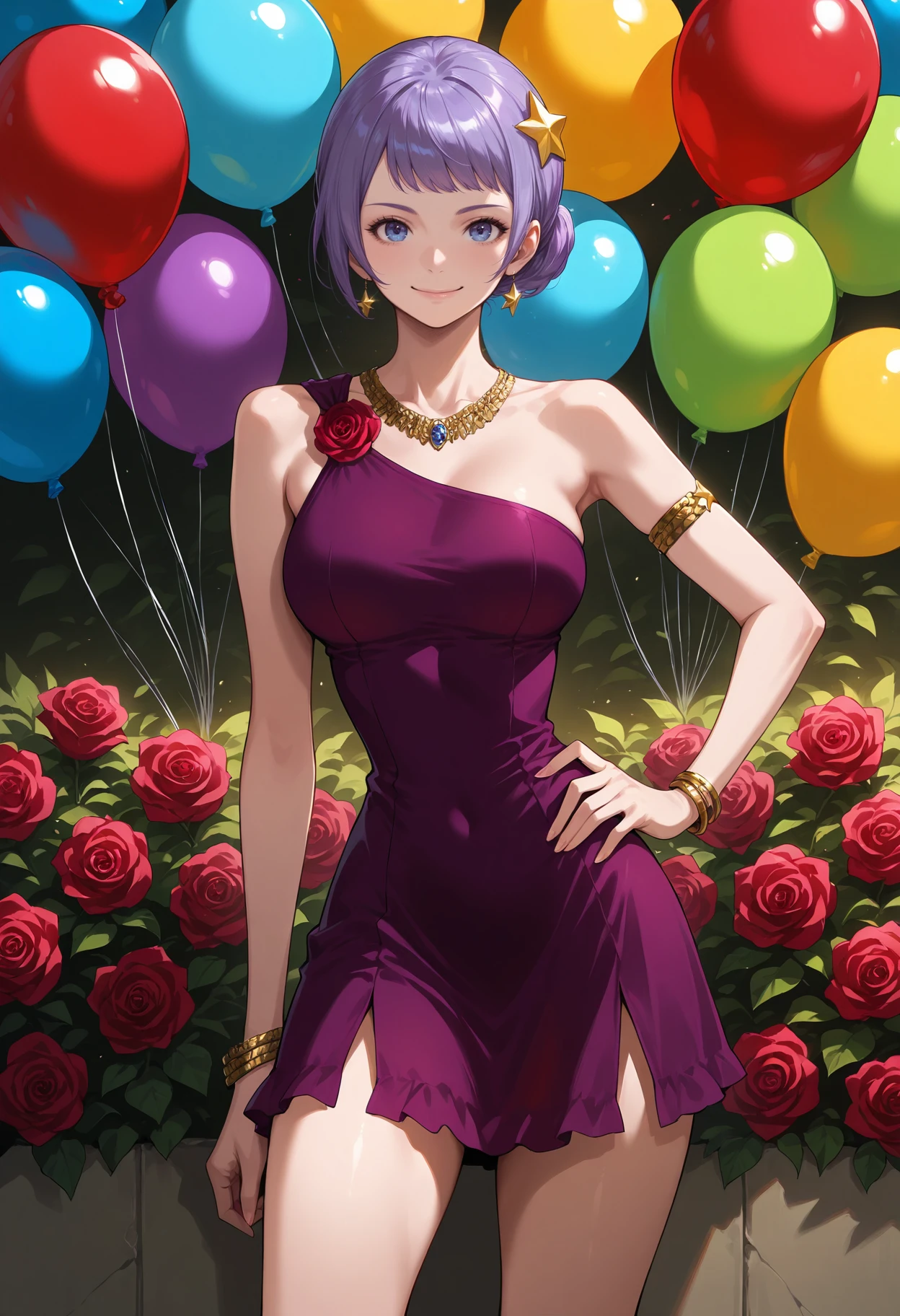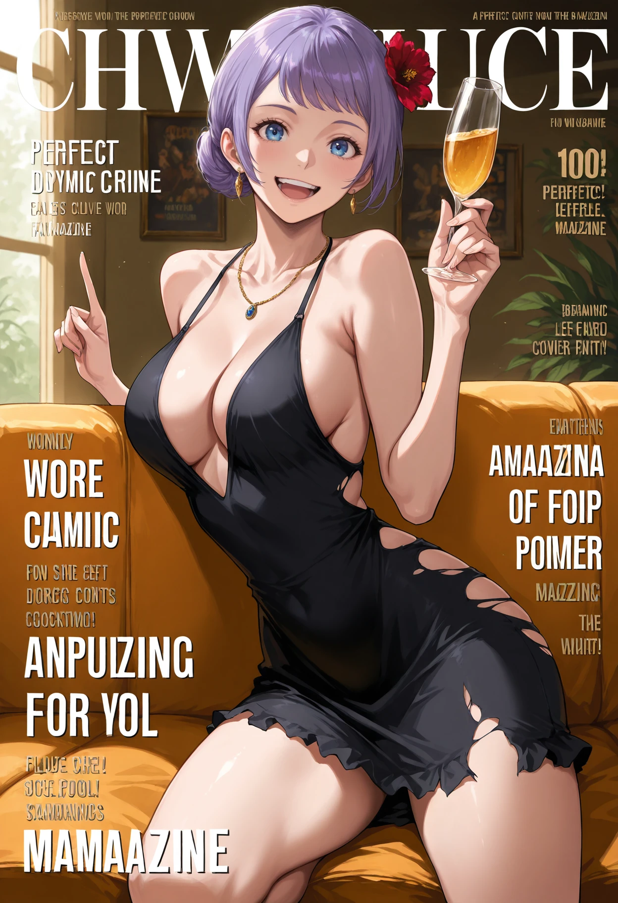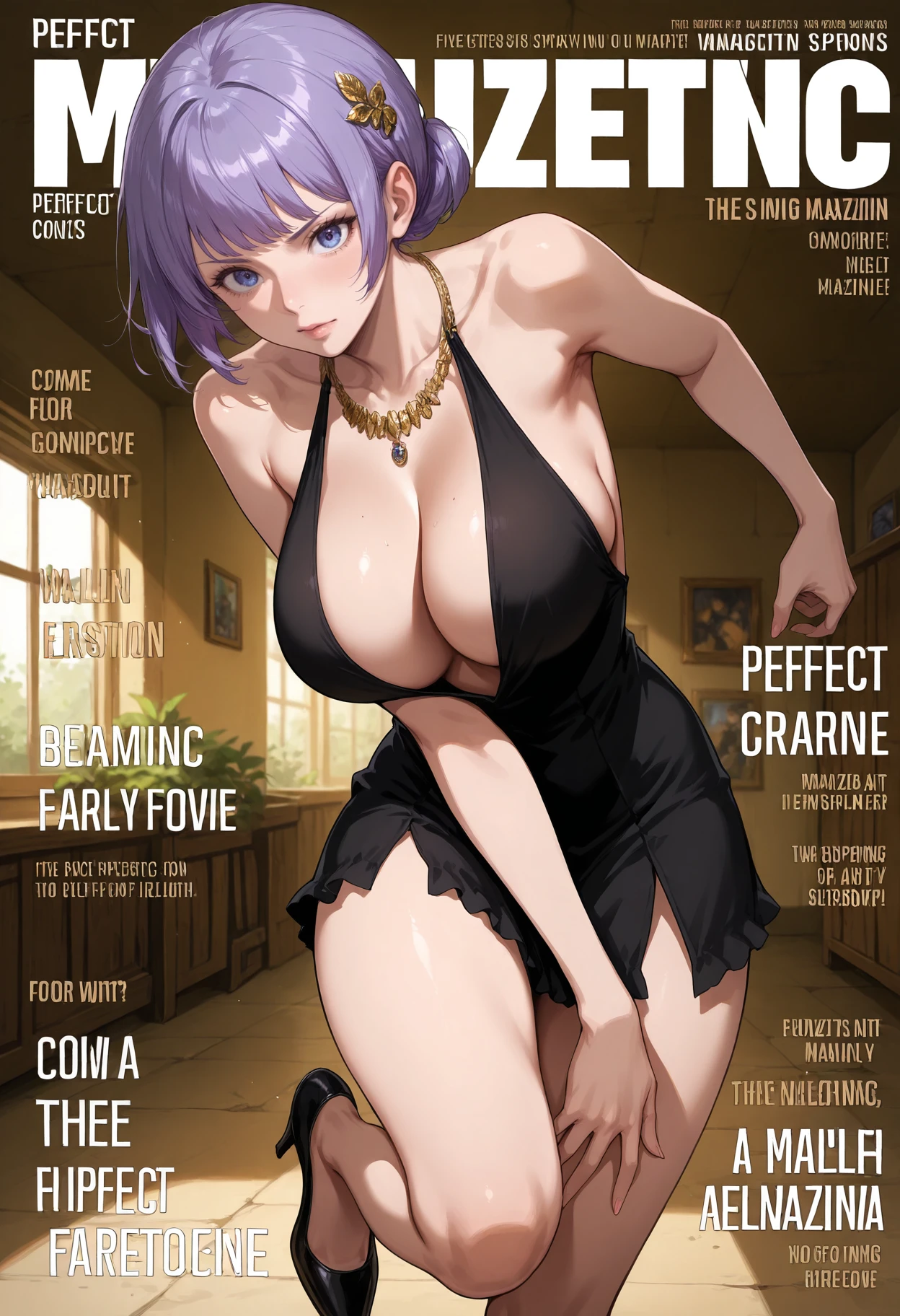 hair ornament,dress,jewelry,high heels,breasts,necklace,large breasts,black dress,bare shoulders,short dress,shoes,bare legs,black footwear