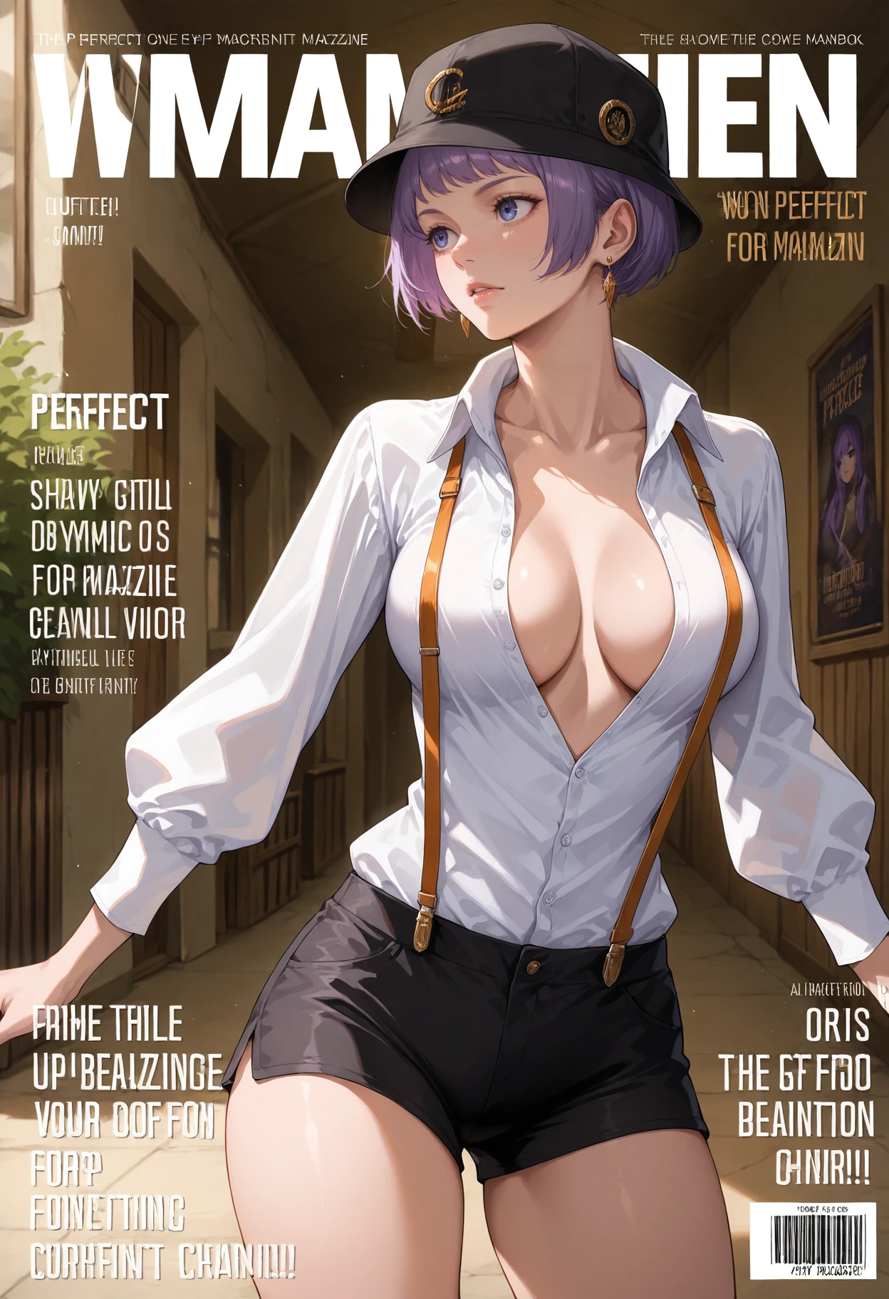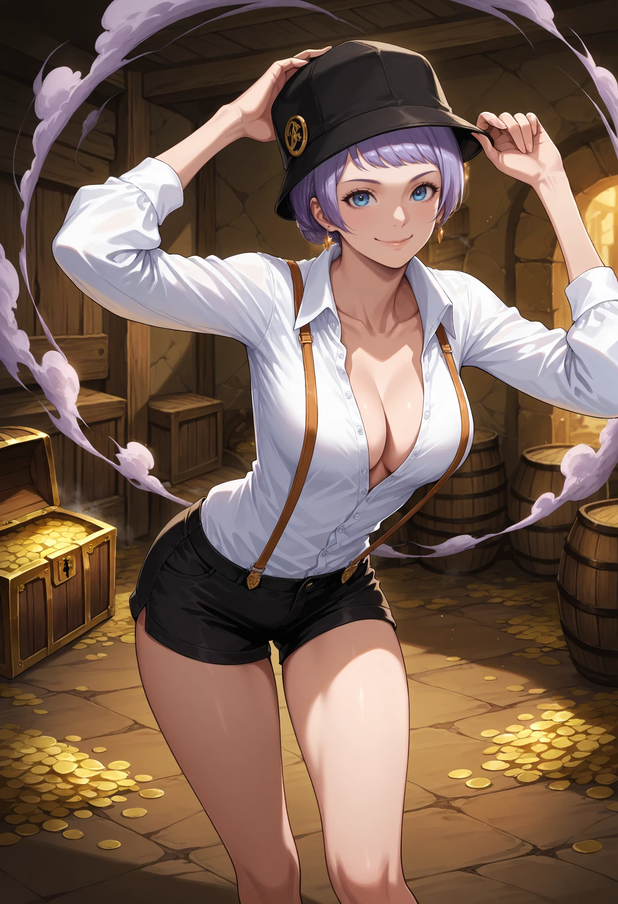 hat,earrings,jewelry,breasts,shirt,suspenders,black shorts,shorts,white shirt,short shorts,open shirt,dress shirt,black headwear,open clothes,collared shirt,unbuttoned,suspender shorts,long sleeves