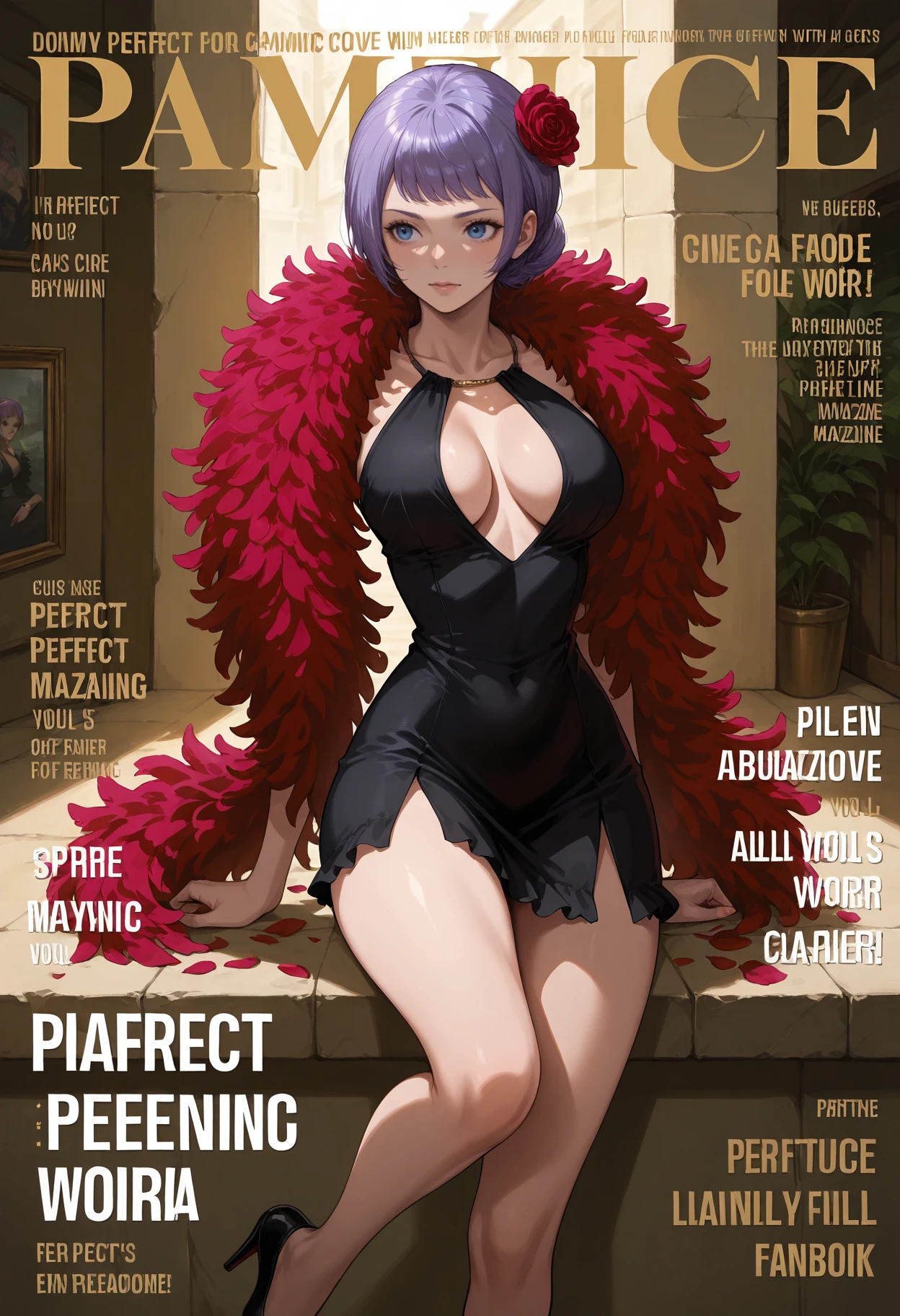 hair flower,hair ornament,dress,feather boa,breasts,black dress,shoes,short dress,medium breasts,large breasts,black footwear,cleavage cutout,bare legs,high heels