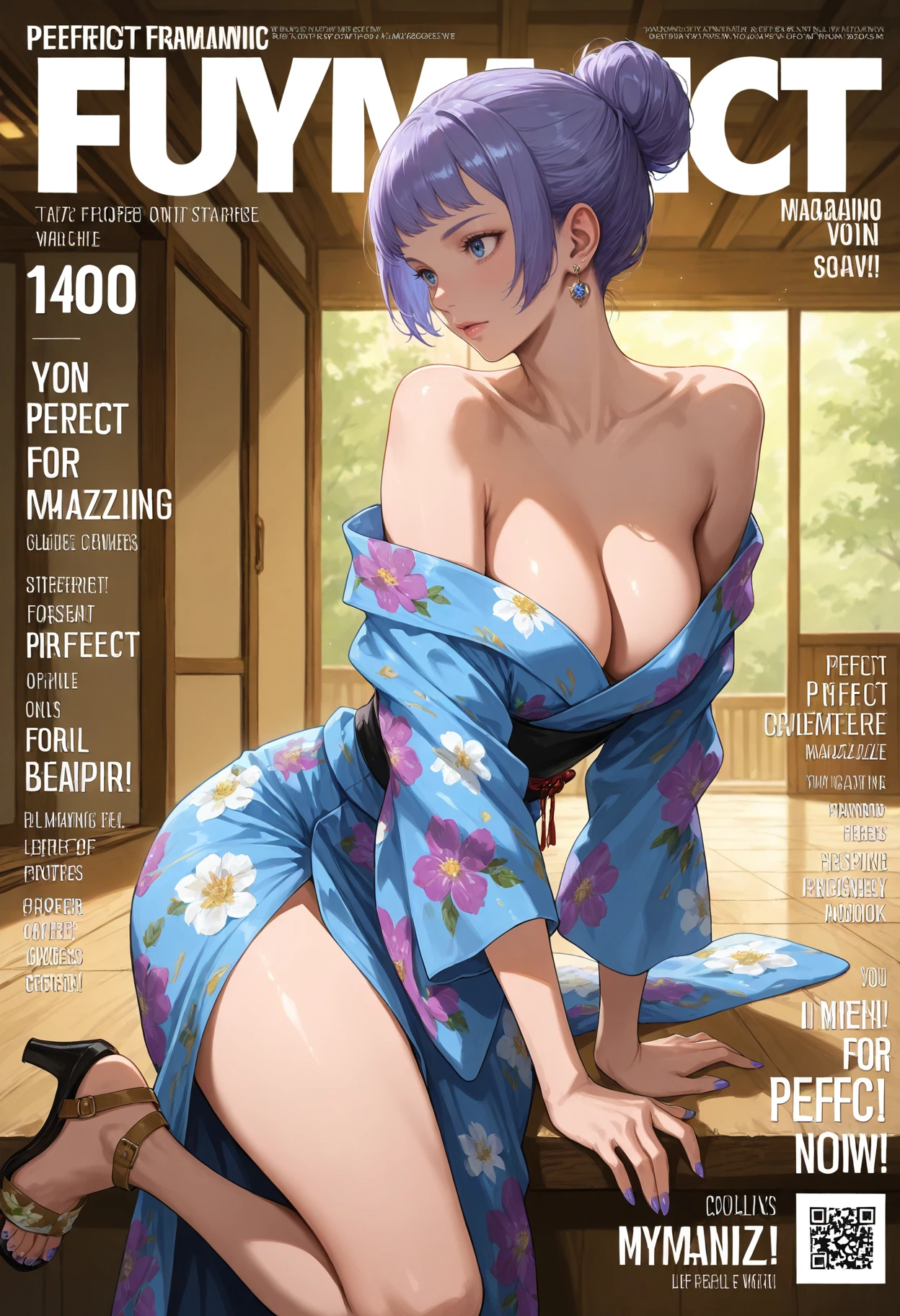 alternate hairstyle,blue hair,hair bun,single hair bun,earrings,sandals,breasts,kimono,japanese clothes,off shoulder,bare shoulders,jewelry,nail polish,dress,shoes,floral print,high heels