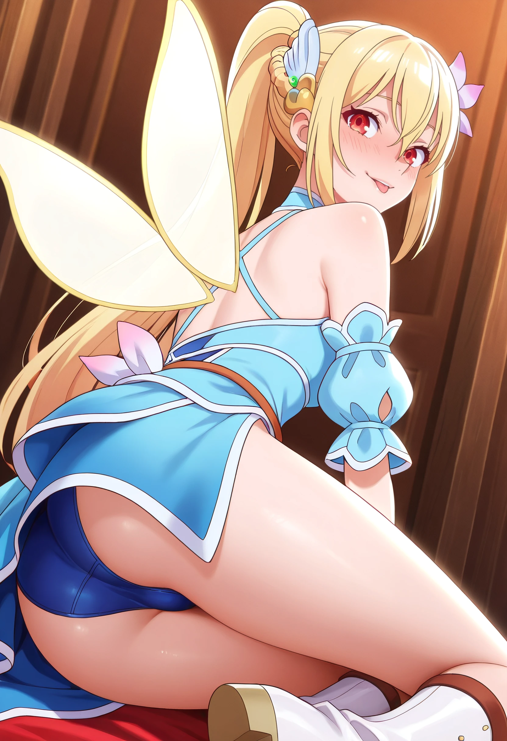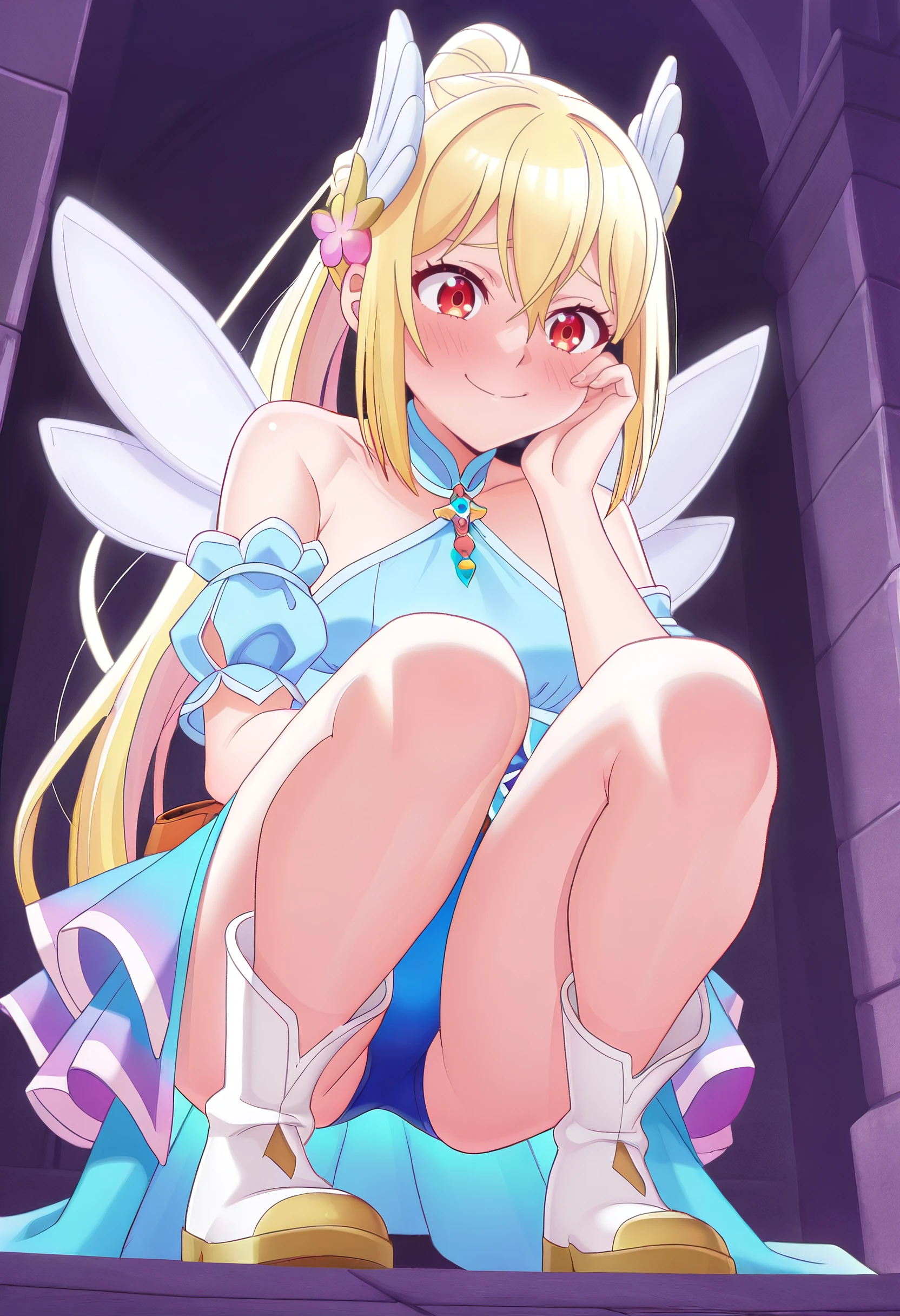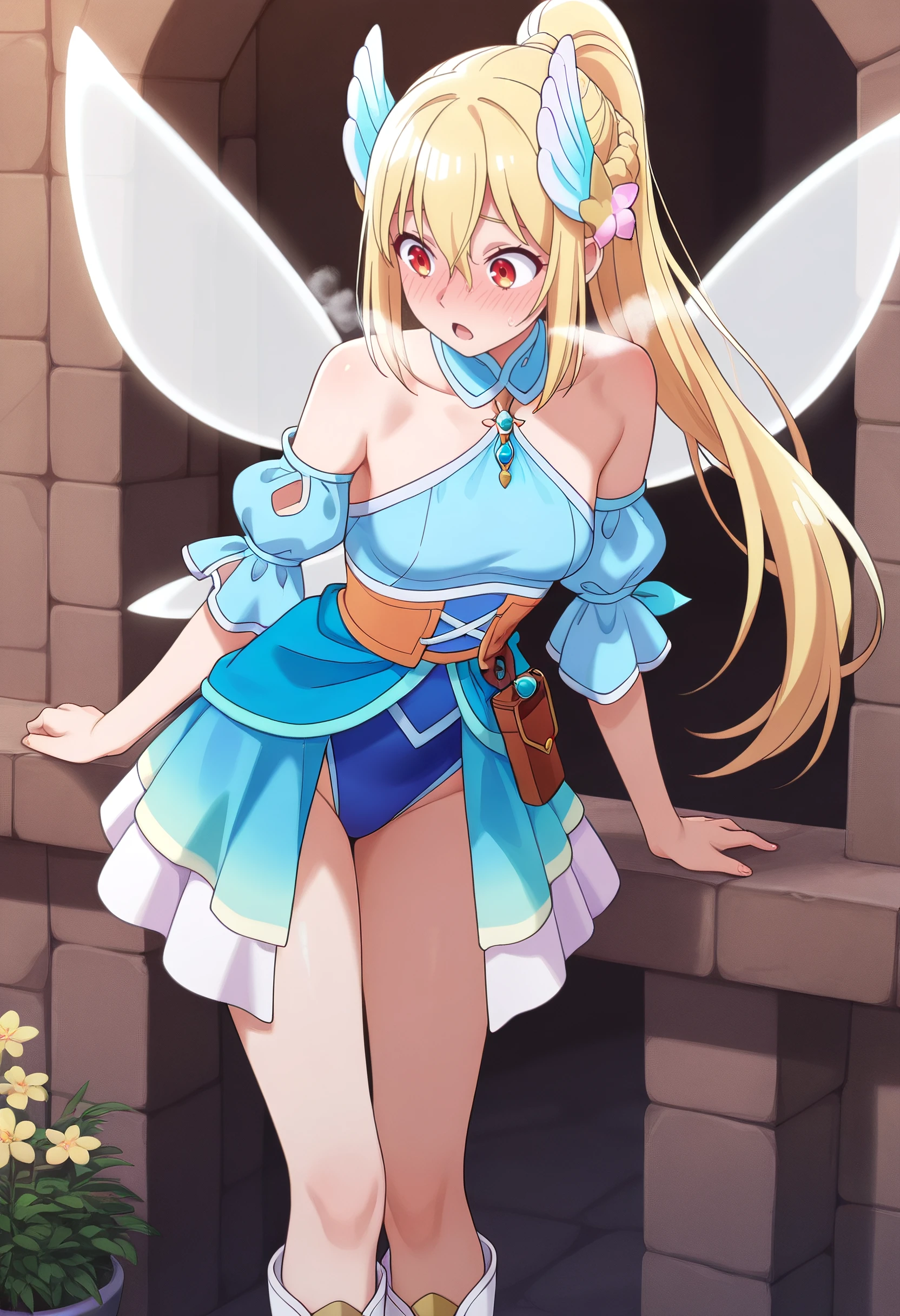 LenaDress, hair ornament, bare shoulders, ponytail, detached sleeves, wing hair ornament, dress, blue dress, wings, leotard, braid, flower, sidelocks, blue leotard, very long hair, blue sleeves, hair flower, showgirl skirt, puffy detached sleeves, crown braid, white footwear, fairy wings, boots, white wings,